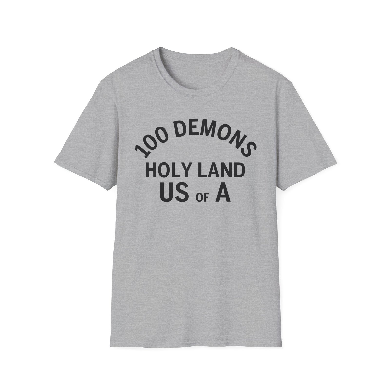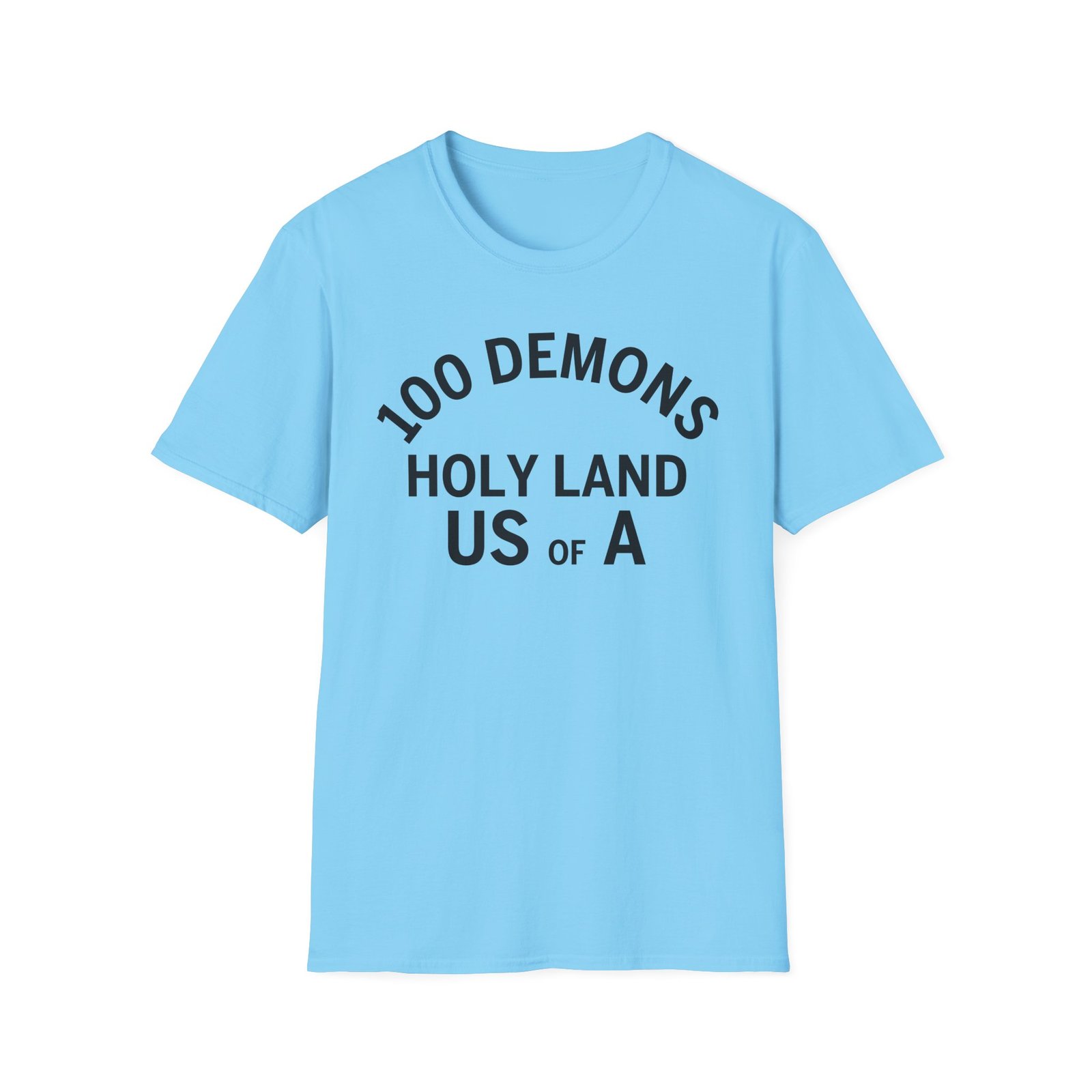 The 100 Demons Holyland unisex soft-style t-shirt puts a new spin on casual comfort. Made from very soft materials, this tee is 100% cotton for solid colors. Heather colors and sports grey include polyester. The shoulders have twill tape for improved durability. There are no side seams. The collar is made with ribbed knitting to prevent curling damage.