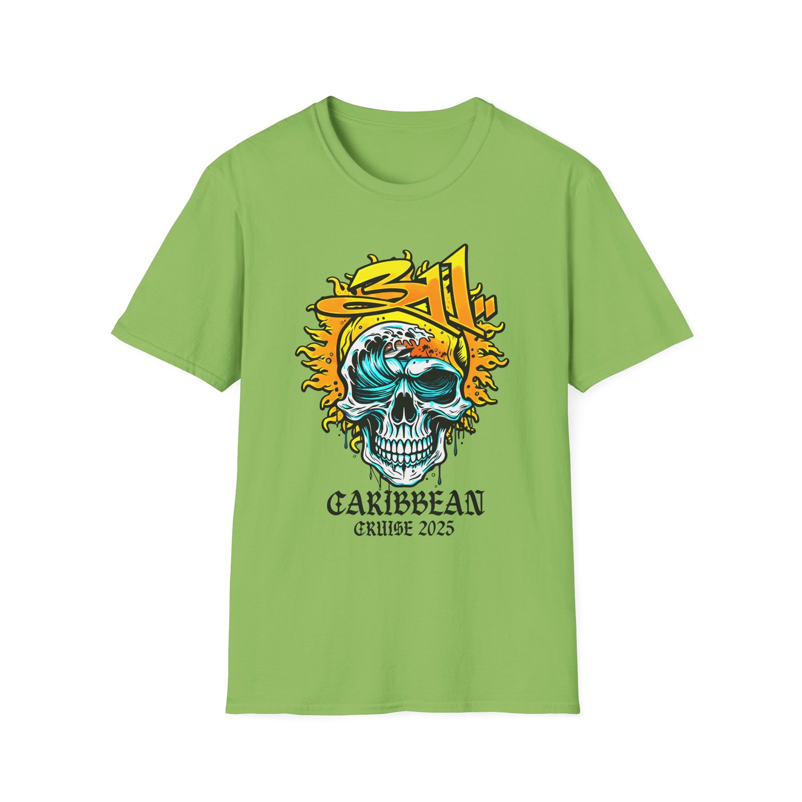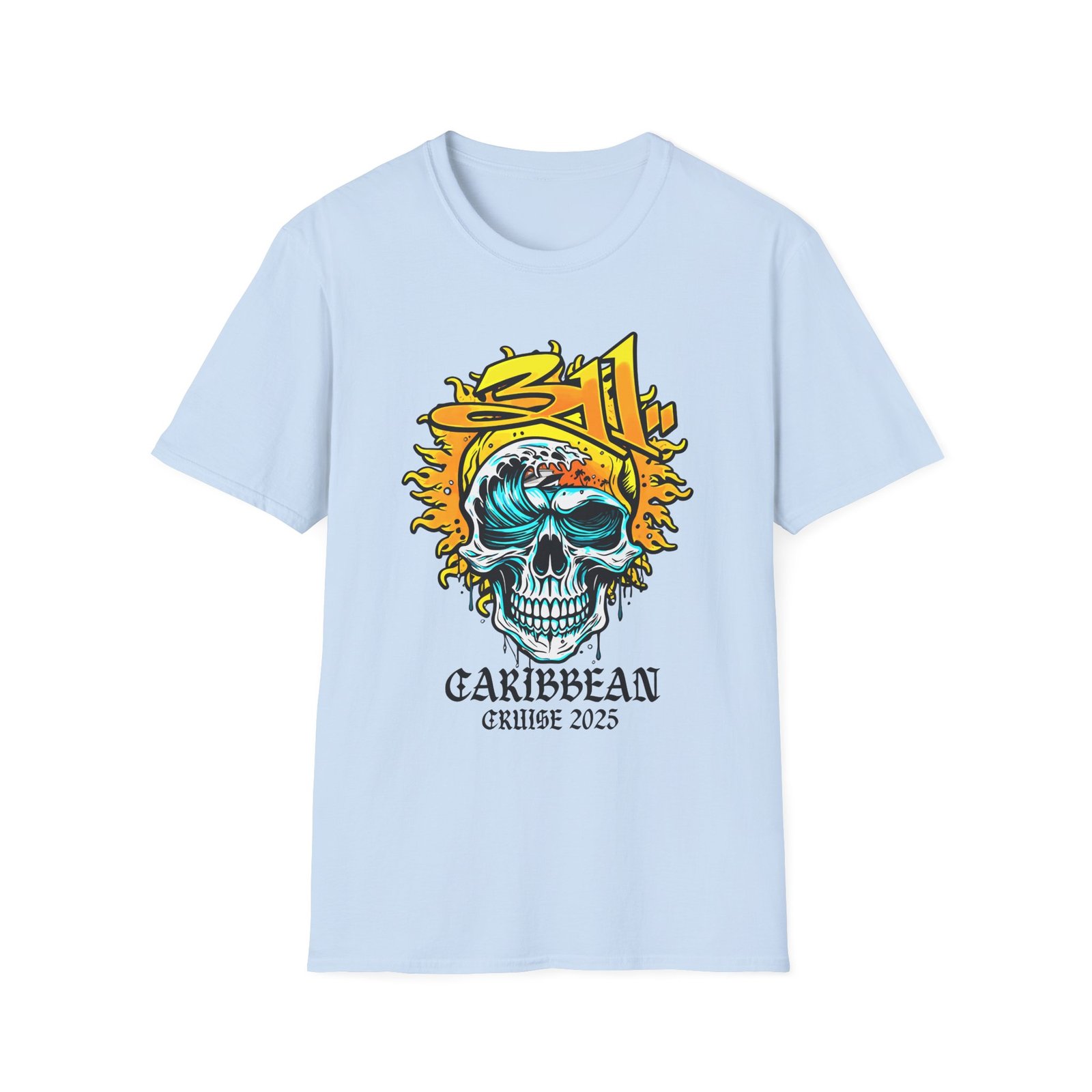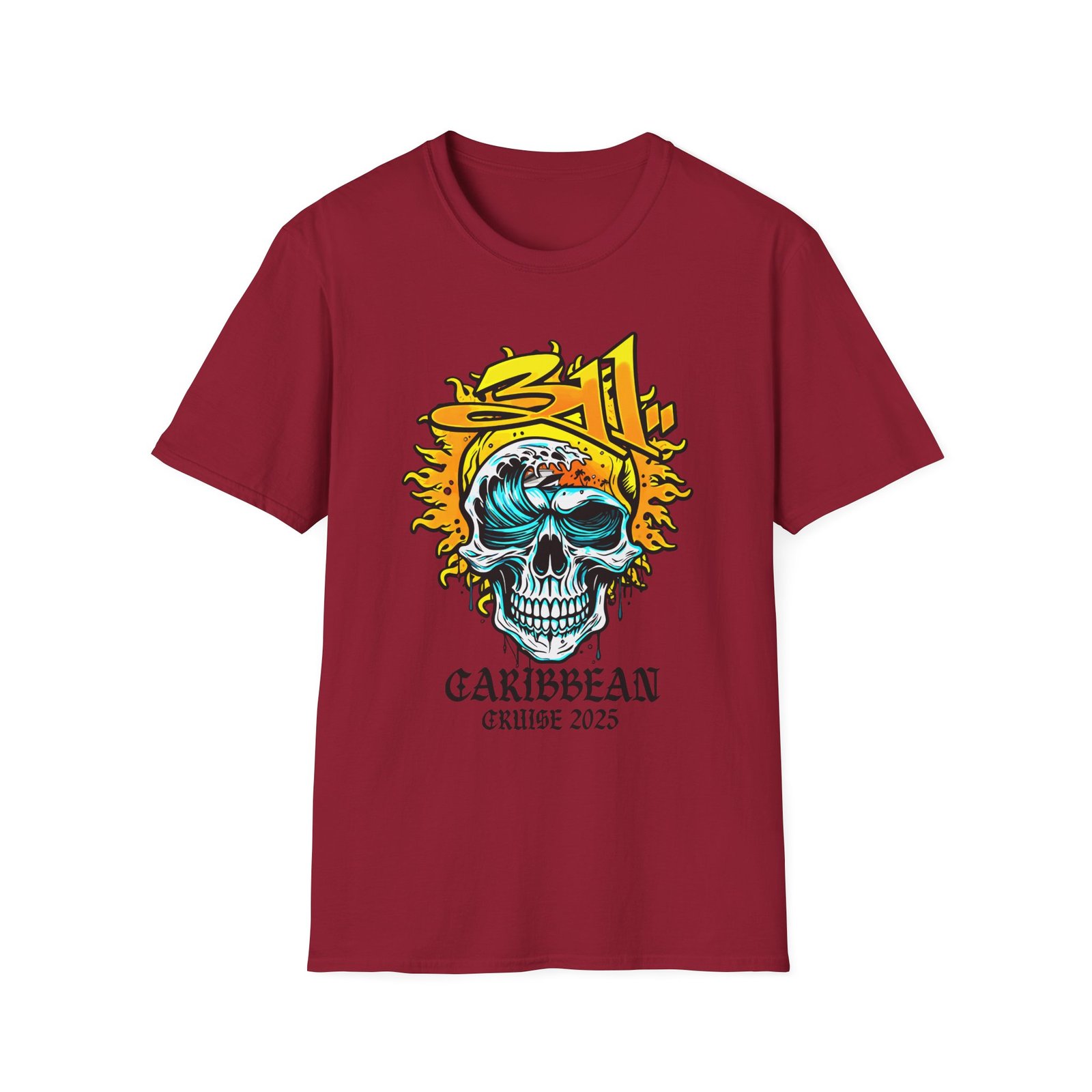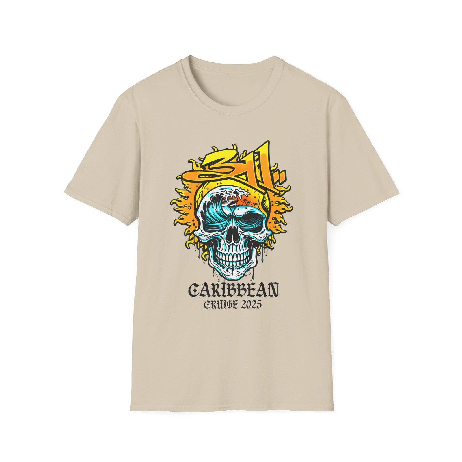 The 311 Caribbean Cruise 2025 Skull unisex soft-style t-shirt puts a new spin on casual comfort. Made from very soft materials, this tee is 100% cotton for solid colors. Heather colors and sports grey include polyester. The shoulders have twill tape for improved durability. There are no side seams. The collar is made with ribbed knitting to prevent curling damage.