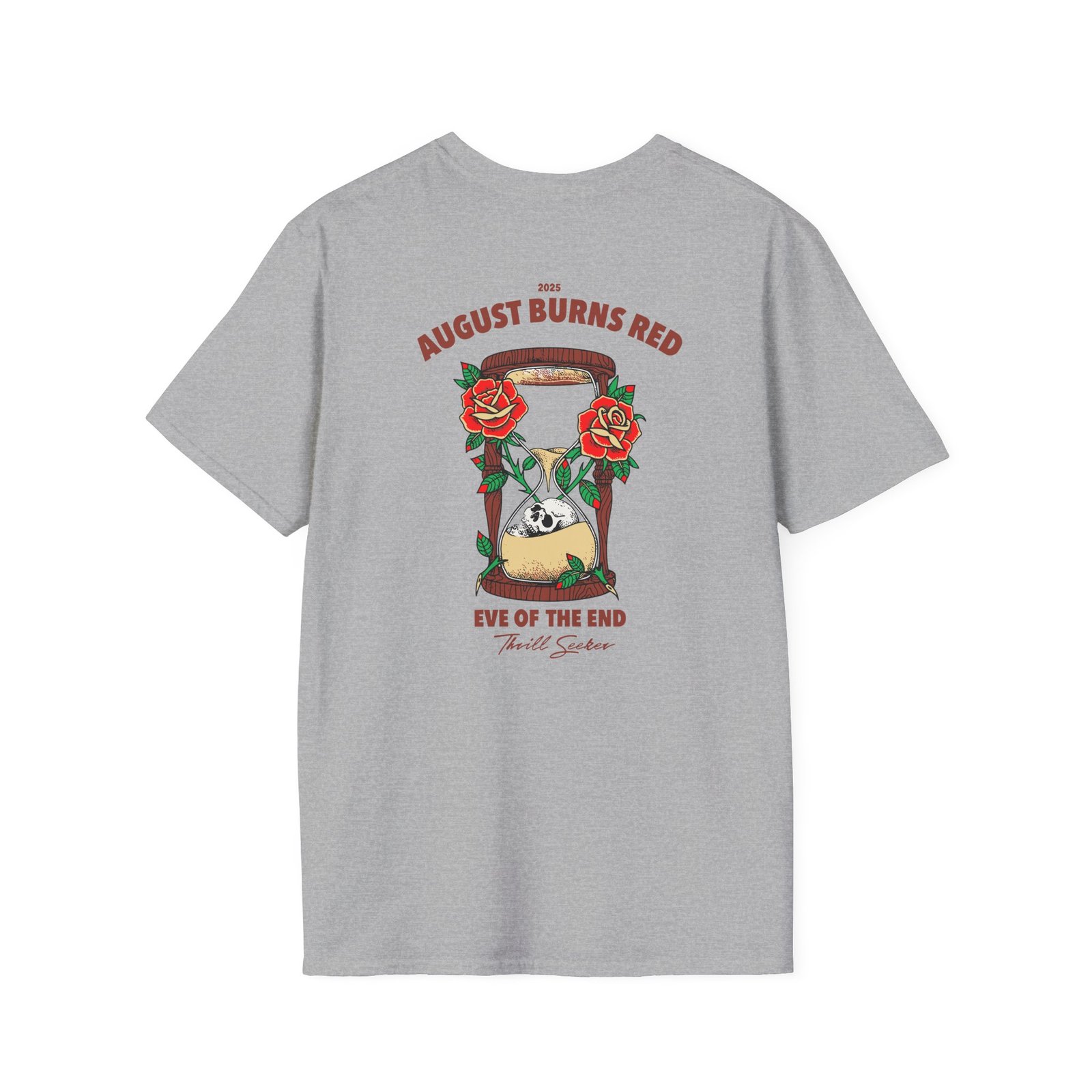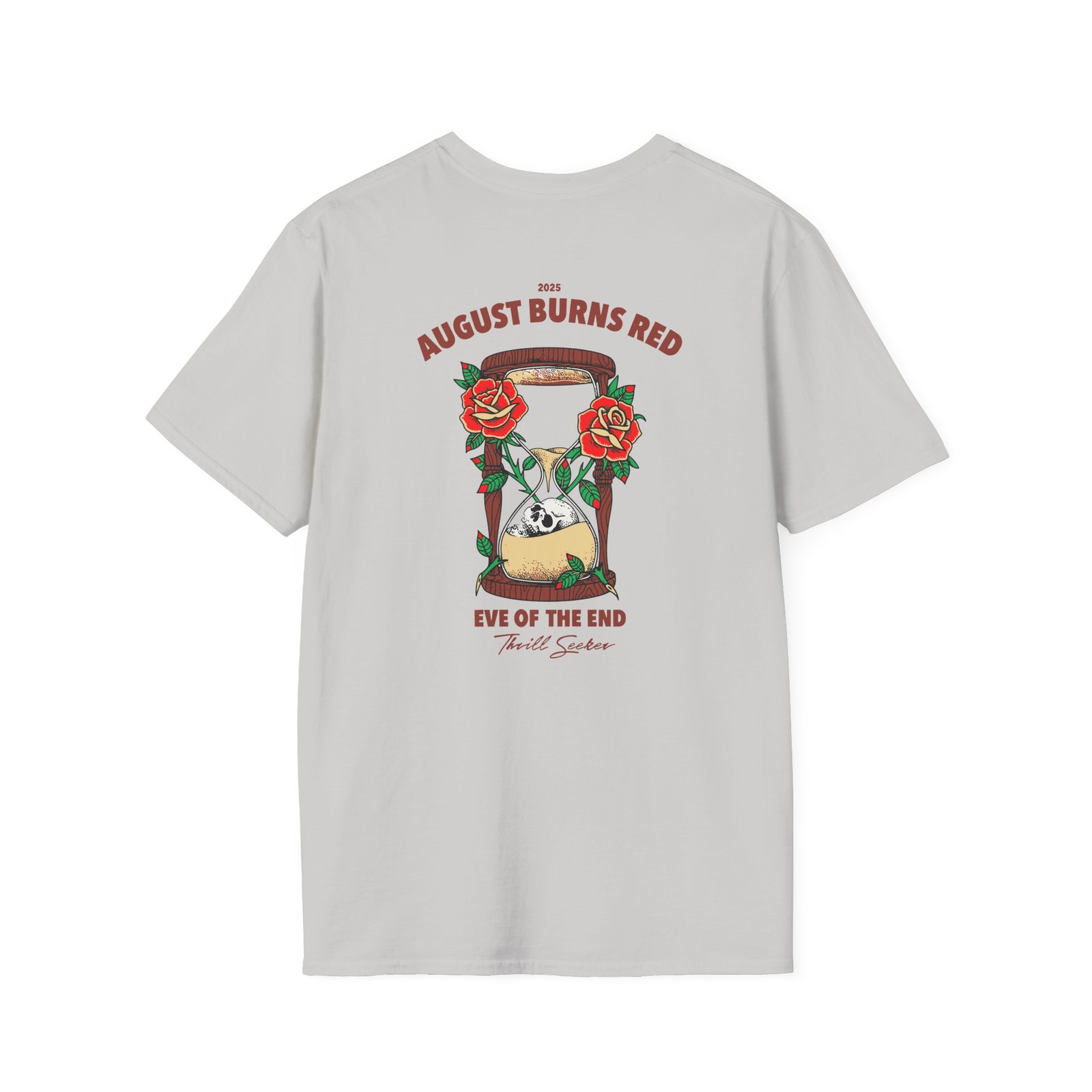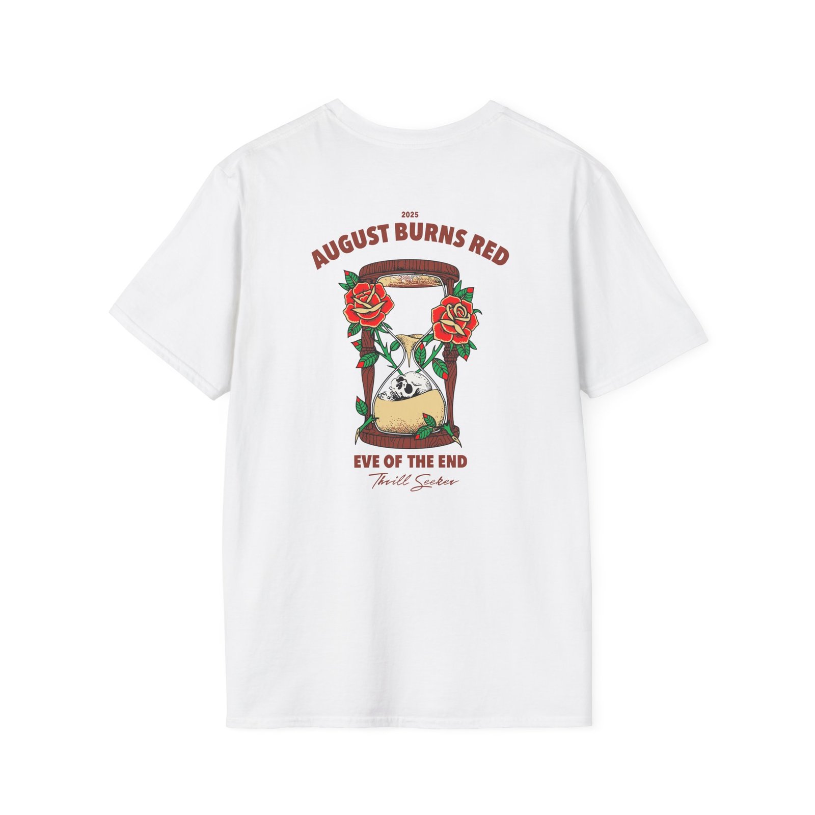 The August Burns Red Eve of the End unisex soft-style t-shirt puts a new spin on casual comfort. Made from very soft materials, this tee is 100% cotton for solid colors. Heather colors and sports grey include polyester. The shoulders have twill tape for improved durability. There are no side seams. The collar is made with ribbed knitting to prevent curling damage.