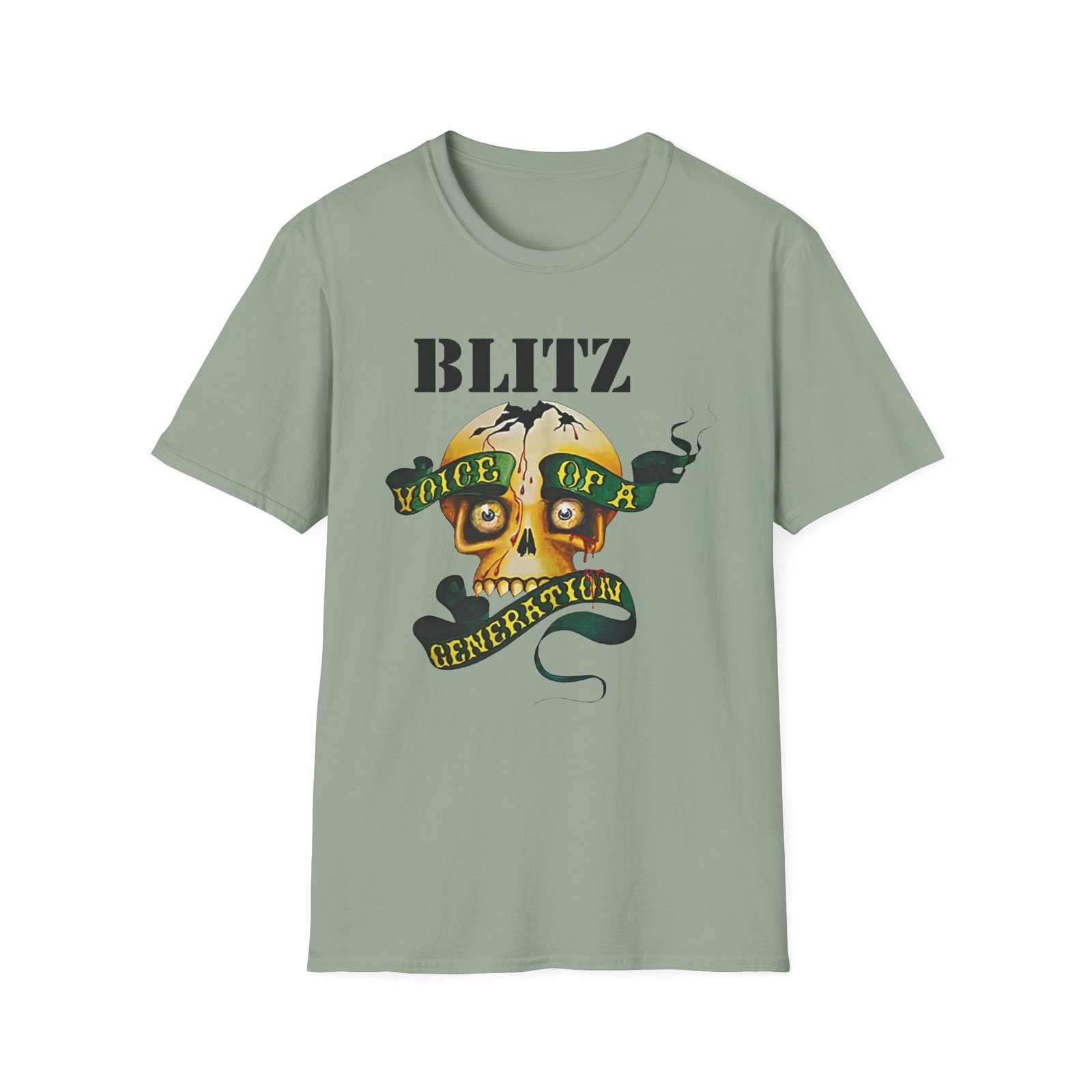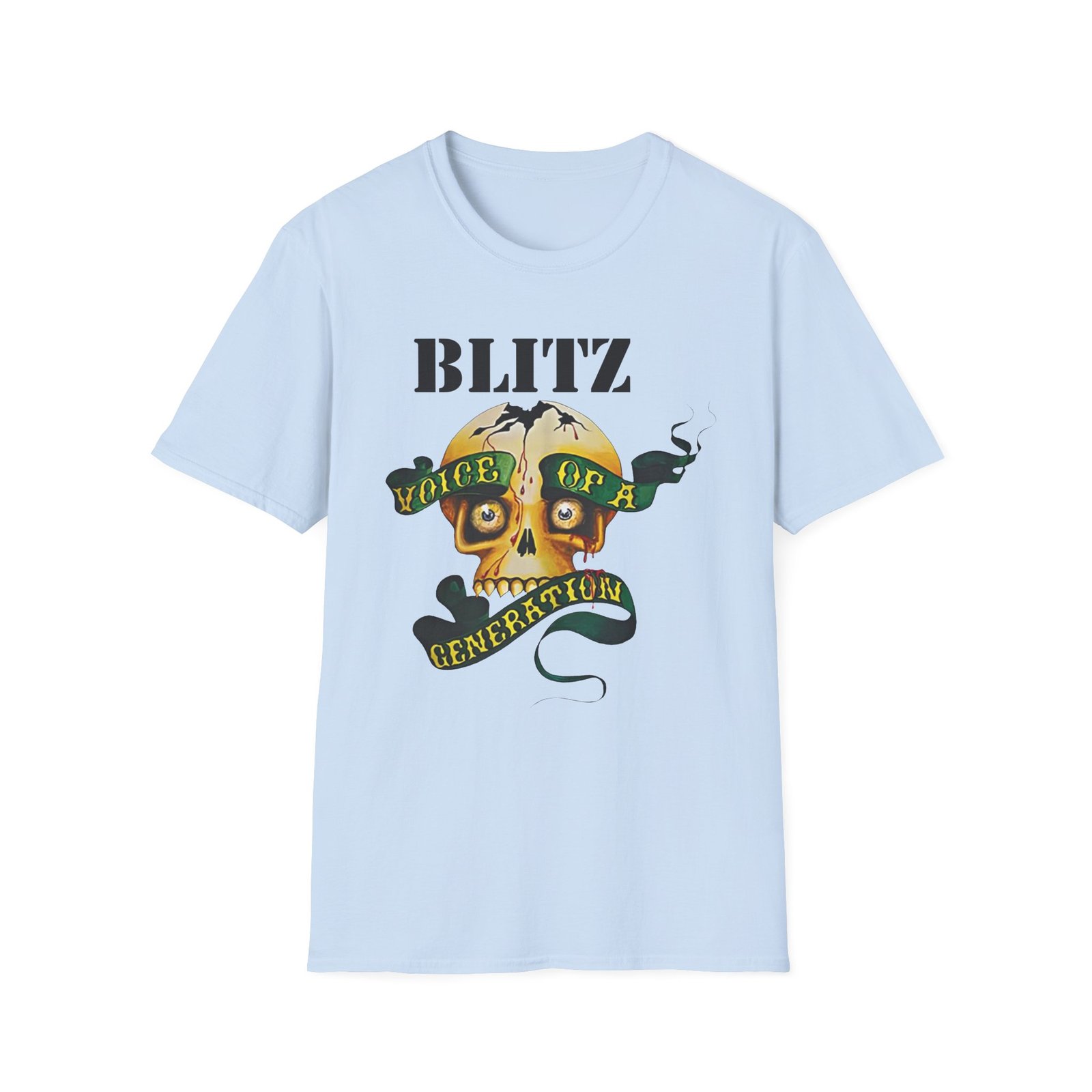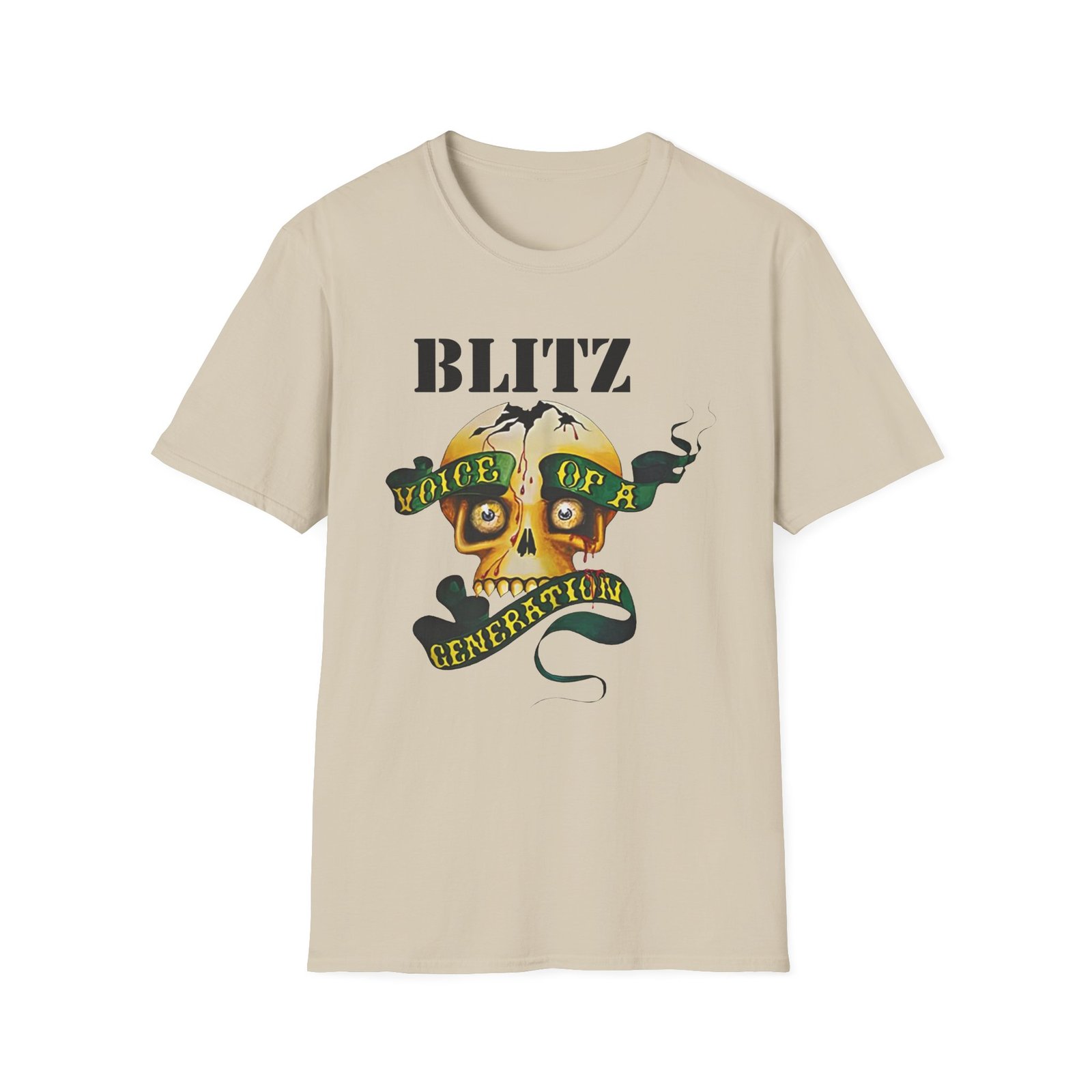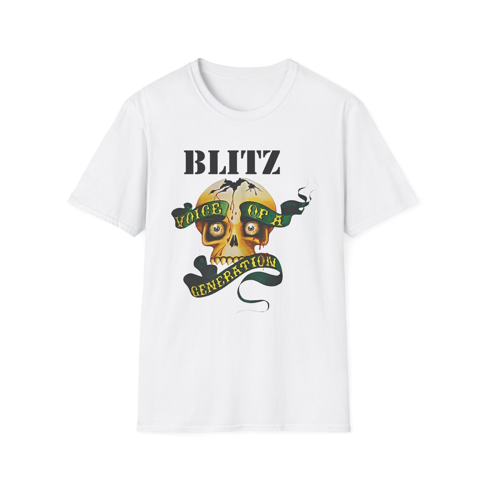 The Blitz Voice Of A Generation unisex soft-style t-shirt puts a new spin on casual comfort. Made from very soft materials, this tee is 100% cotton for solid colors. Heather colors and sports grey include polyester. The shoulders have twill tape for improved durability. There are no side seams. The collar is made with ribbed knitting to prevent curling damage.