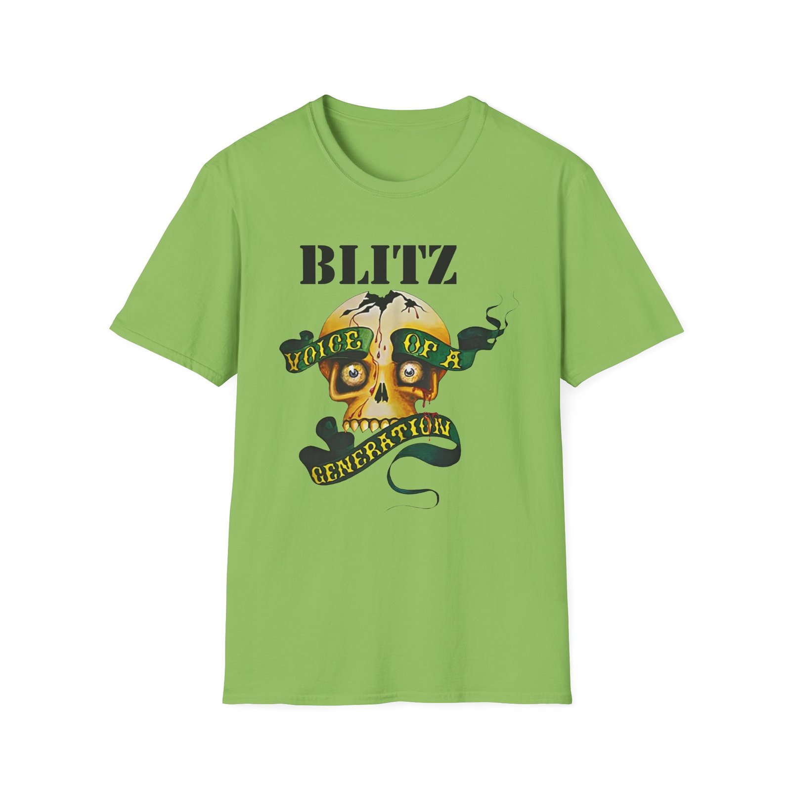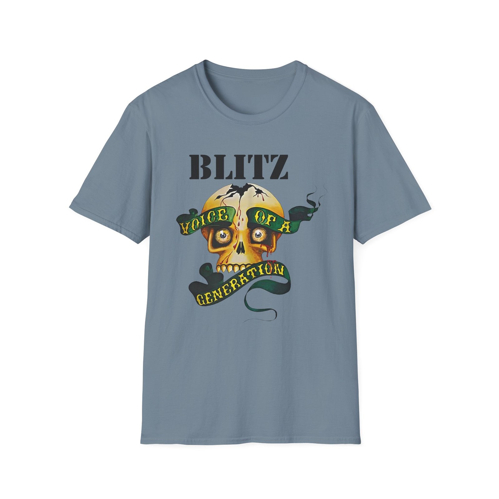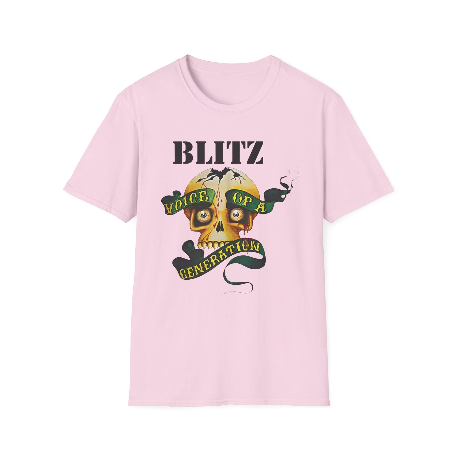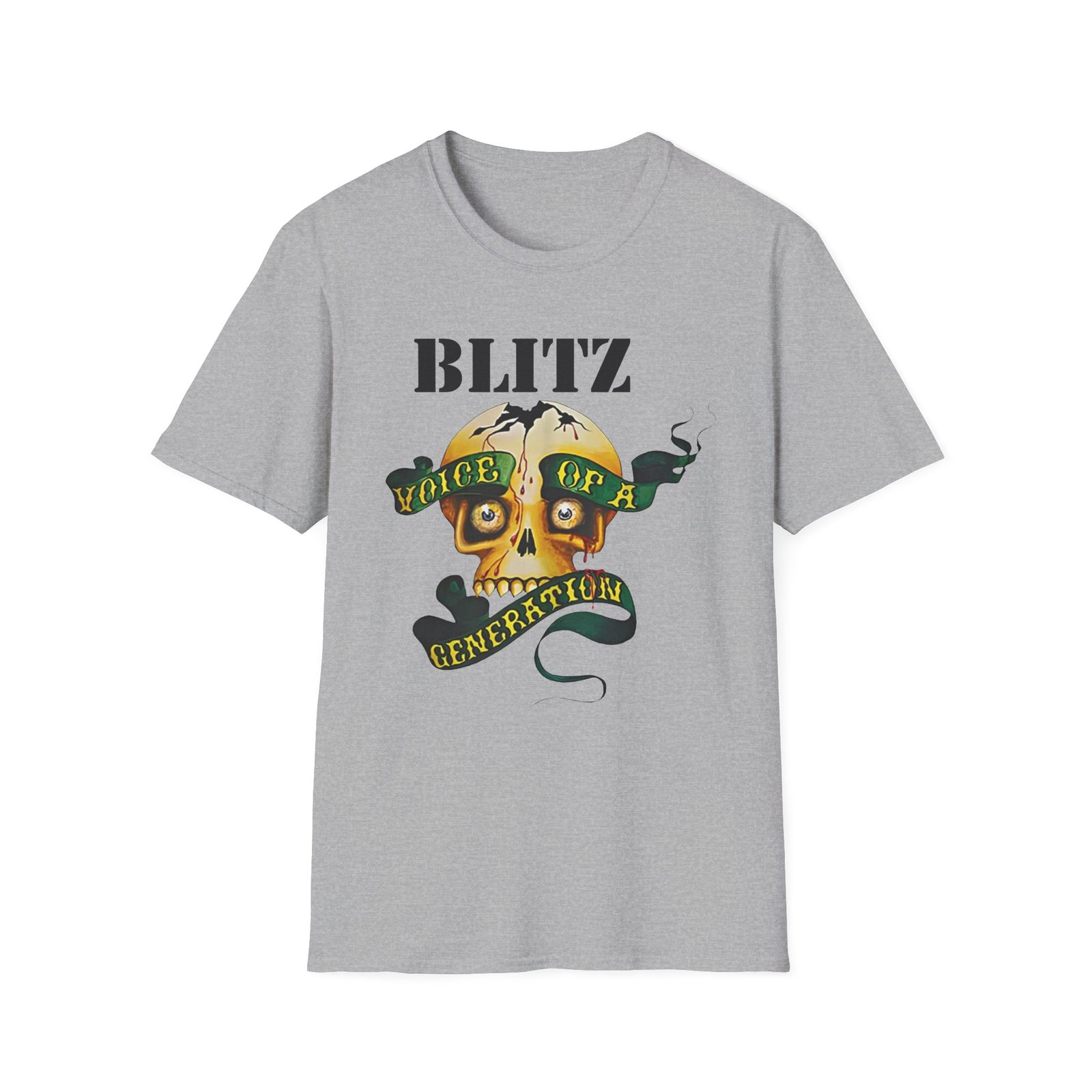 The Blitz Voice Of A Generation unisex soft-style t-shirt puts a new spin on casual comfort. Made from very soft materials, this tee is 100% cotton for solid colors. Heather colors and sports grey include polyester. The shoulders have twill tape for improved durability. There are no side seams. The collar is made with ribbed knitting to prevent curling damage.