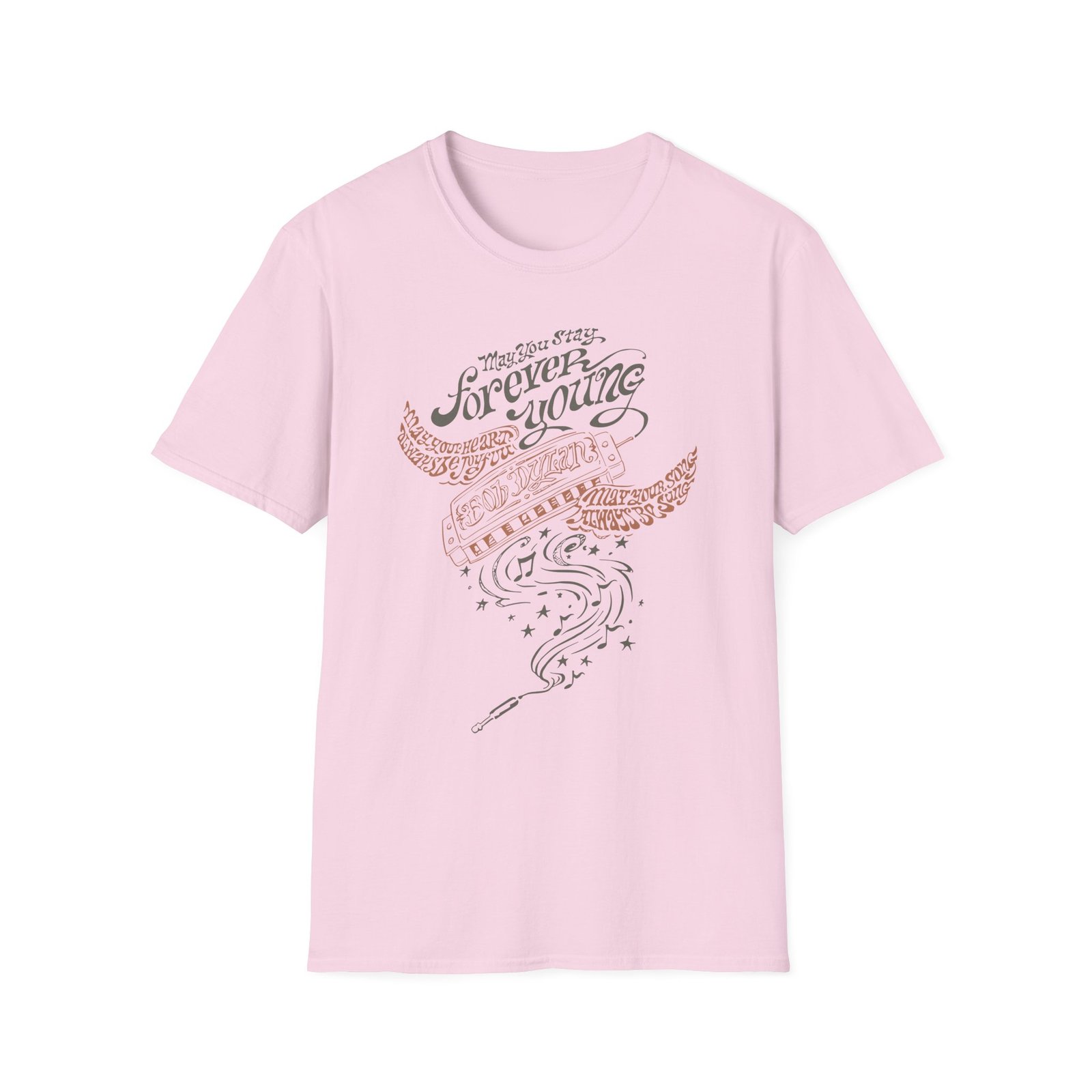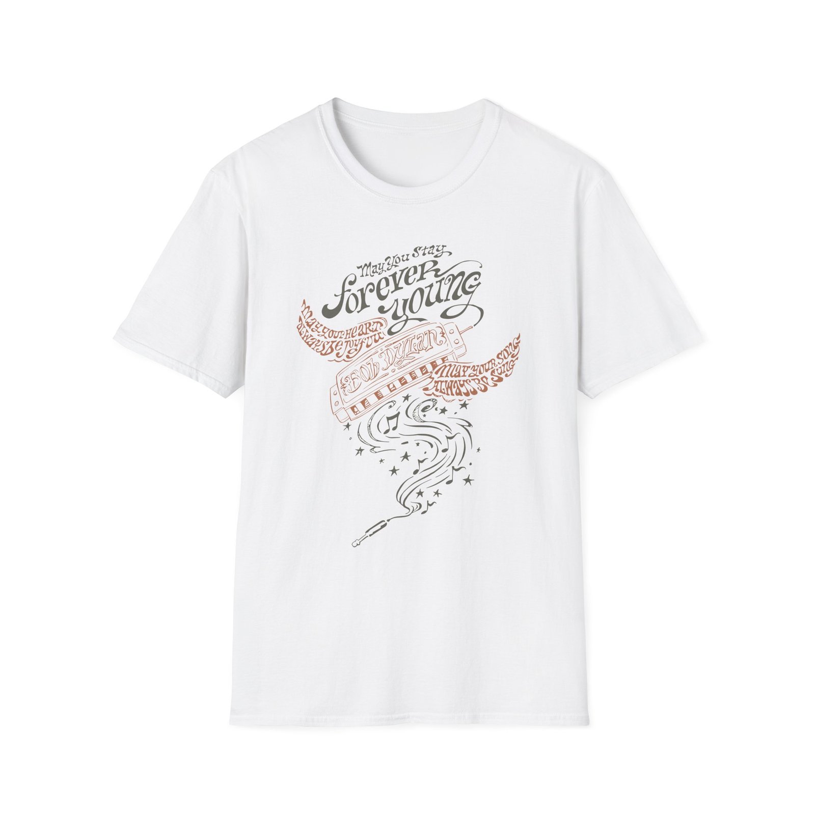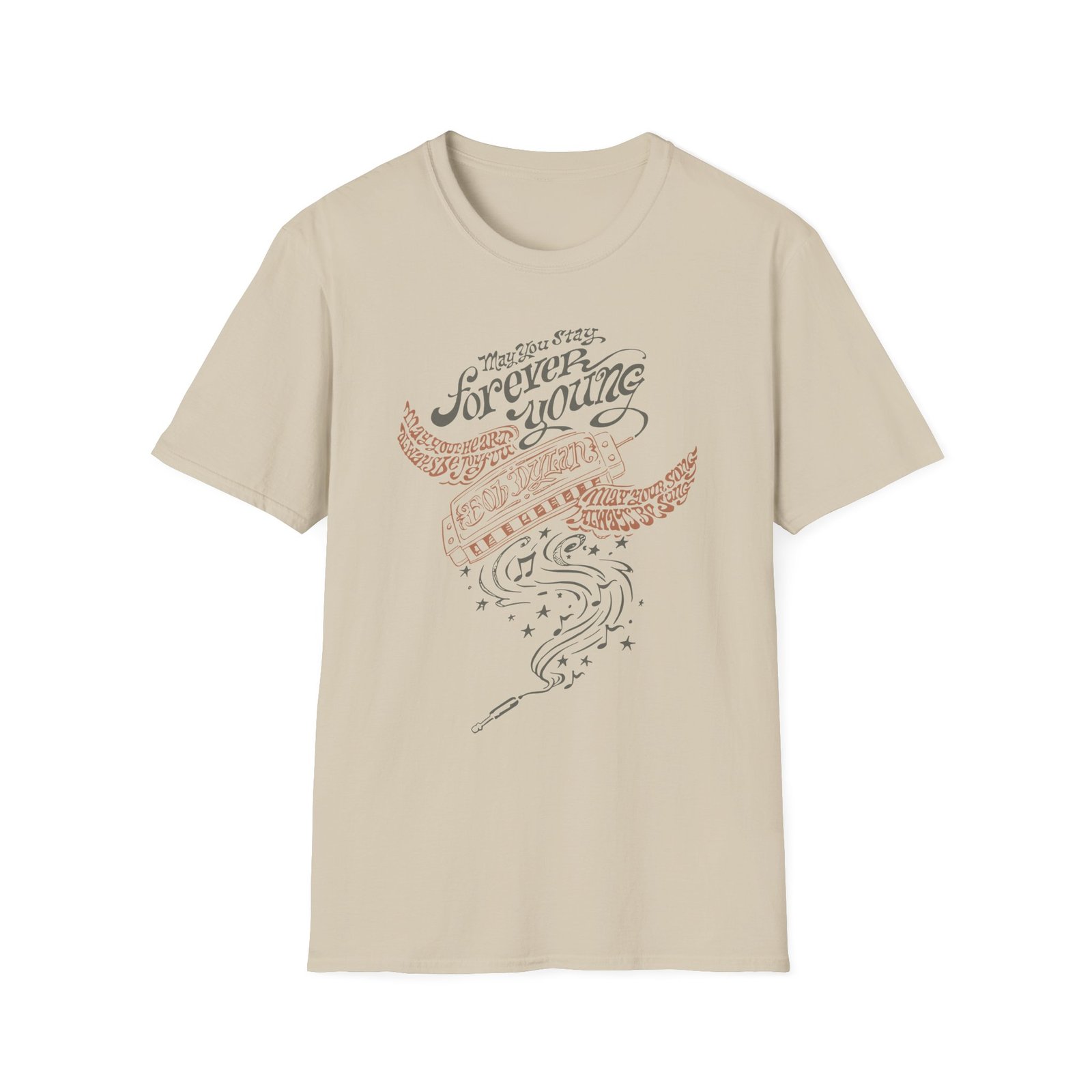 The Bob Dylan Always Be Joyful unisex soft-style t-shirt puts a new spin on casual comfort. Made from very soft materials, this tee is 100% cotton for solid colors. Heather colors and sports grey include polyester. The shoulders have twill tape for improved durability. There are no side seams. The collar is made with ribbed knitting to prevent curling damage.