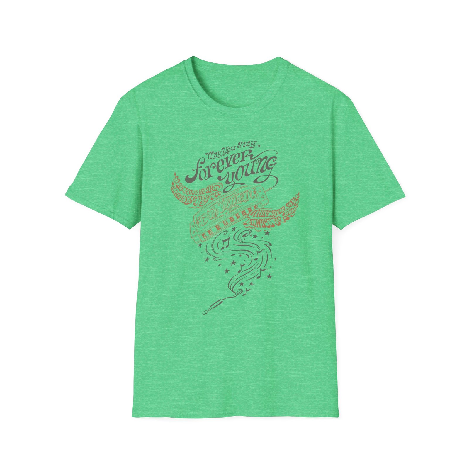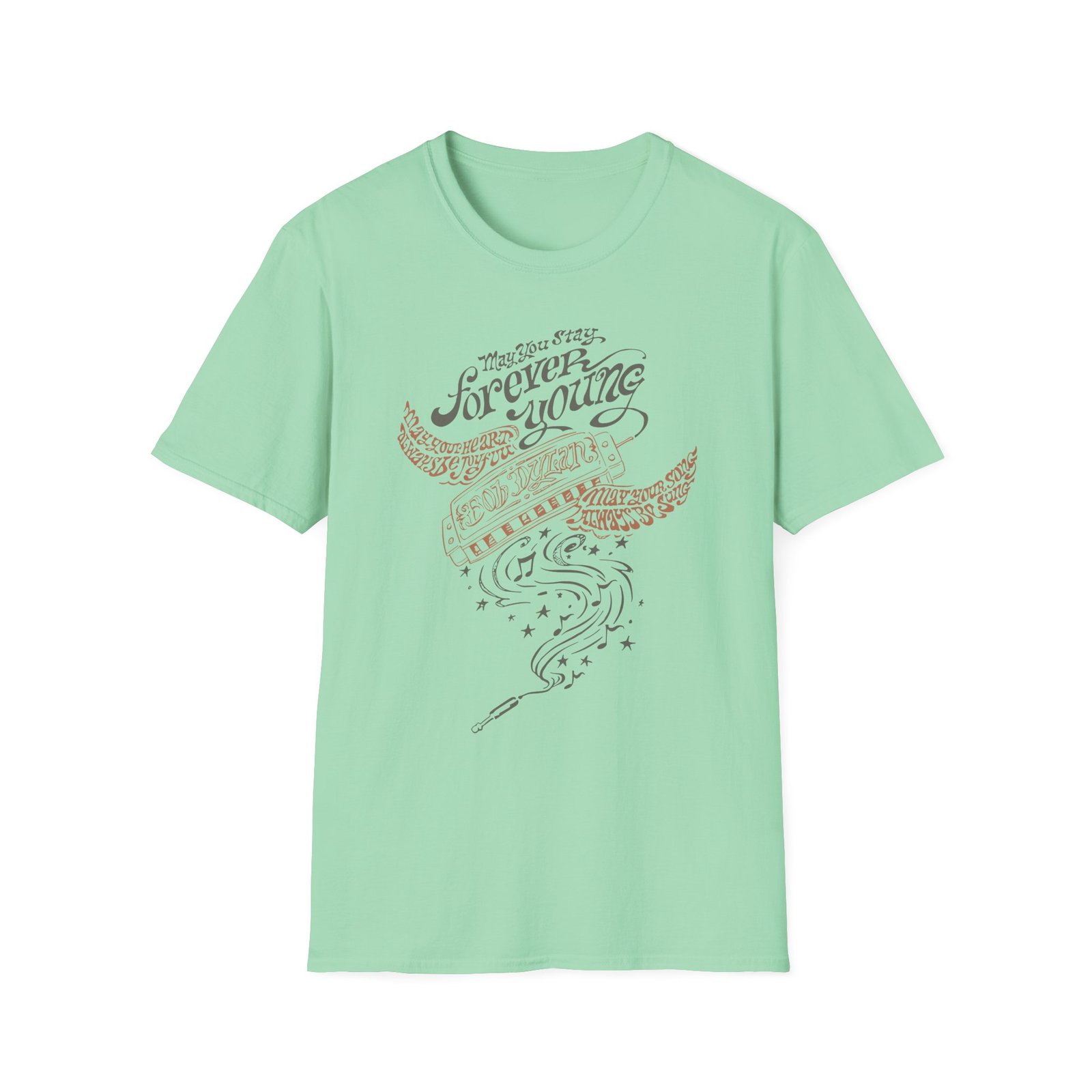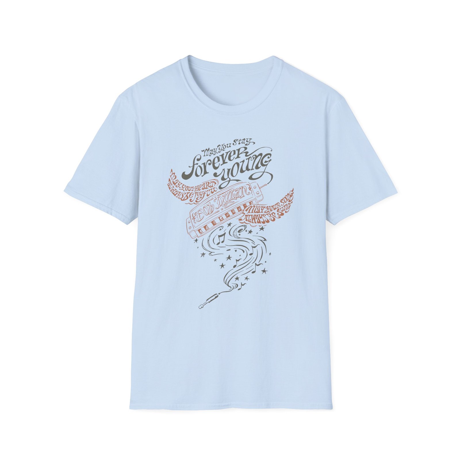 The Bob Dylan Always Be Joyful unisex soft-style t-shirt puts a new spin on casual comfort. Made from very soft materials, this tee is 100% cotton for solid colors. Heather colors and sports grey include polyester. The shoulders have twill tape for improved durability. There are no side seams. The collar is made with ribbed knitting to prevent curling damage.