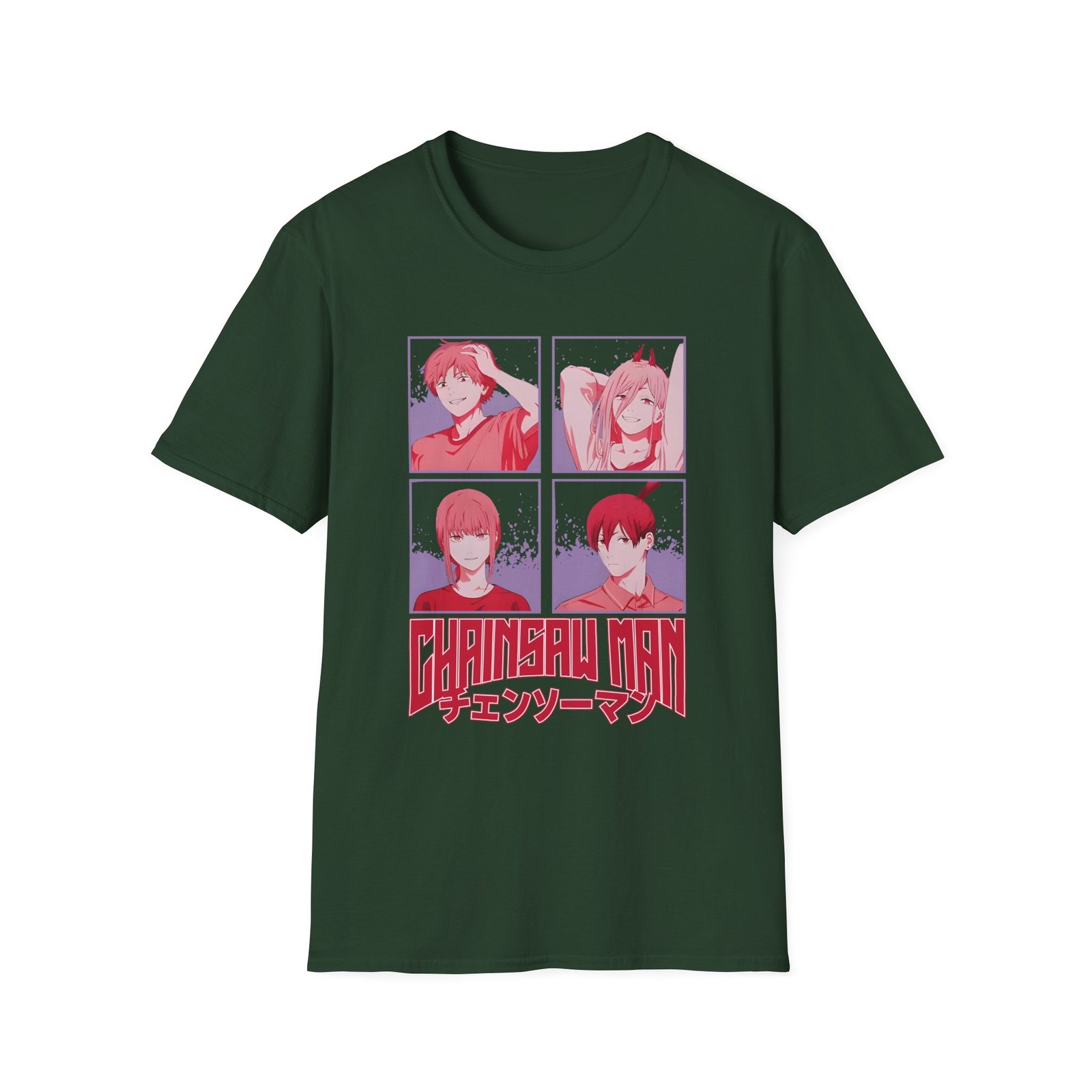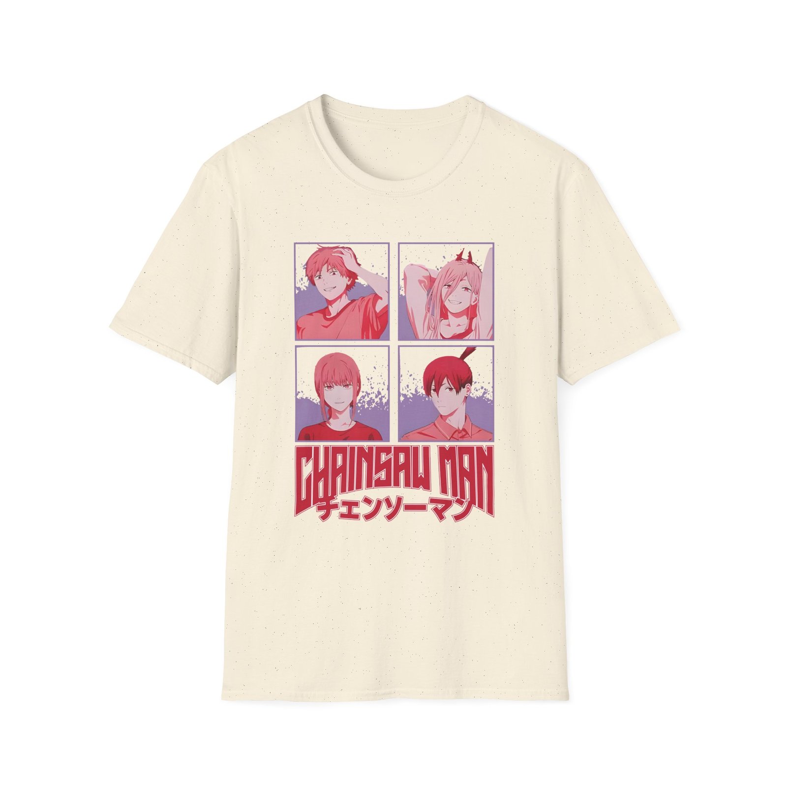 The Chainsaw Man Tonal Group unisex soft-style t-shirt puts a new spin on casual comfort. Made from very soft materials, this tee is 100% cotton for solid colors. Heather colors and sports grey include polyester. The shoulders have twill tape for improved durability. There are no side seams. The collar is made with ribbed knitting to prevent curling damage.