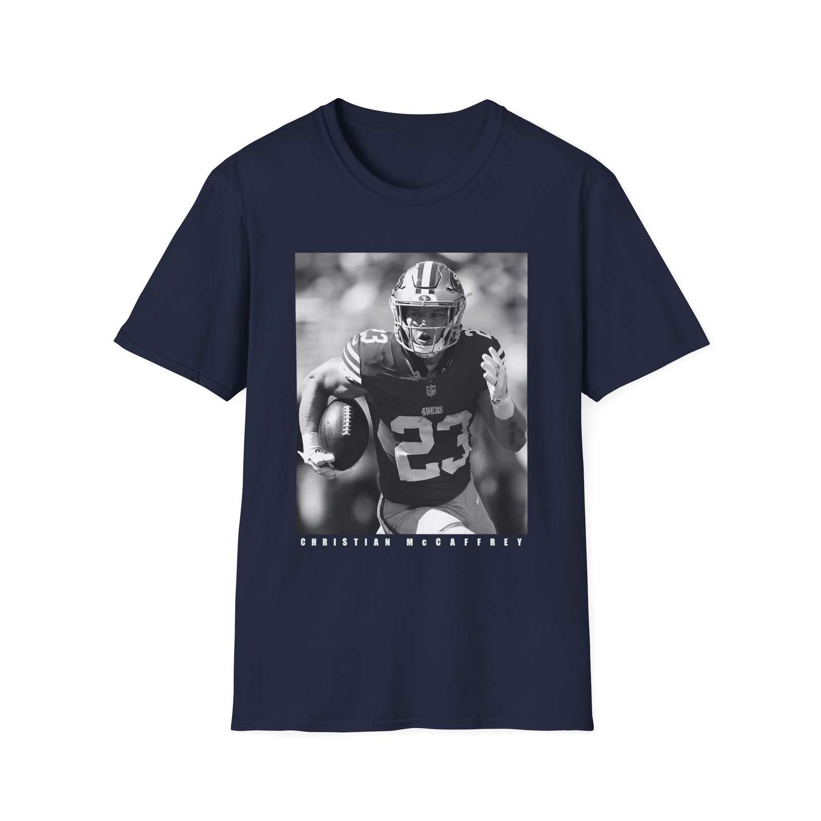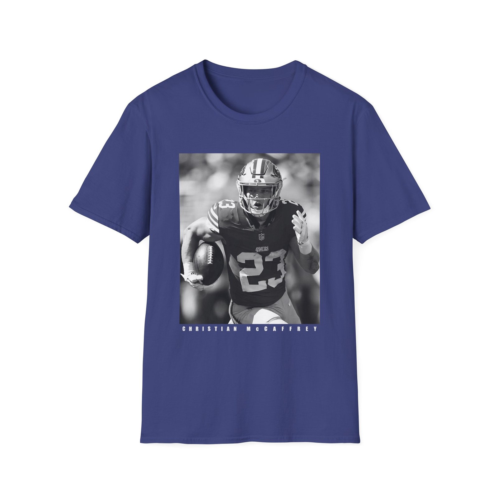 The Christian Mccaffrey unisex soft-style t-shirt puts a new spin on casual comfort. Made from very soft materials, this tee is 100% cotton for solid colors. Heather colors and sports grey include polyester. The shoulders have twill tape for improved durability. There are no side seams. The collar is made with ribbed knitting to prevent curling damage.
