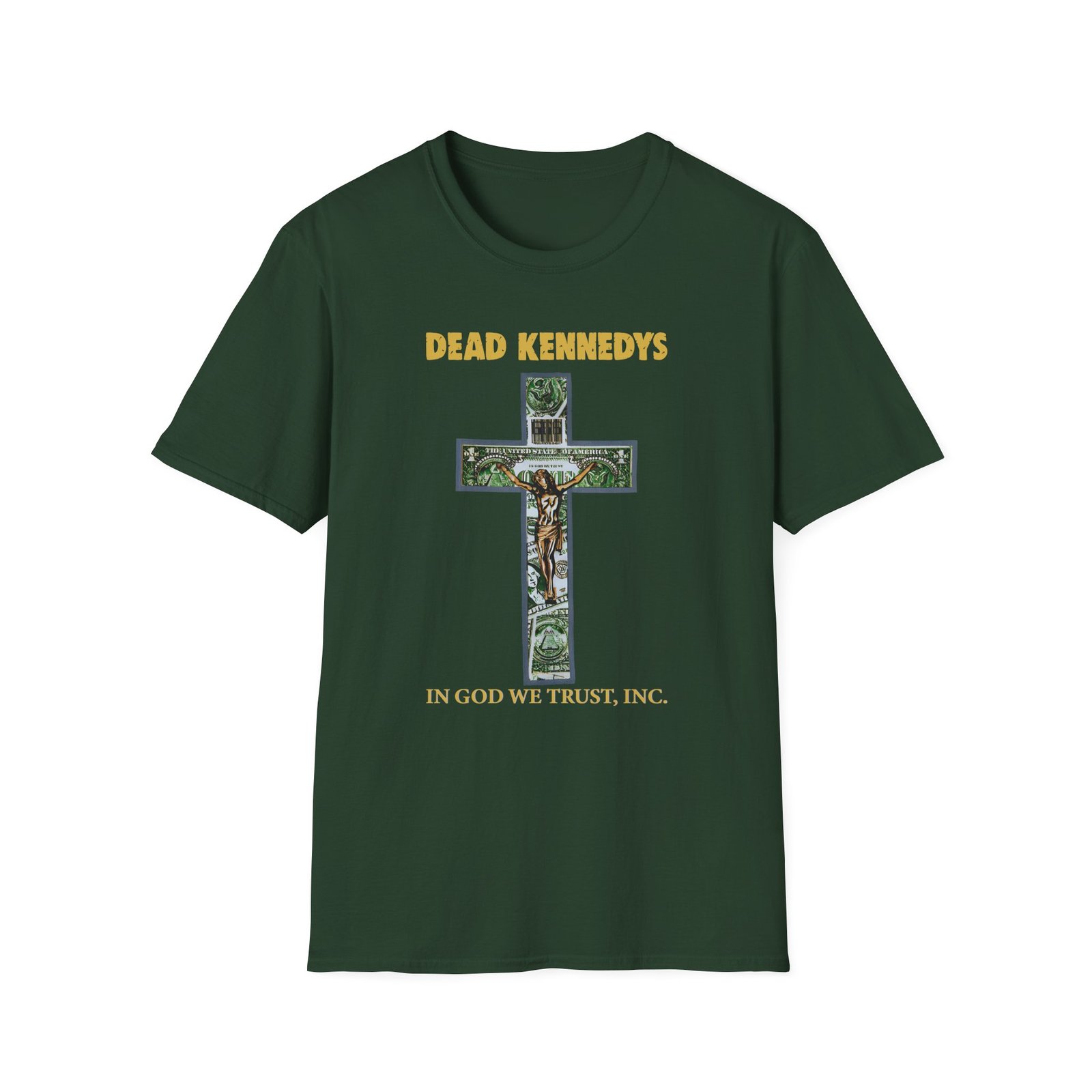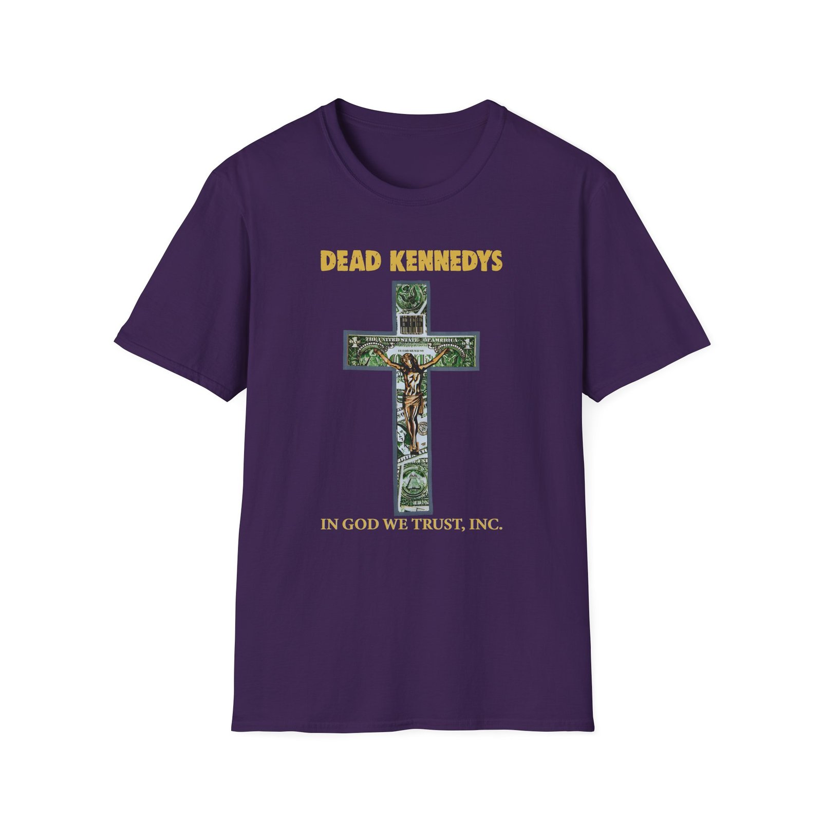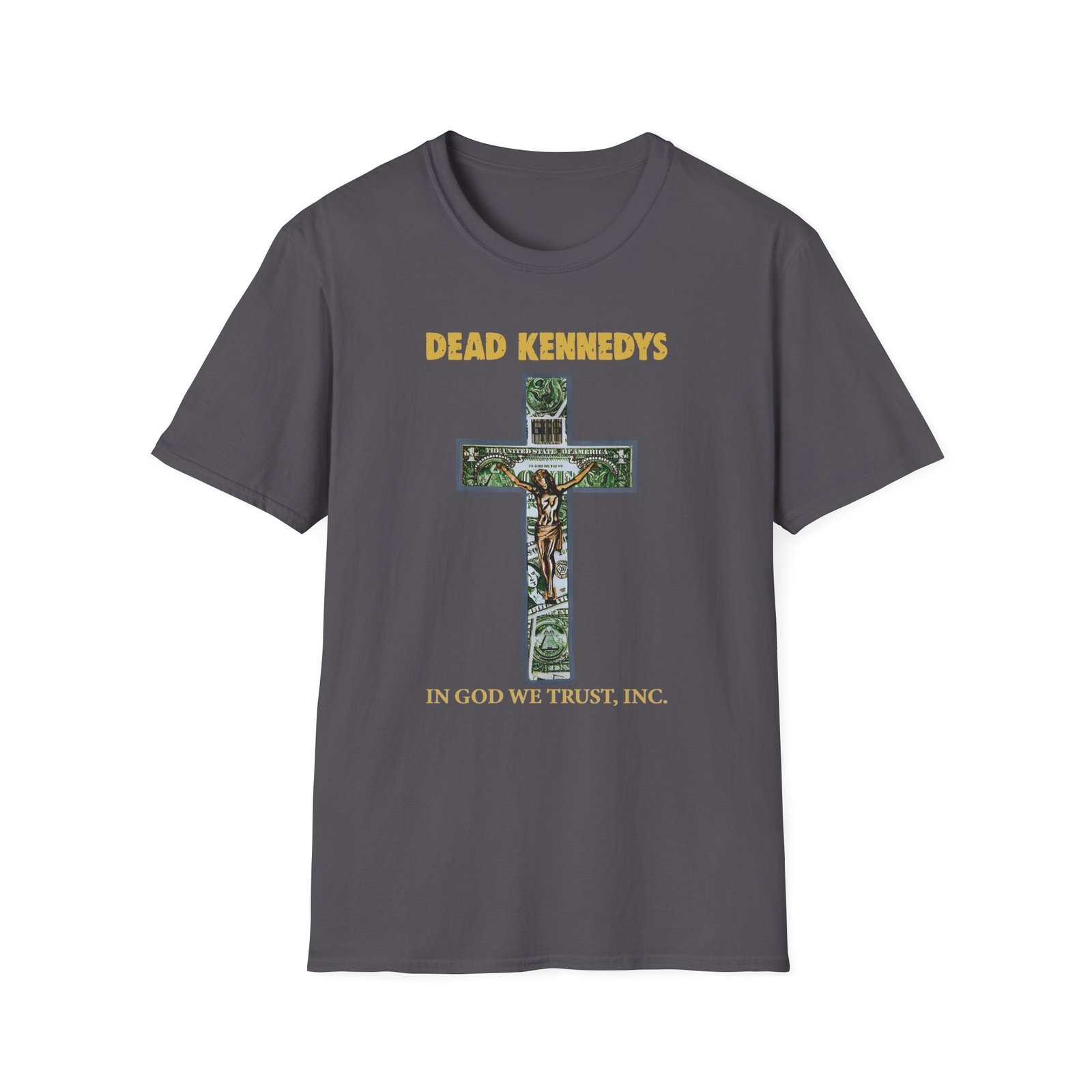 The Dead Kennedys In God We Trust, Inc. unisex soft-style t-shirt puts a new spin on casual comfort. Made from very soft materials, this tee is 100% cotton for solid colors. Heather colors and sports grey include polyester. The shoulders have twill tape for improved durability. There are no side seams. The collar is made with ribbed knitting to prevent curling damage.