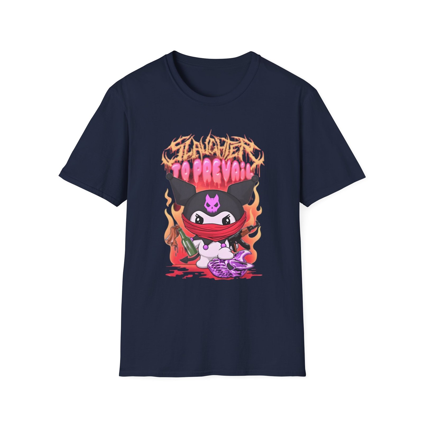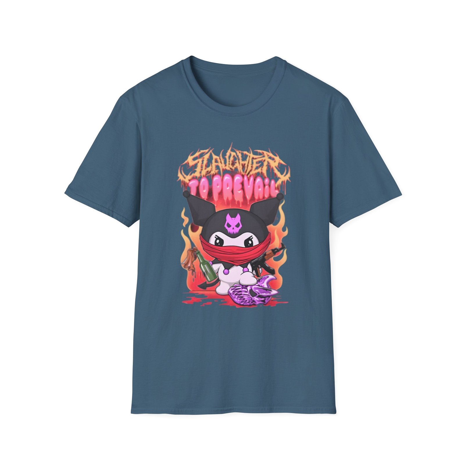 The First Blood Slaughter to Prevail Sanrio of Darkness unisex soft-style t-shirt puts a new spin on casual comfort. Made from very soft materials, this tee is 100% cotton for solid colors. Heather colors and sports grey include polyester. The shoulders have twill tape for improved durability. There are no side seams. The collar is made with ribbed knitting to prevent curling damage.