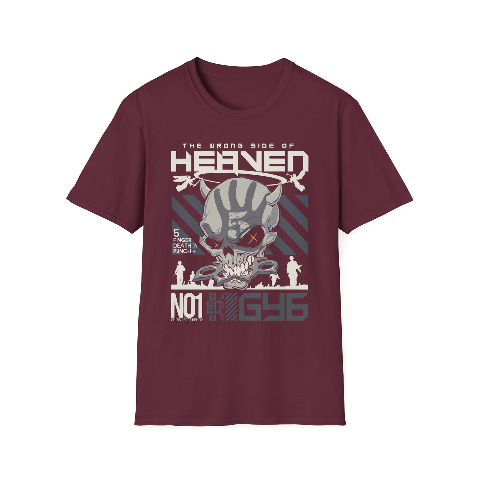 The Five Finger Death Punch N01 Wrong Side of Heaven Anniversary Unisex Softstyle T-Shirt puts a new spin on casual comfort. Made from very soft materials, this tee is 100% cotton for solid colors. Heather colors and sports grey include polyester. The shoulders have twill tape for improved durability. There are no side seams. The collar is made with ribbed knitting to prevent curling damage.