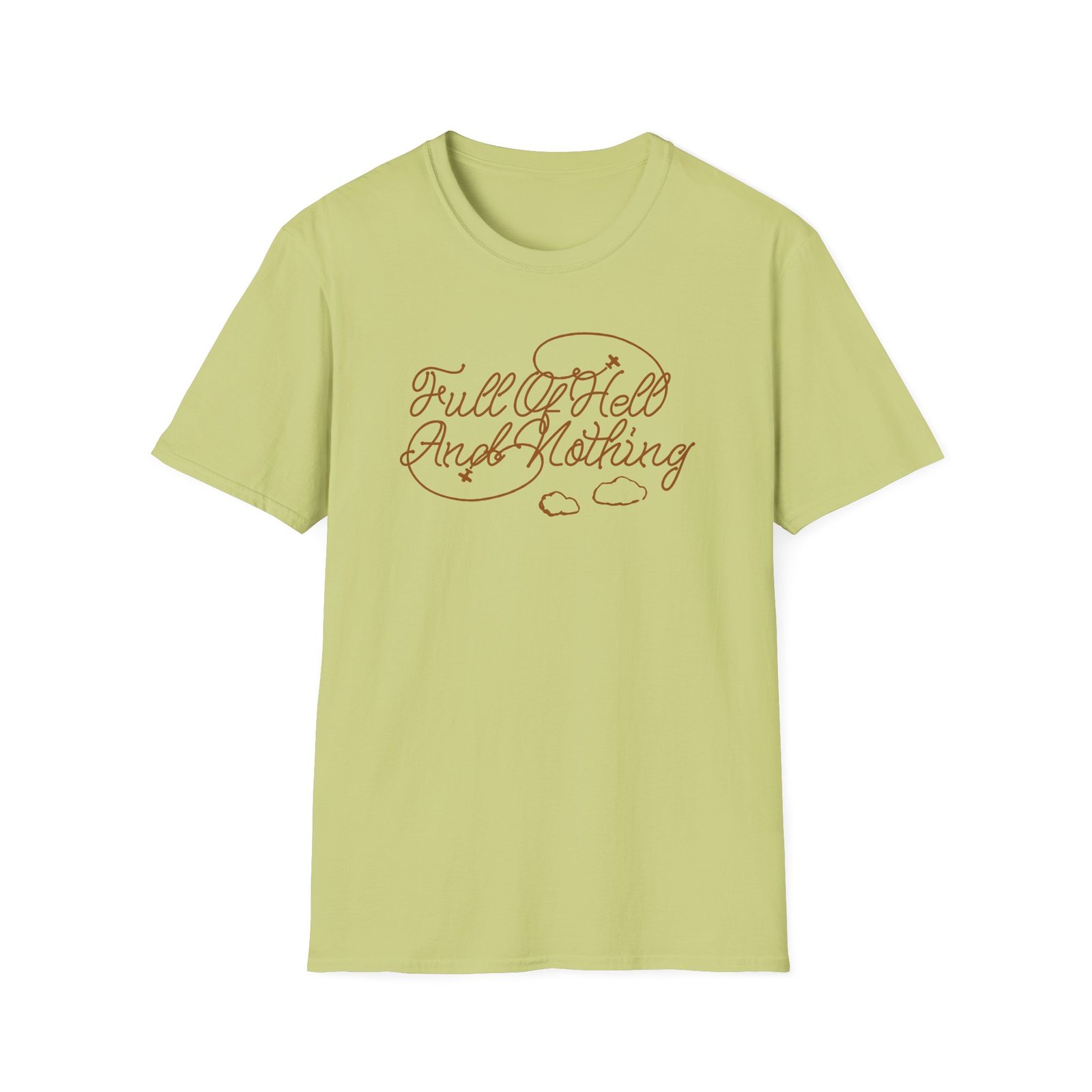 The Full of Hell and Nothing Heaven unisex soft-style t-shirt puts a new spin on casual comfort. Made from very soft materials, this tee is 100% cotton for solid colors. Heather colors and sports grey include polyester. The shoulders have twill tape for improved durability. There are no side seams. The collar is made with ribbed knitting to prevent curling damage.