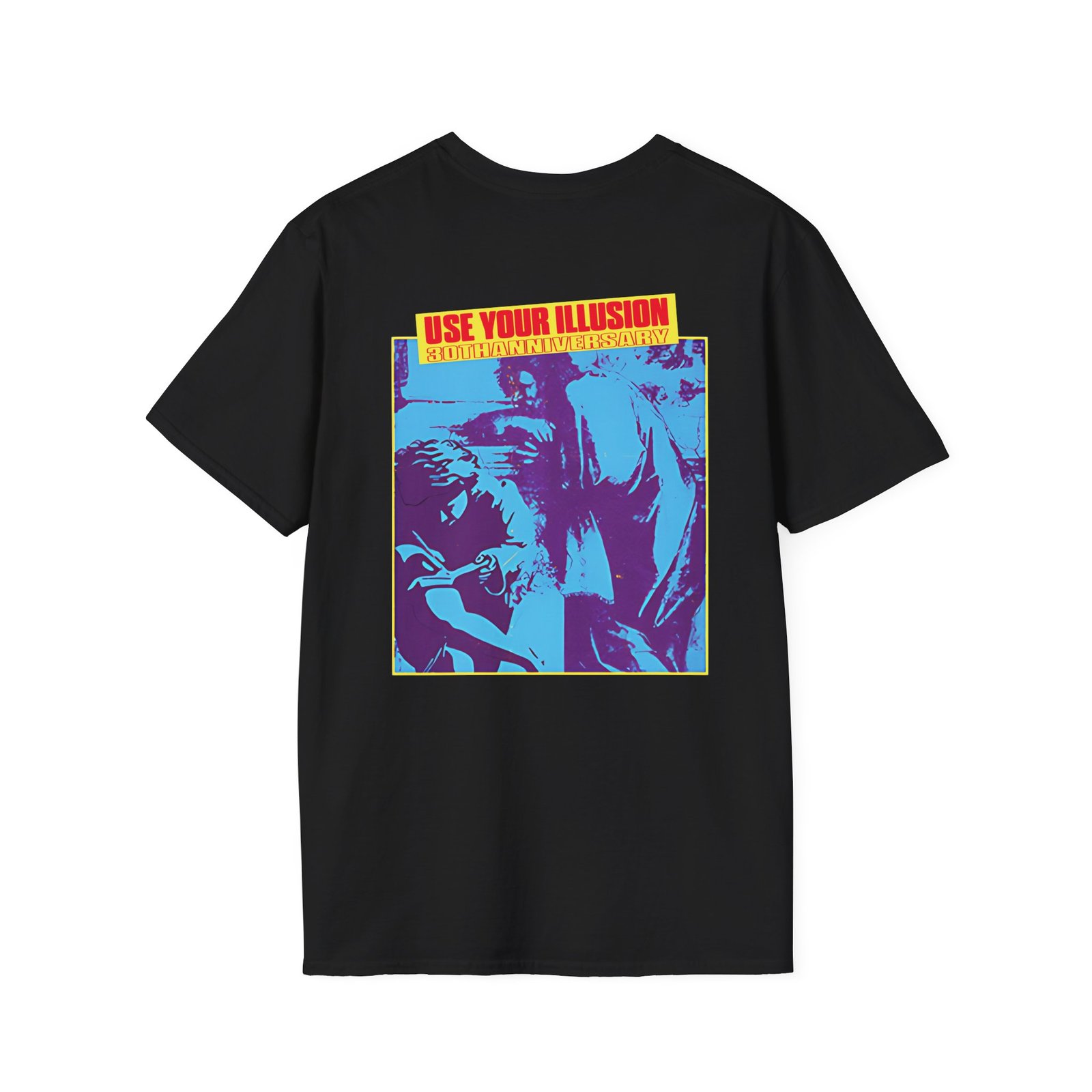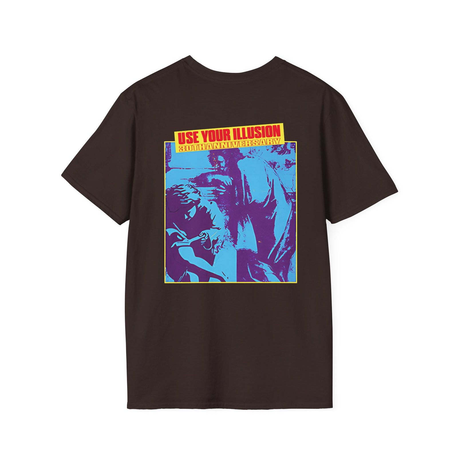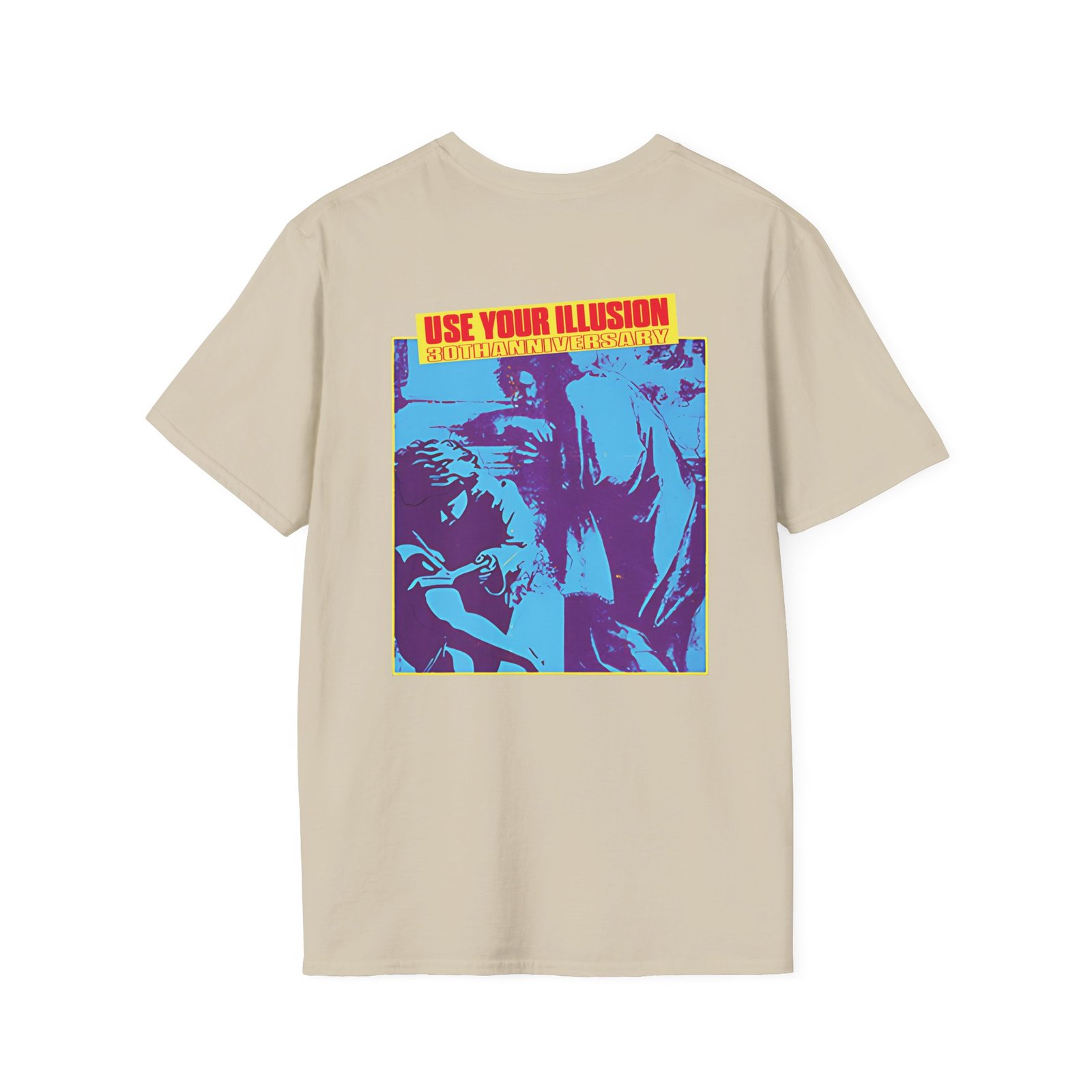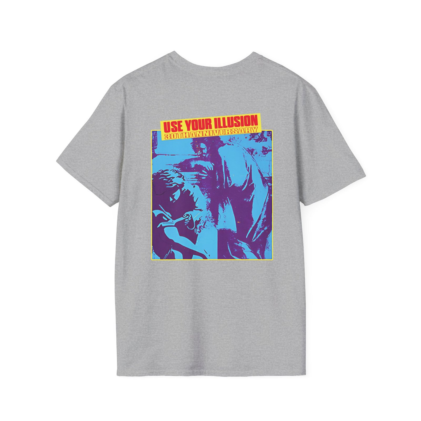 The Guns N Roses 30th Anniversary Use Your Illusion unisex soft-style t-shirt puts a new spin on casual comfort. Made from very soft materials, this tee is 100% cotton for solid colors. Heather colors and sports grey include polyester. The shoulders have twill tape for improved durability. There are no side seams. The collar is made with ribbed knitting to prevent curling damage.
