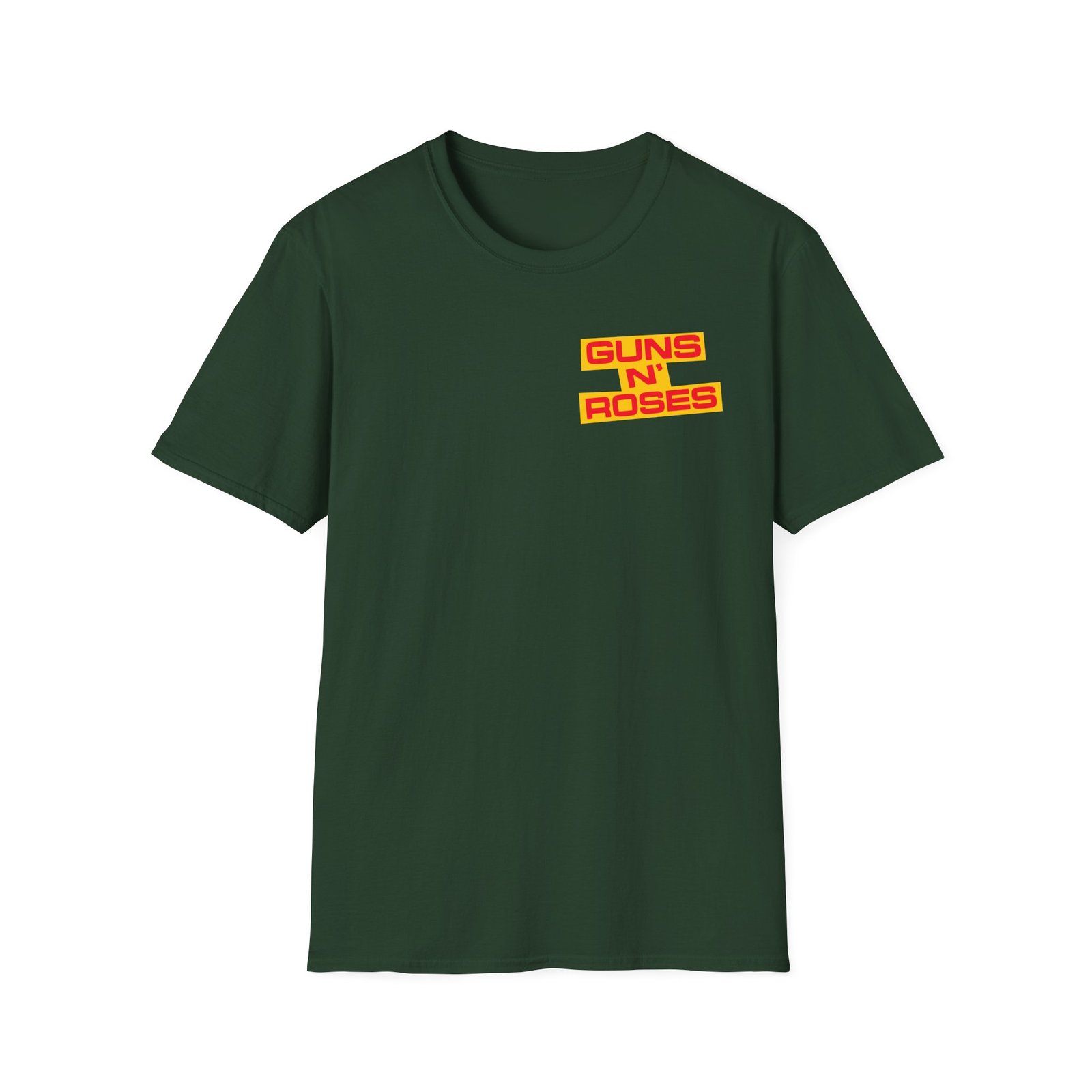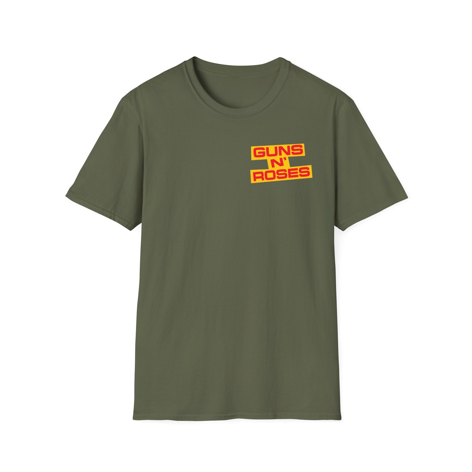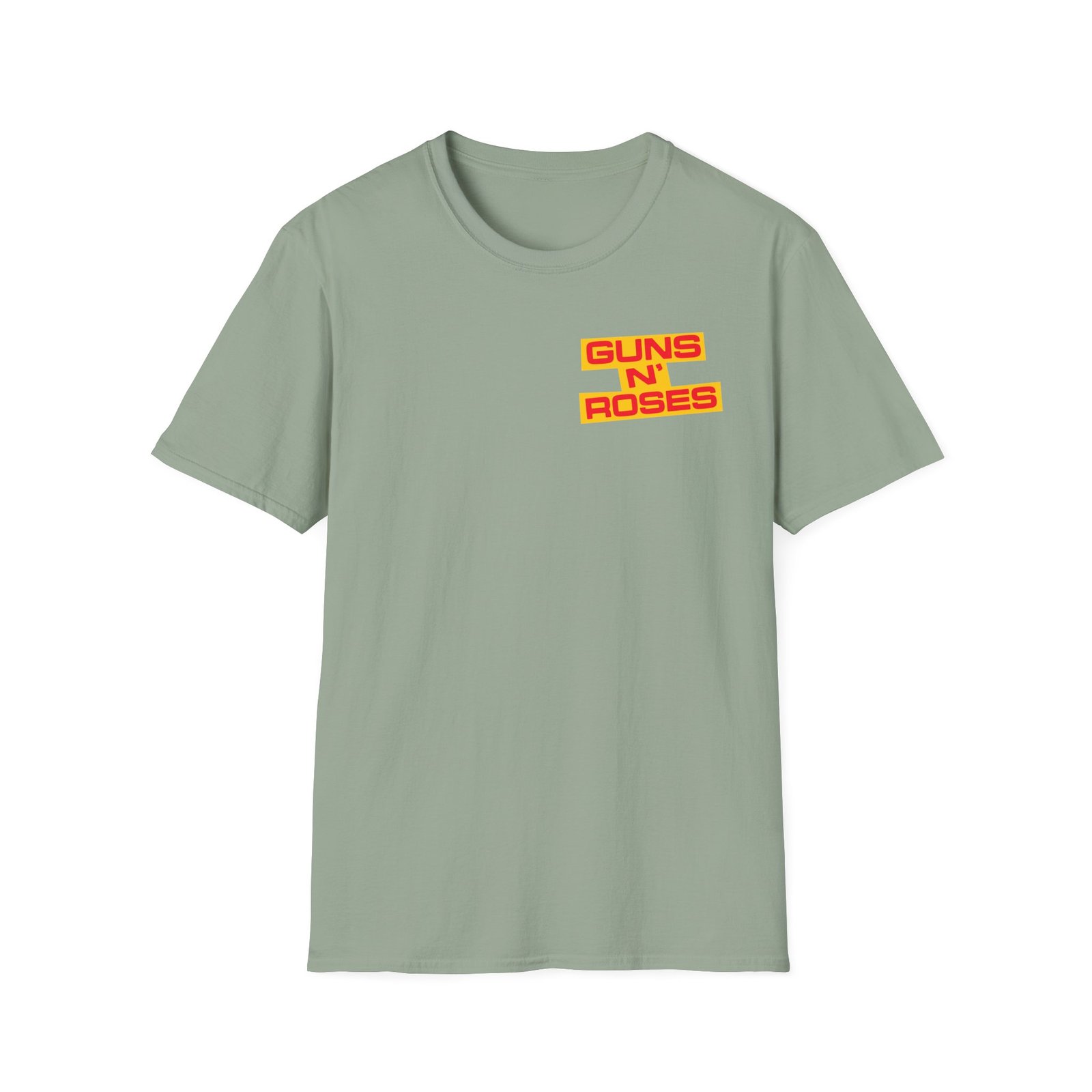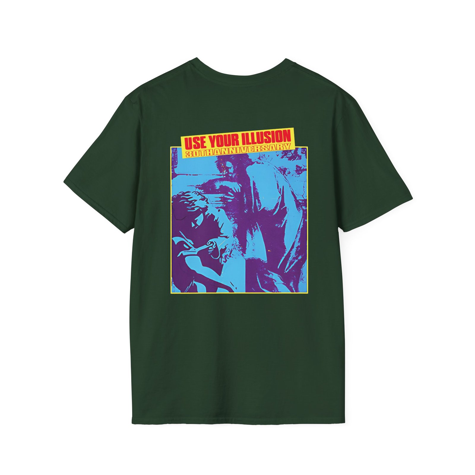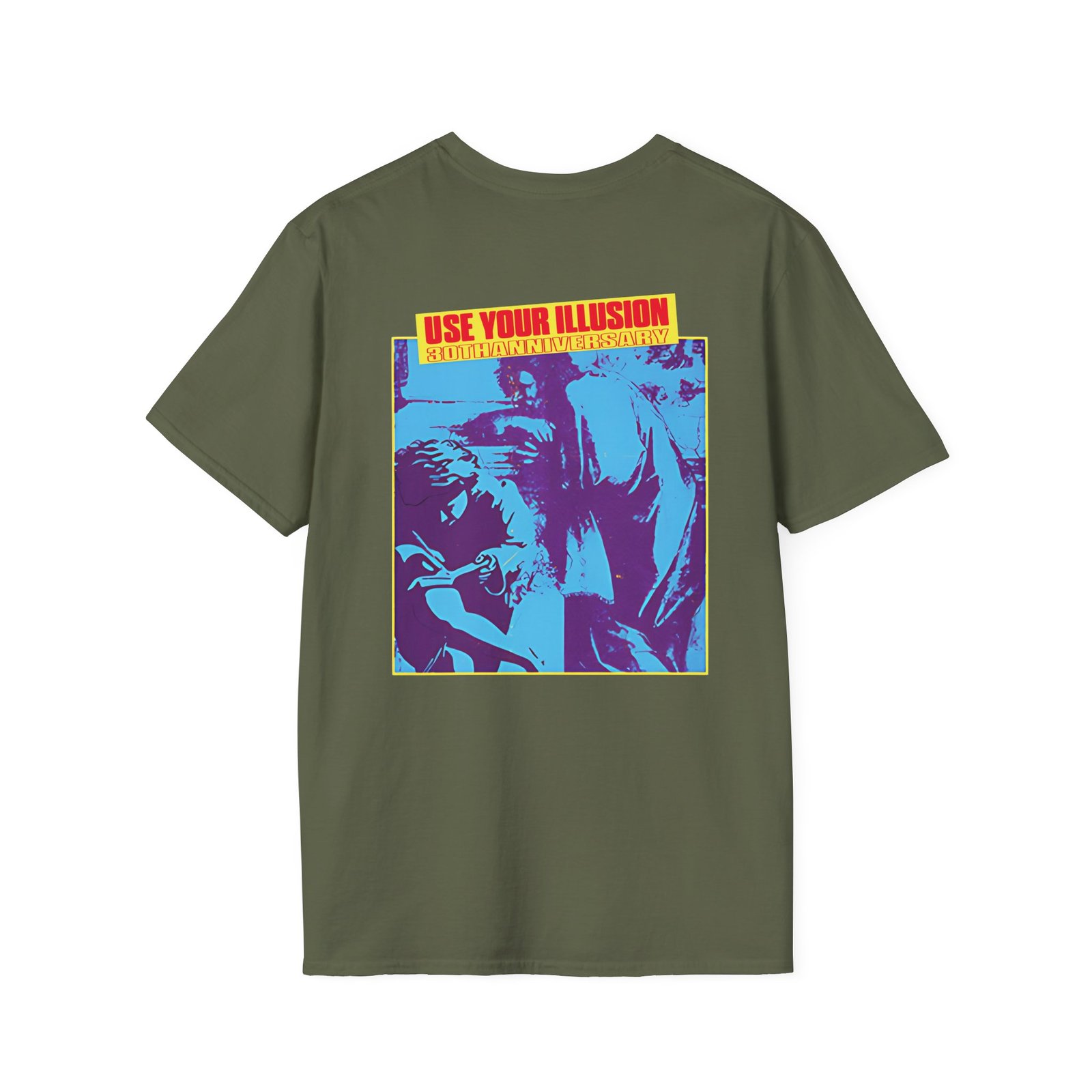 The Guns N Roses 30th Anniversary Use Your Illusion unisex soft-style t-shirt puts a new spin on casual comfort. Made from very soft materials, this tee is 100% cotton for solid colors. Heather colors and sports grey include polyester. The shoulders have twill tape for improved durability. There are no side seams. The collar is made with ribbed knitting to prevent curling damage.