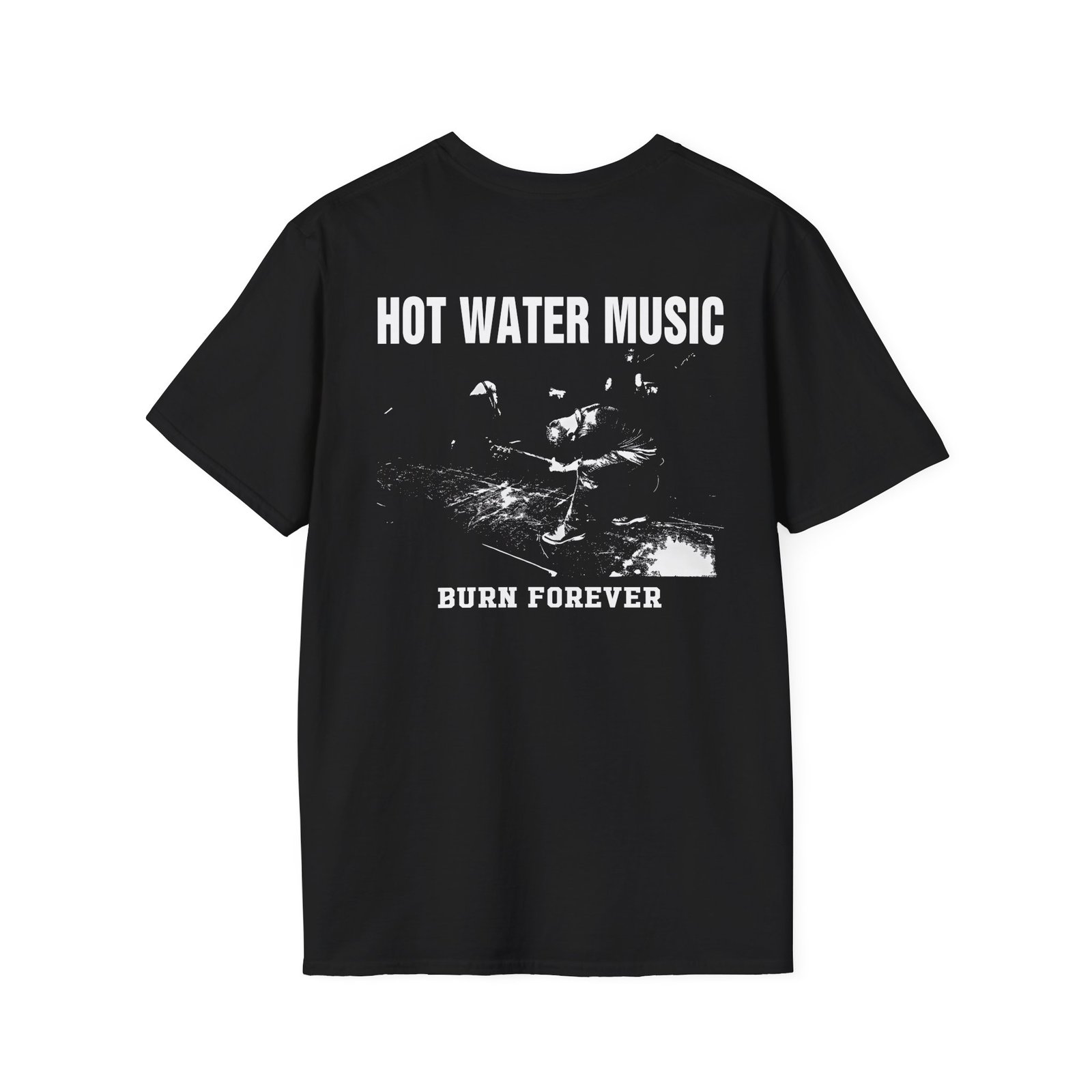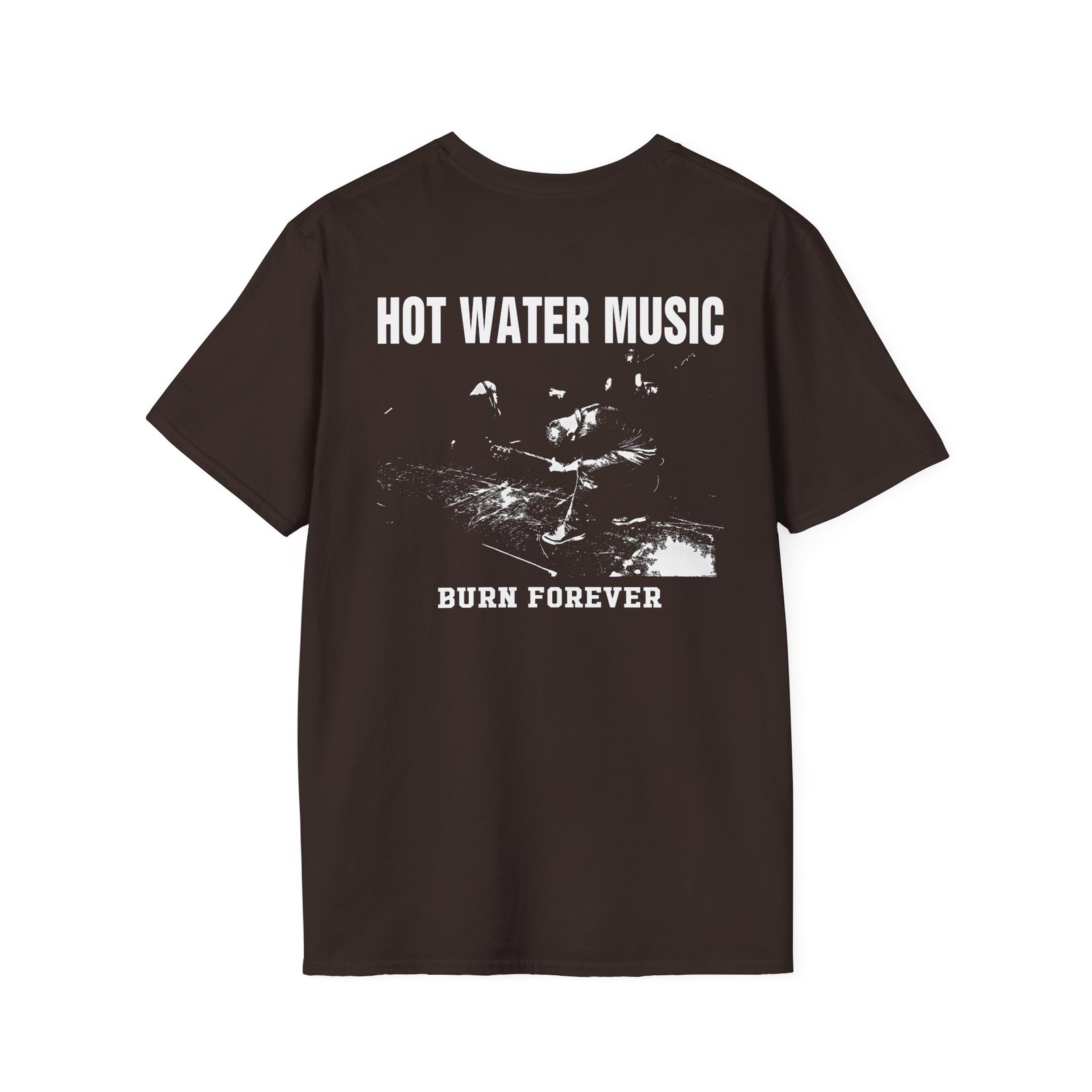 The Hot Water Music Burn Forever unisex soft-style t-shirt puts a new spin on casual comfort. Made from very soft materials, this tee is 100% cotton for solid colors. Heather colors and sports grey include polyester. The shoulders have twill tape for improved durability. There are no side seams. The collar is made with ribbed knitting to prevent curling damage.