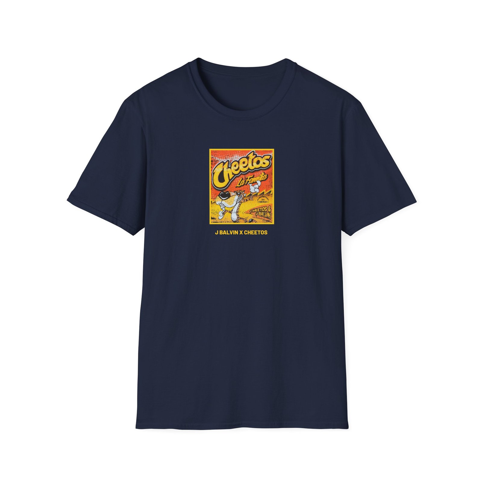 The J Balvin X Cheetos Flavored Familia unisex soft-style t-shirt puts a new spin on casual comfort. Made from very soft materials, this tee is 100% cotton for solid colors. Heather colors and sports grey include polyester. The shoulders have twill tape for improved durability. There are no side seams. The collar is made with ribbed knitting to prevent curling damage.