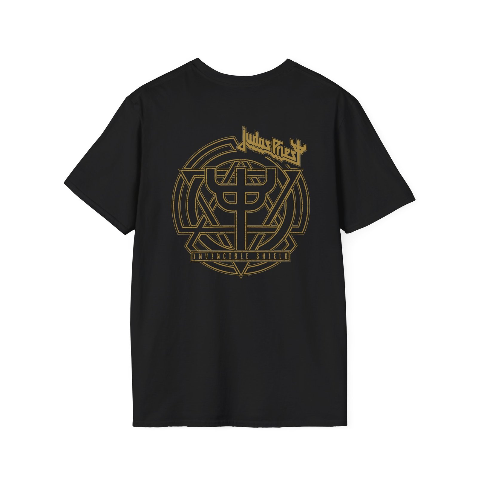 The Judas Priest Gold Invincible Shield unisex soft-style t-shirt puts a new spin on casual comfort. Made from very soft materials, this tee is 100% cotton for solid colors. Heather colors and sports grey include polyester. The shoulders have twill tape for improved durability. There are no side seams. The collar is made with ribbed knitting to prevent curling damage.