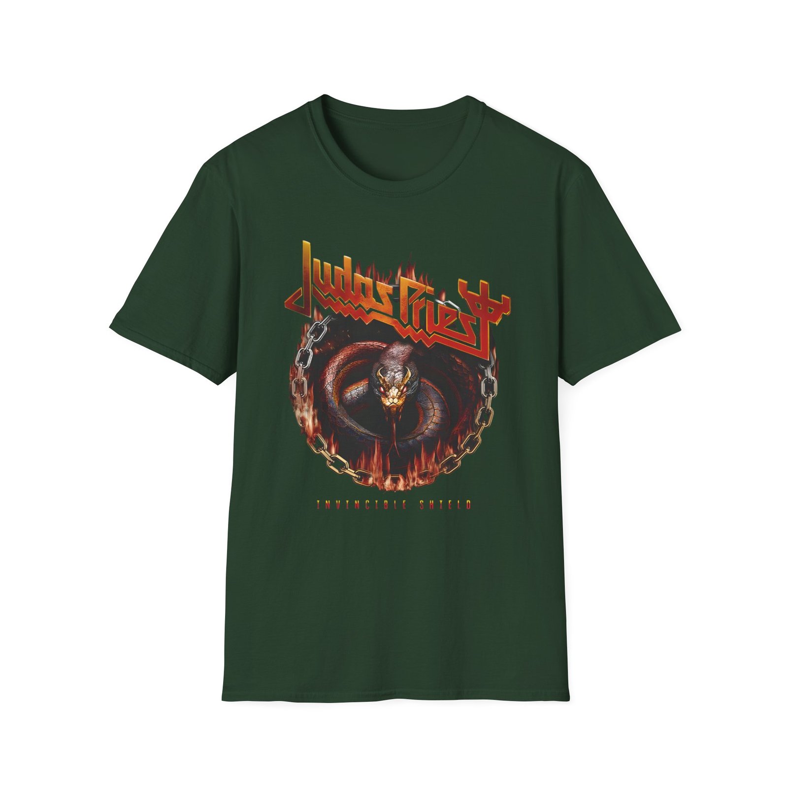 The Judas Priest Invincible Shield Serpent Itin unisex soft-style t-shirt puts a new spin on casual comfort. Made from very soft materials, this tee is 100% cotton for solid colors. Heather colors and sports grey include polyester. The shoulders have twill tape for improved durability. There are no side seams. The collar is made with ribbed knitting to prevent curling damage.