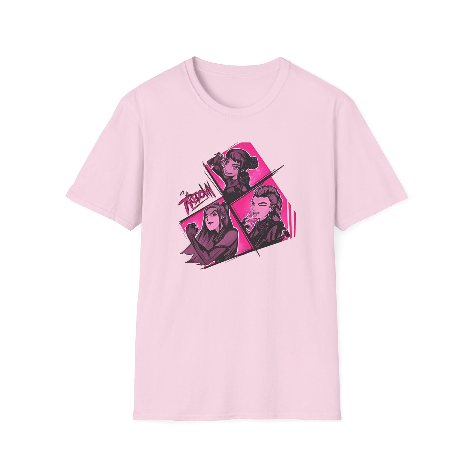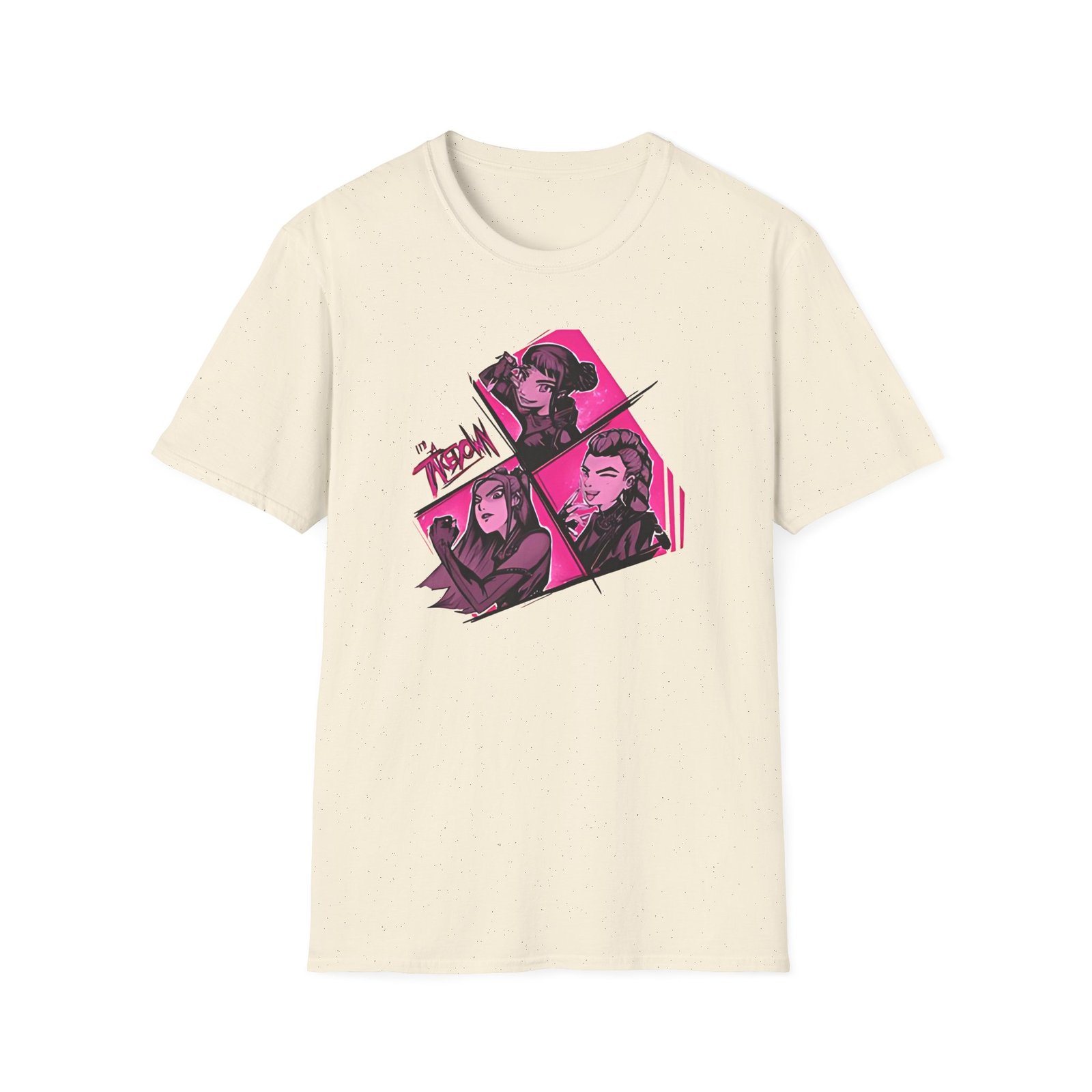 The Kpop Demon Hunters Take Down Unisex Softstyle T-Shirt puts a new spin on casual comfort. Made from very soft materials, this tee is 100% cotton for solid colors. Heather colors and sports grey include polyester. The shoulders have twill tape for improved durability. There are no side seams. The collar is made with ribbed knitting to prevent curling damage.