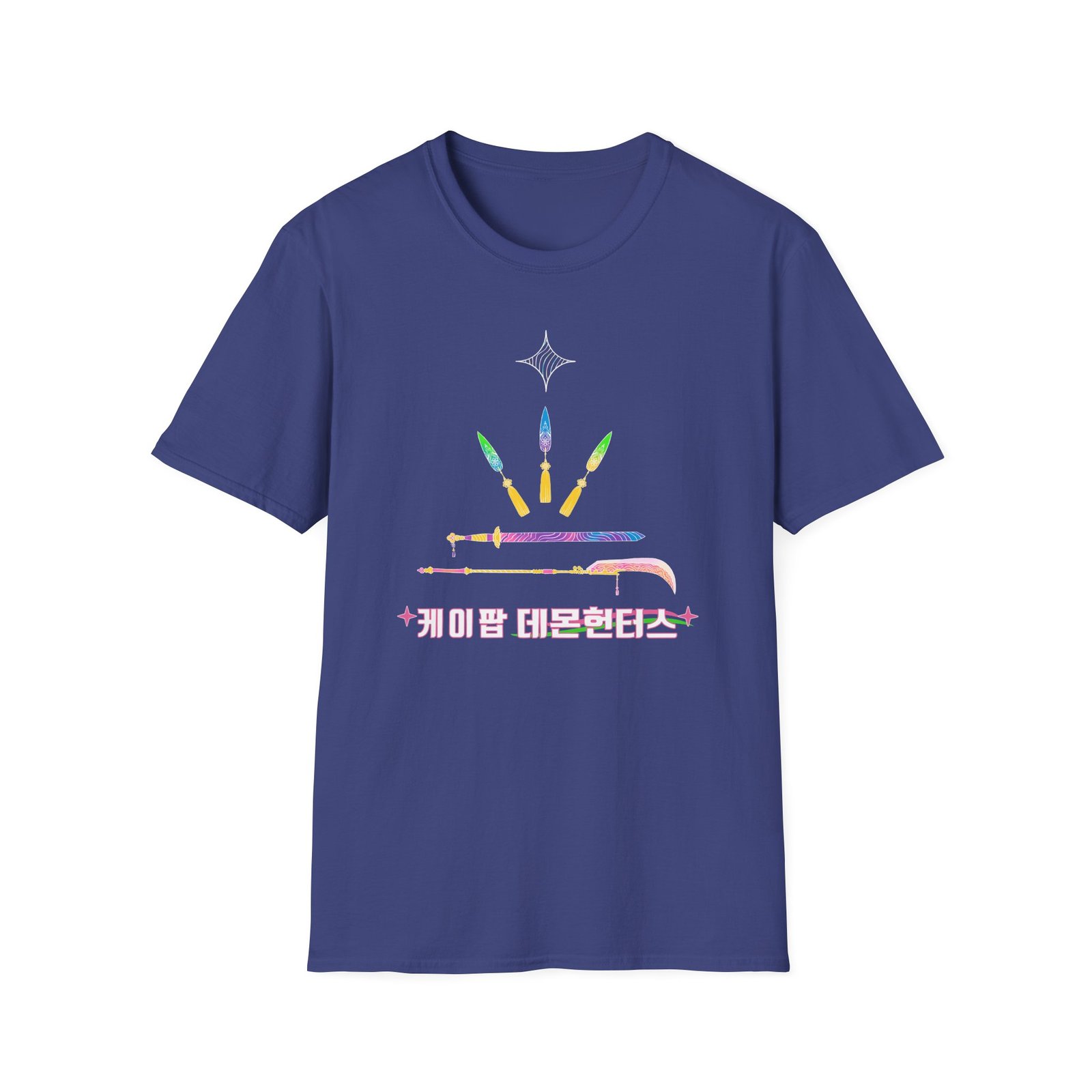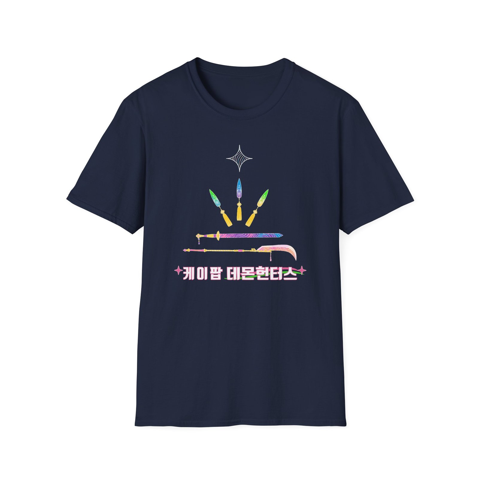 The Kpop Demon Hunters Weapons Unisex Softstyle T-Shirt puts a new spin on casual comfort. Made from very soft materials, this tee is 100% cotton for solid colors. Heather colors and sports grey include polyester. The shoulders have twill tape for improved durability. There are no side seams. The collar is made with ribbed knitting to prevent curling damage.