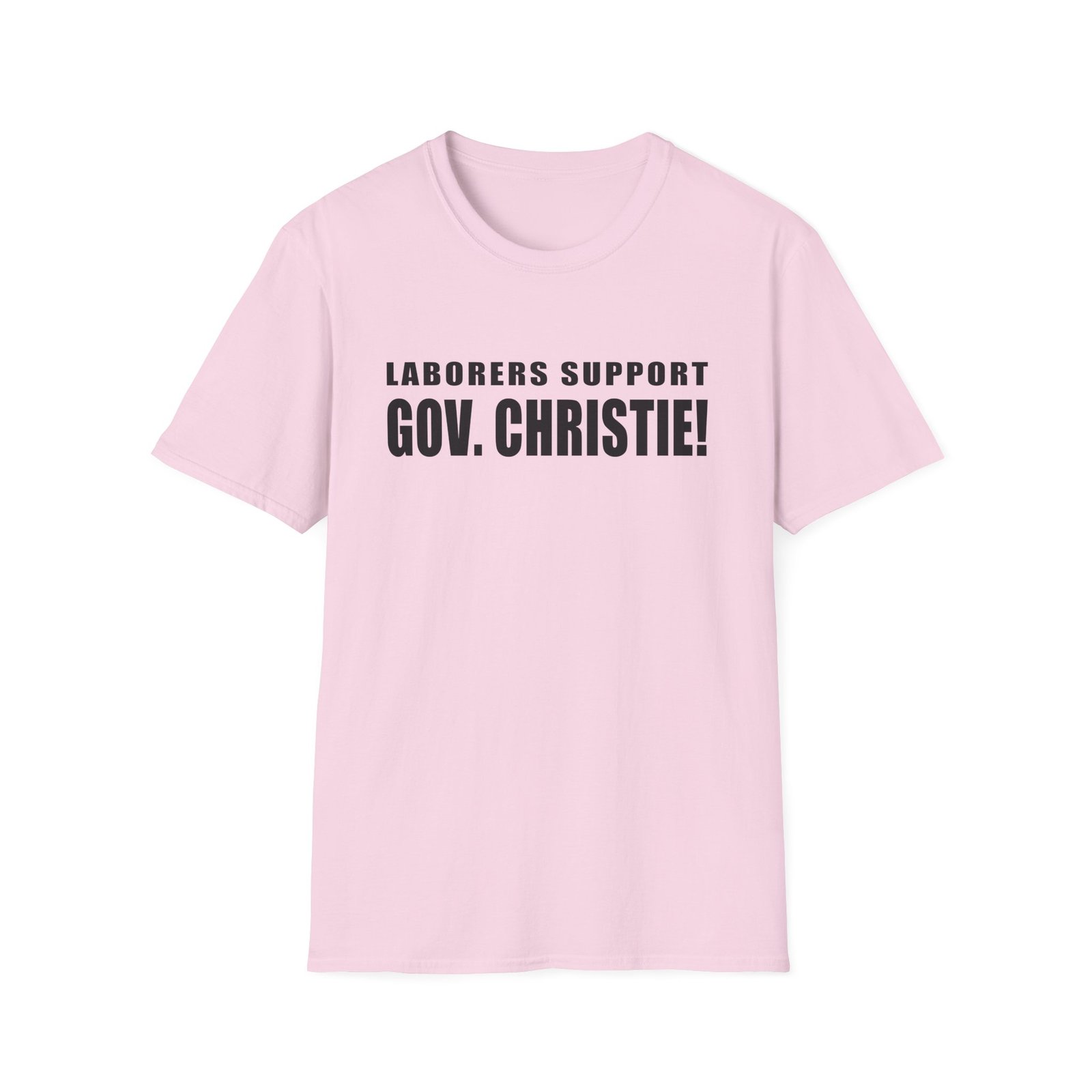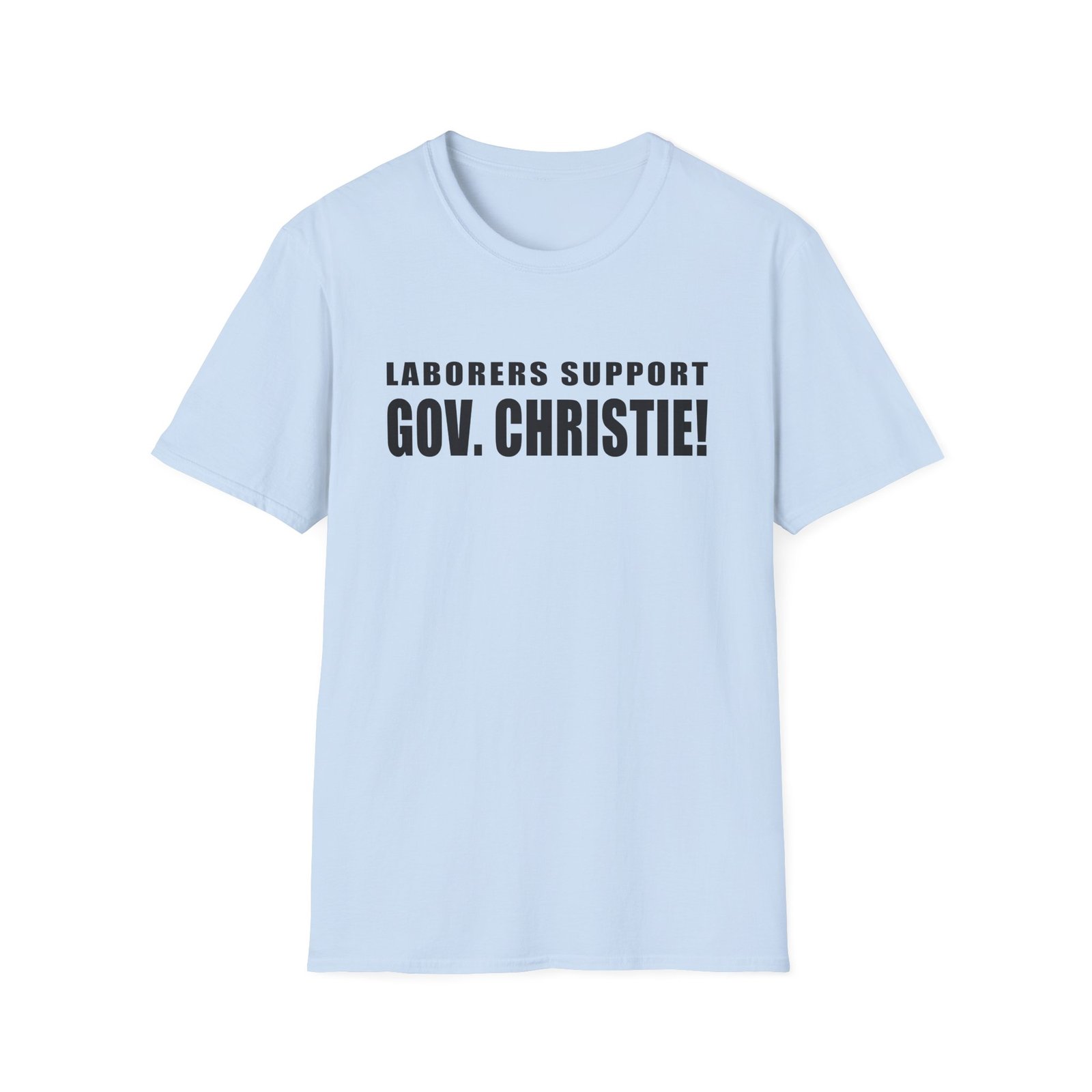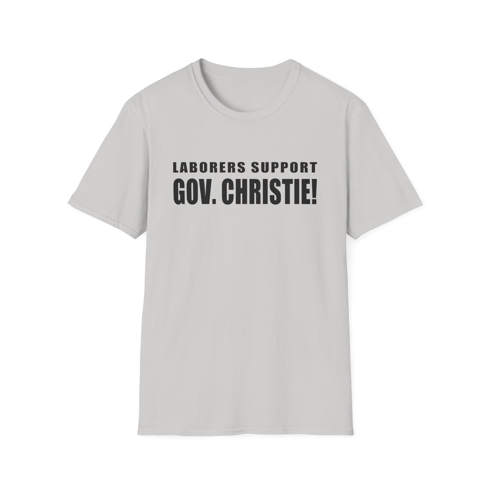The Laborers Support Gov. Christie unisex soft-style t-shirt puts a new spin on casual comfort. Made from very soft materials, this tee is 100% cotton for solid colors. Heather colors and sports grey include polyester. The shoulders have twill tape for improved durability. There are no side seams. The collar is made with ribbed knitting to prevent curling damage.