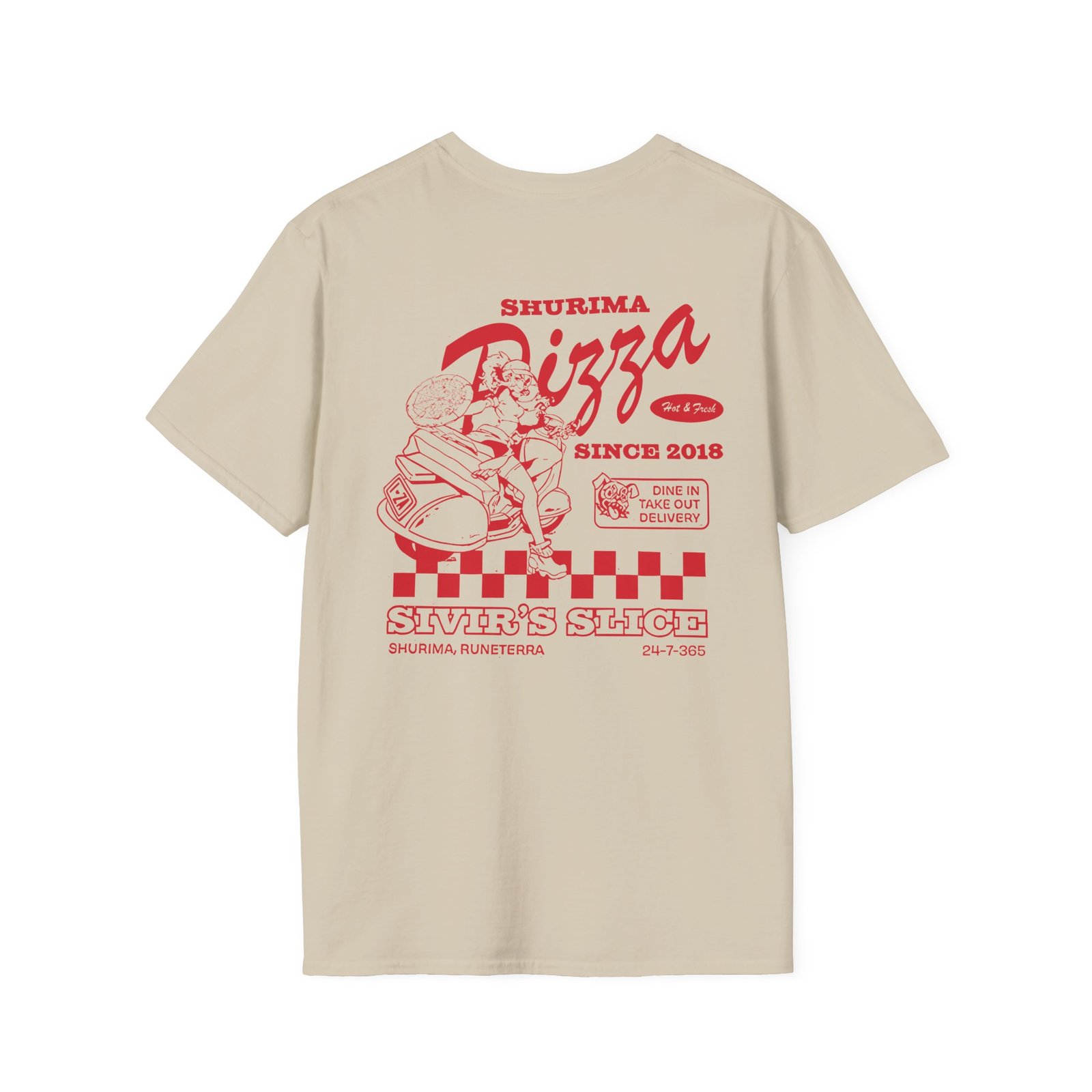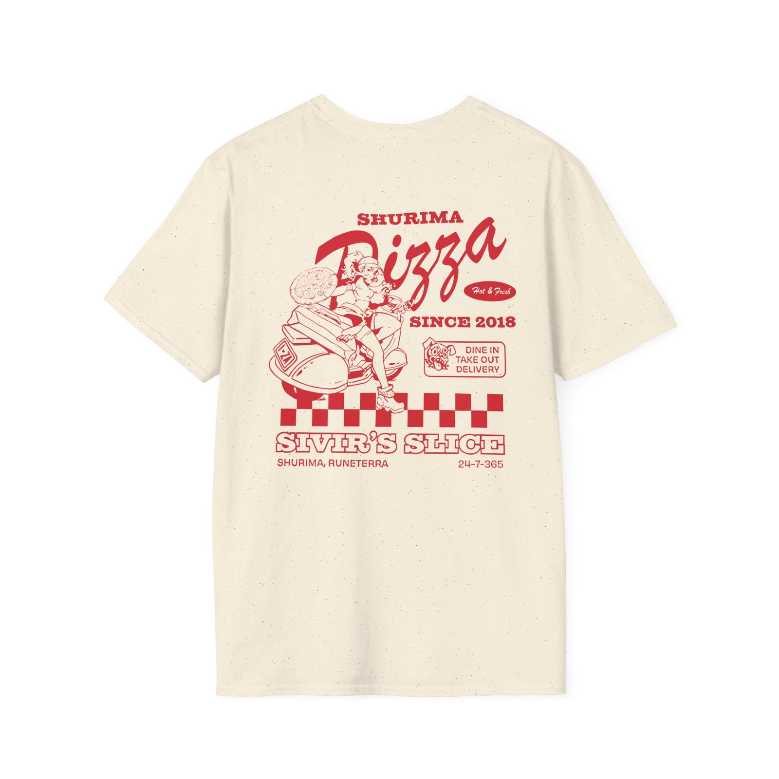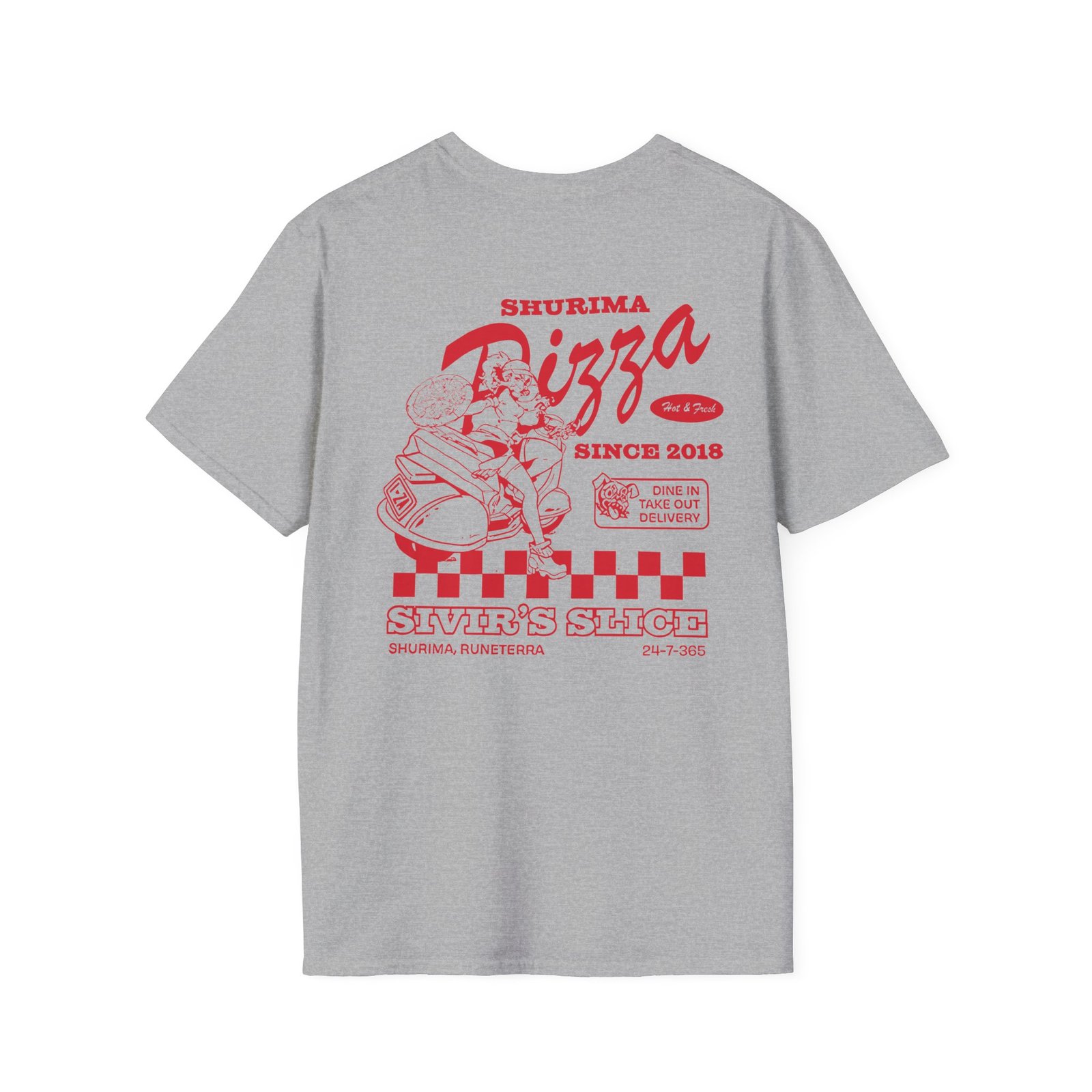 The League Of Legends Pizza Delivery Sivir unisex soft-style t-shirt puts a new spin on casual comfort. Made from very soft materials, this tee is 100% cotton for solid colors. Heather colors and sports grey include polyester. The shoulders have twill tape for improved durability. There are no side seams. The collar is made with ribbed knitting to prevent curling damage.