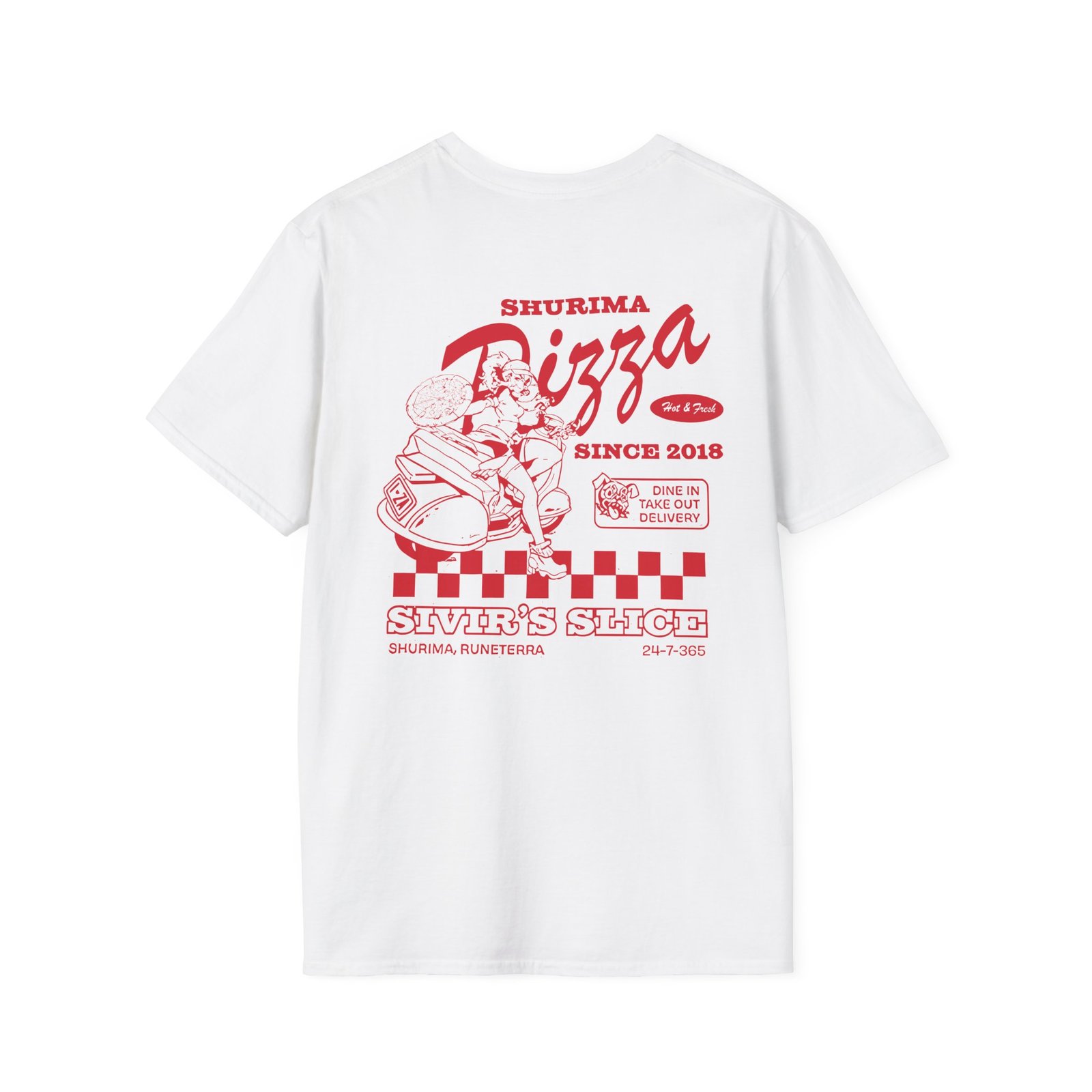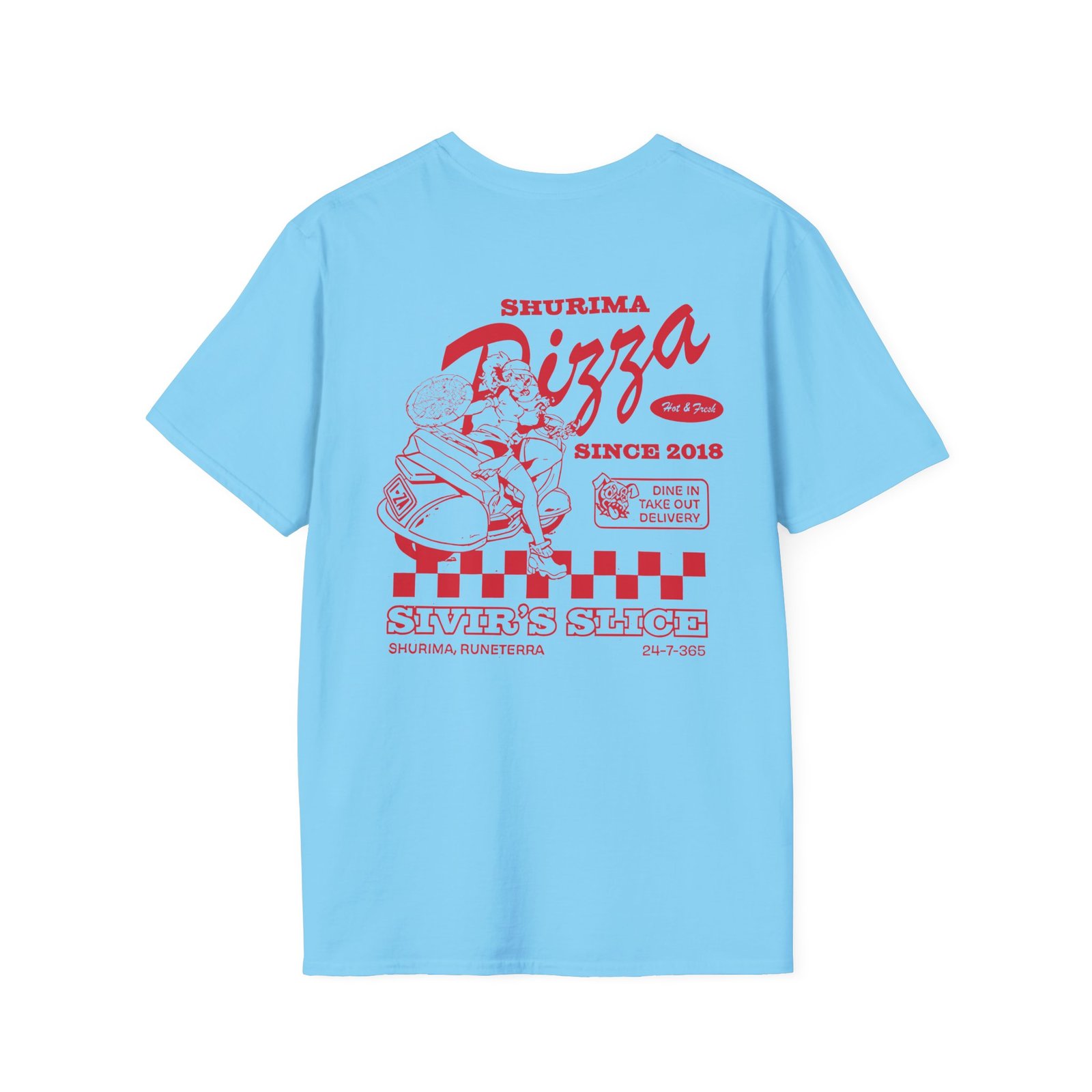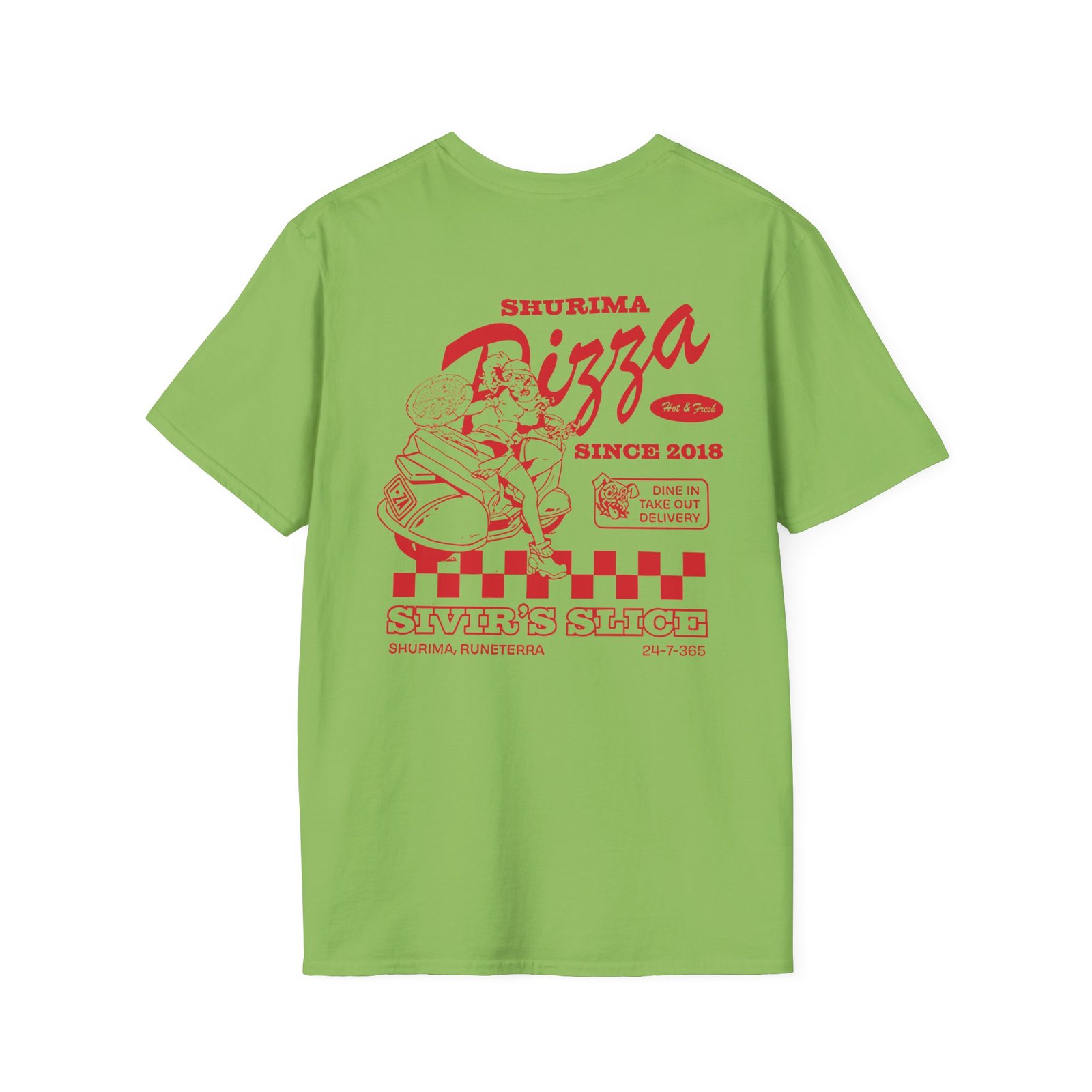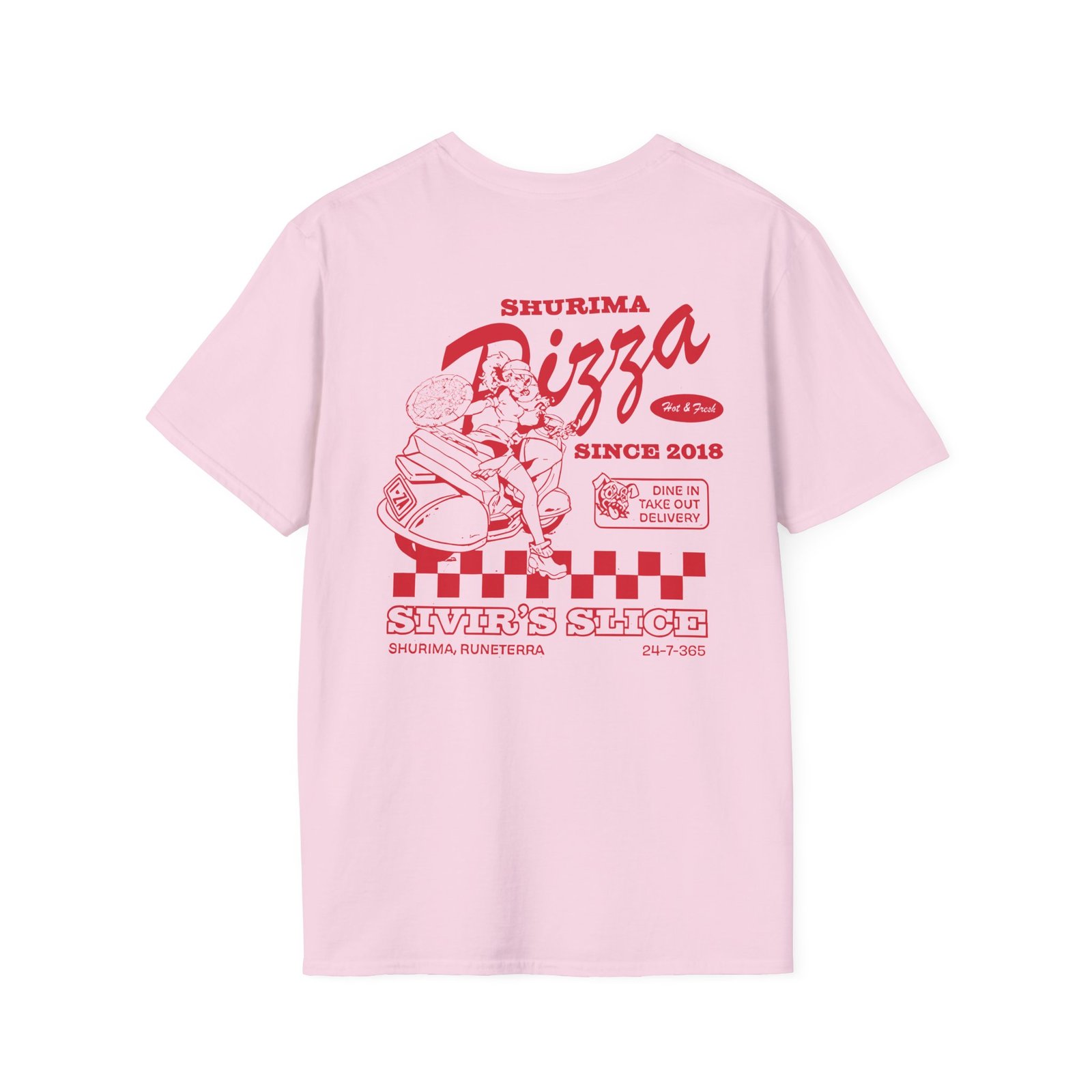 The League Of Legends Pizza Delivery Sivir unisex soft-style t-shirt puts a new spin on casual comfort. Made from very soft materials, this tee is 100% cotton for solid colors. Heather colors and sports grey include polyester. The shoulders have twill tape for improved durability. There are no side seams. The collar is made with ribbed knitting to prevent curling damage.