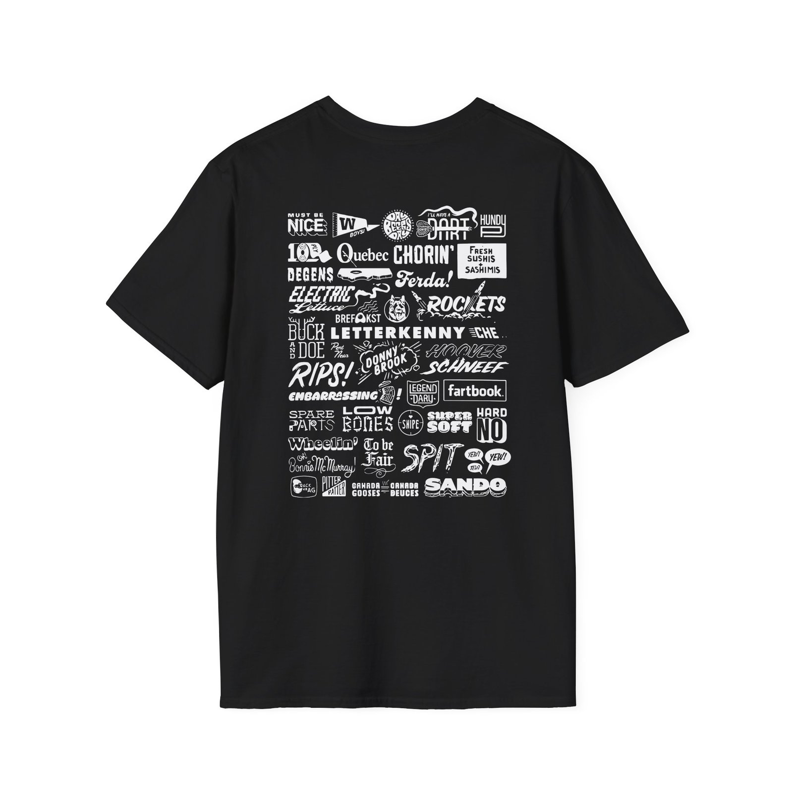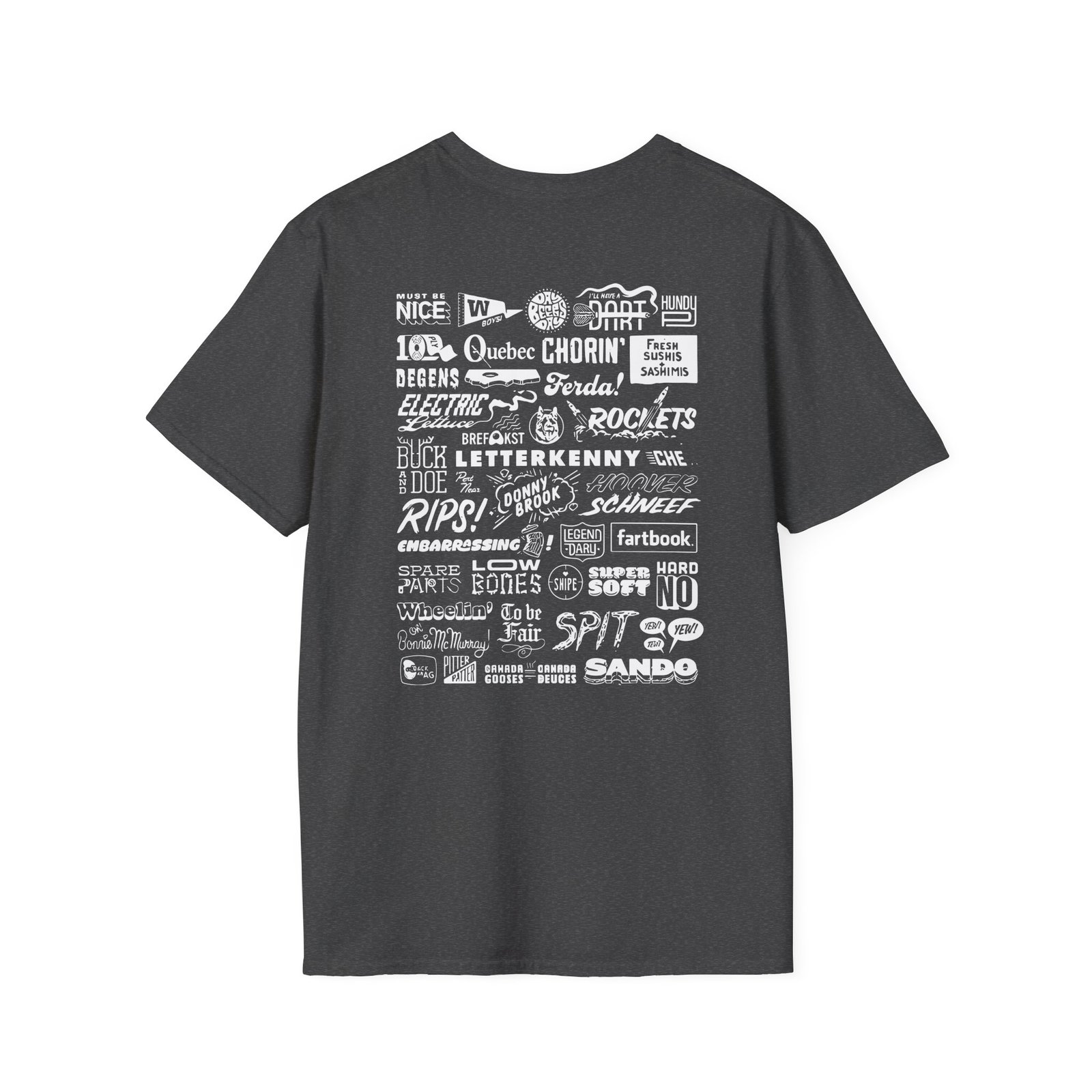 The Letterkenny Slogans unisex soft-style t-shirt puts a new spin on casual comfort. Made from very soft materials, this tee is 100% cotton for solid colors. Heather colors and sports grey include polyester. The shoulders have twill tape for improved durability. There are no side seams. The collar is made with ribbed knitting to prevent curling damage.