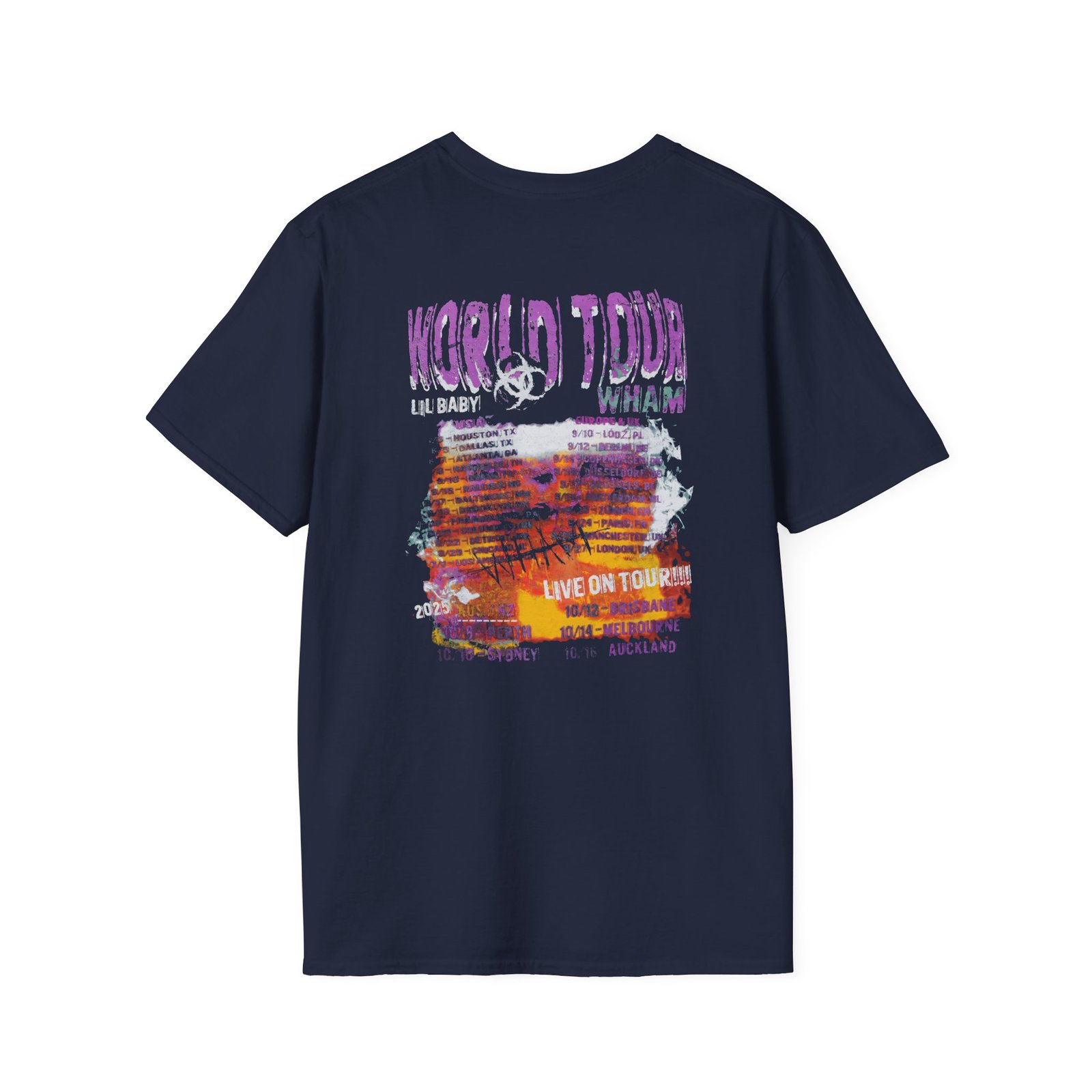 The Lil Baby Wham Tour unisex soft-style t-shirt puts a new spin on casual comfort. Made from very soft materials, this tee is 100% cotton for solid colors. Heather colors and sports grey include polyester. The shoulders have twill tape for improved durability. There are no side seams. The collar is made with ribbed knitting to prevent curling damage.