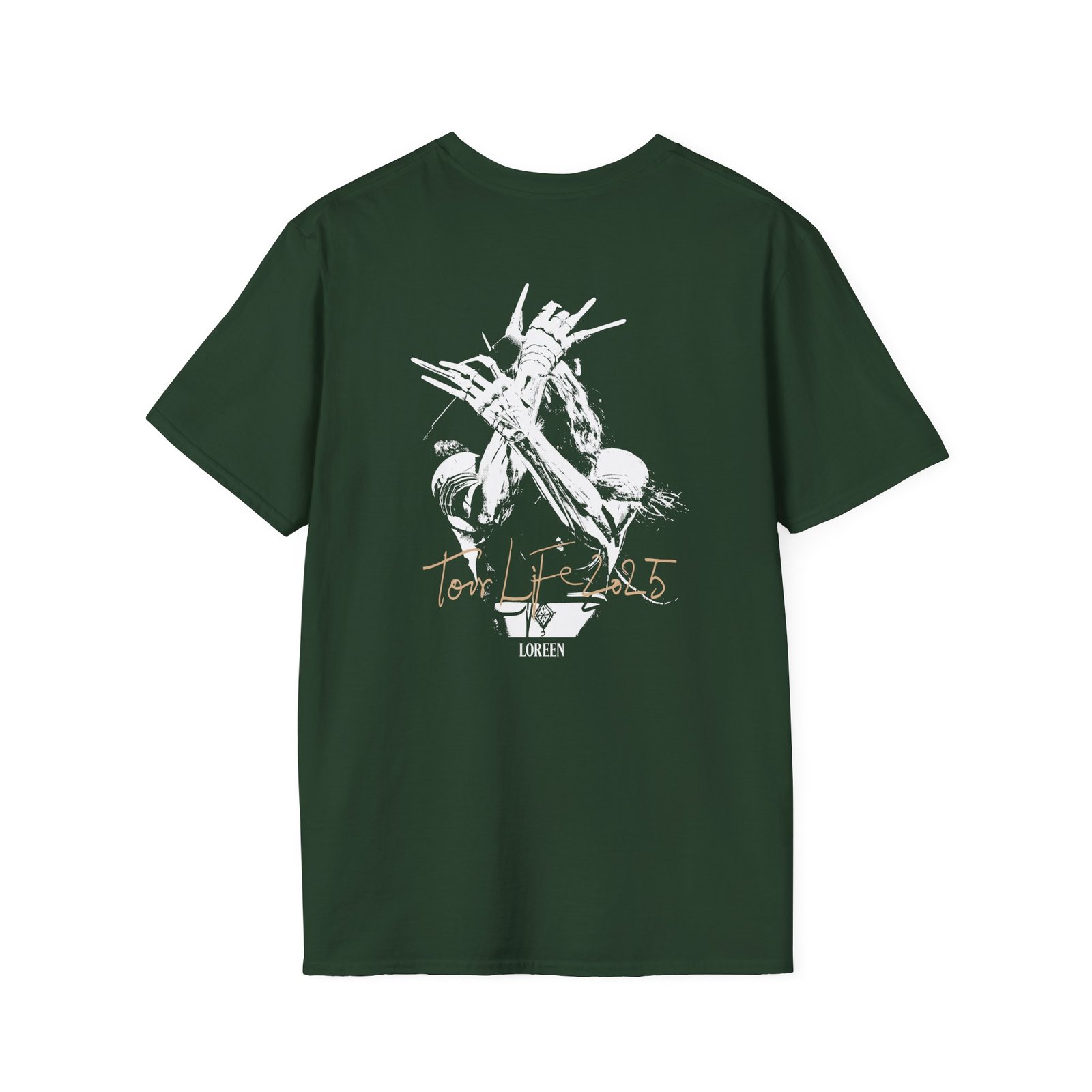 The Loreen 2025 Tour unisex soft-style t-shirt puts a new spin on casual comfort. Made from very soft materials, this tee is 100% cotton for solid colors. Heather colors and sports grey include polyester. The shoulders have twill tape for improved durability. There are no side seams. The collar is made with ribbed knitting to prevent curling damage.