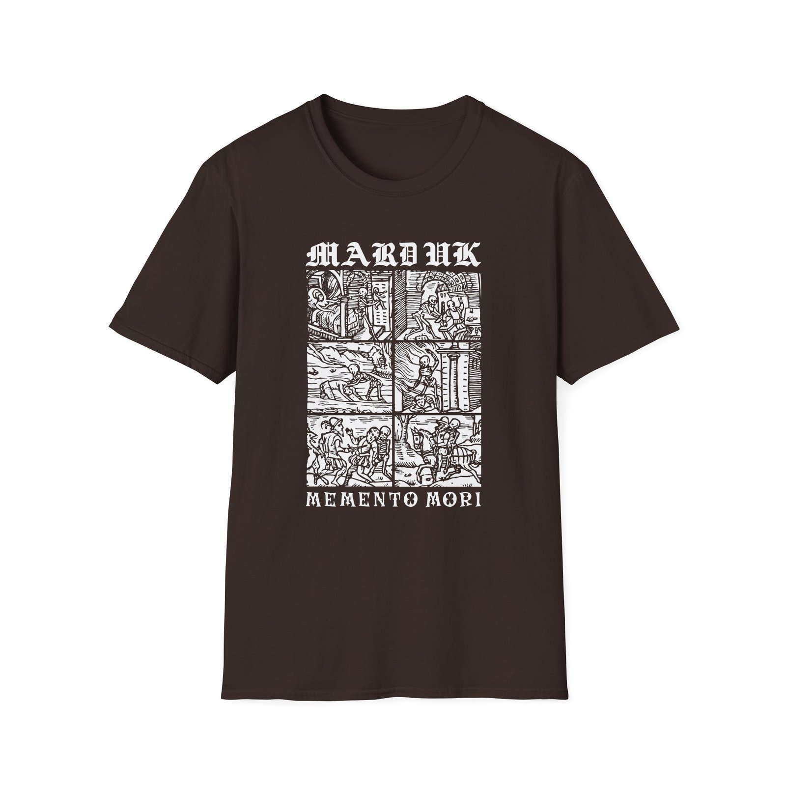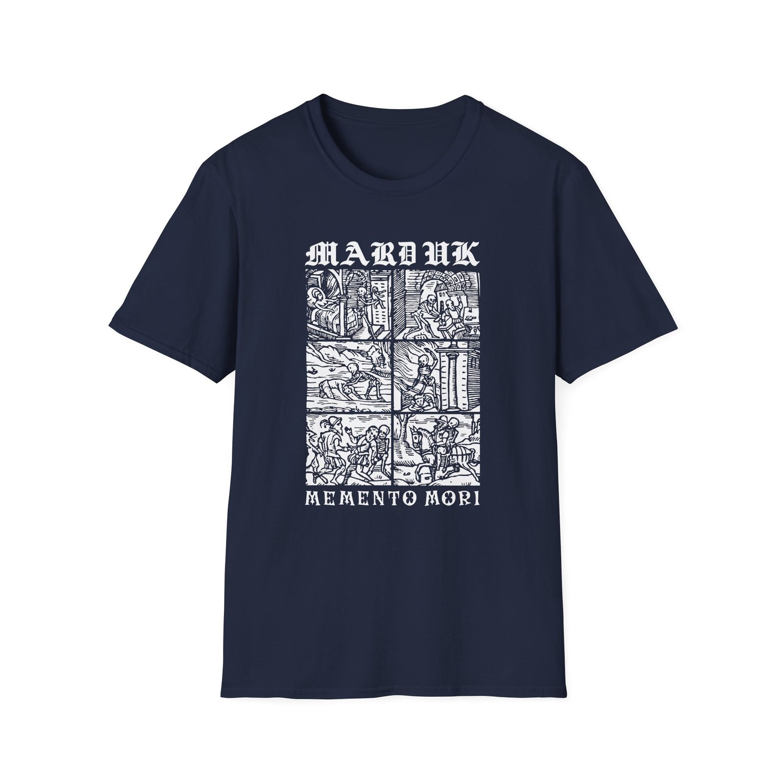 The Marduk Memento Mori unisex soft-style t-shirt puts a new spin on casual comfort. Made from very soft materials, this tee is 100% cotton for solid colors. Heather colors and sports grey include polyester. The shoulders have twill tape for improved durability. There are no side seams. The collar is made with ribbed knitting to prevent curling damage.