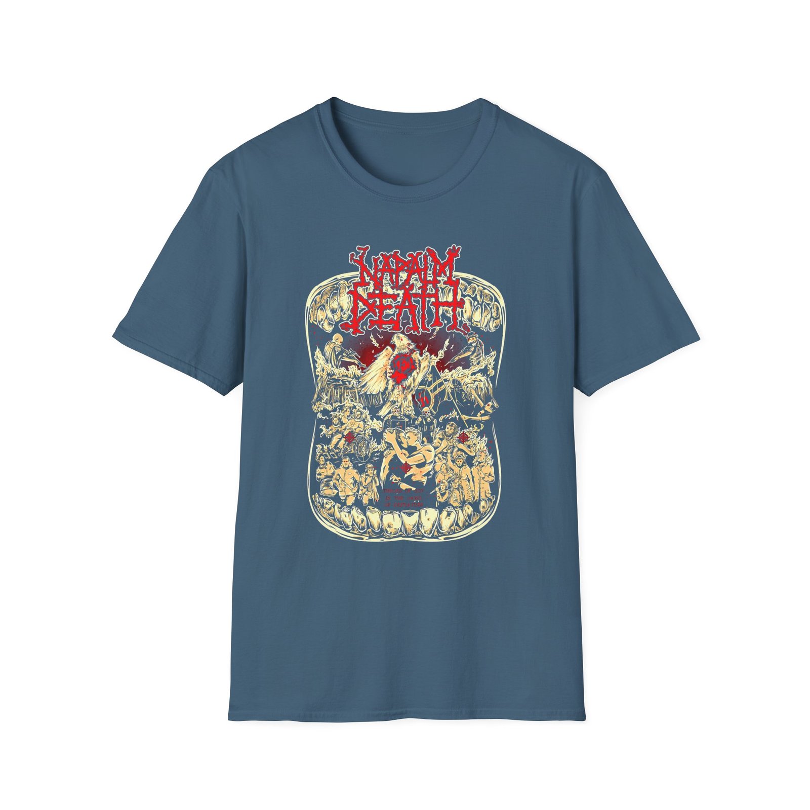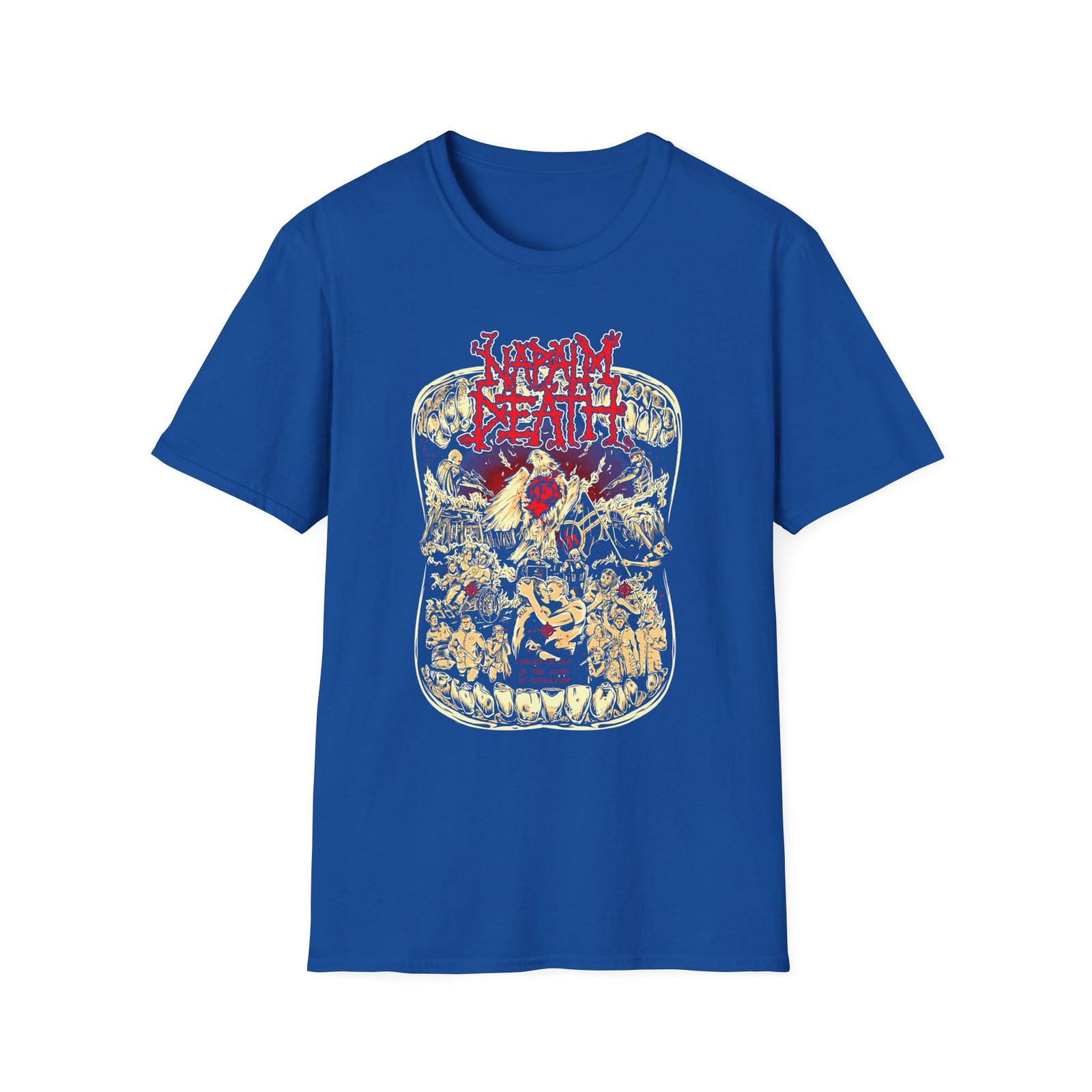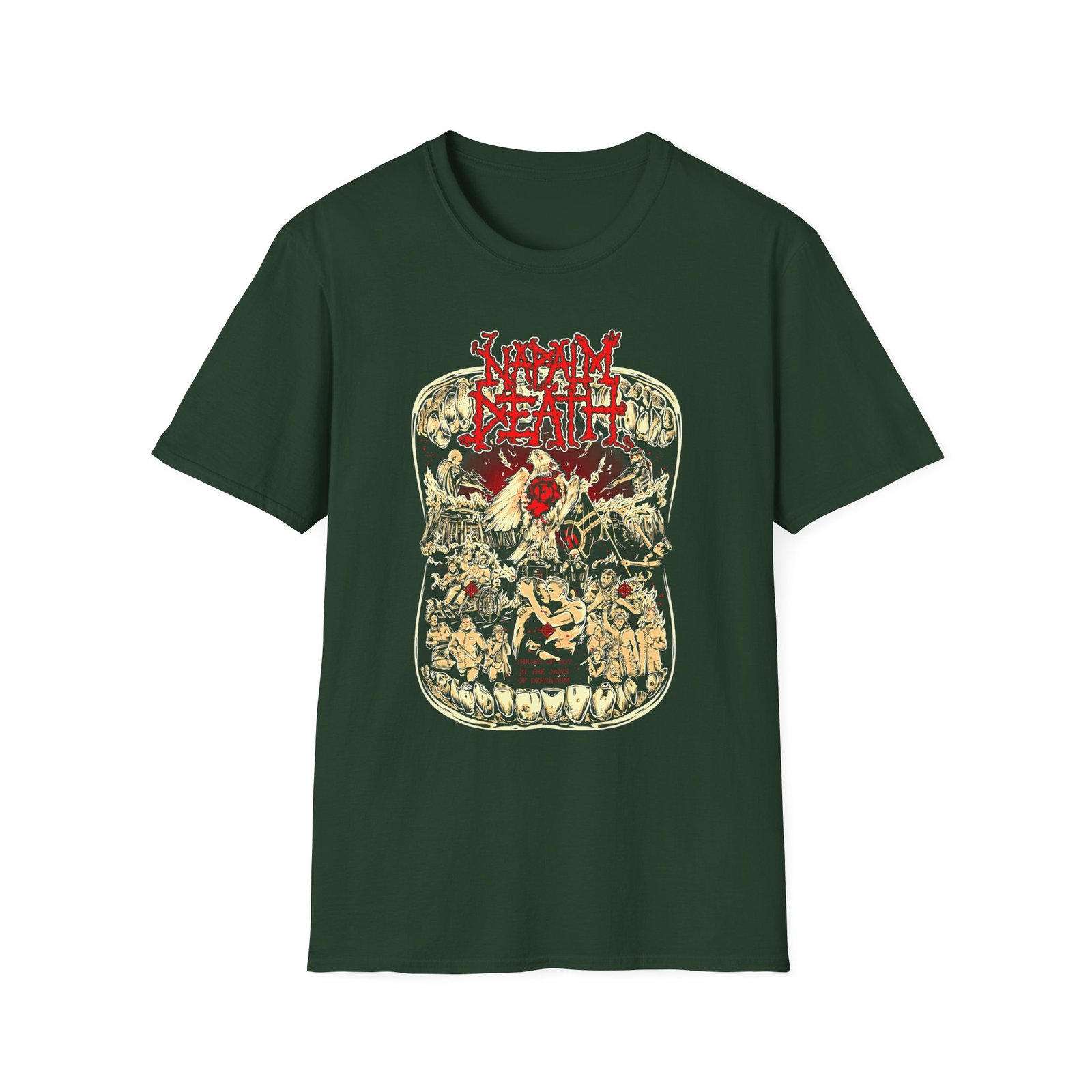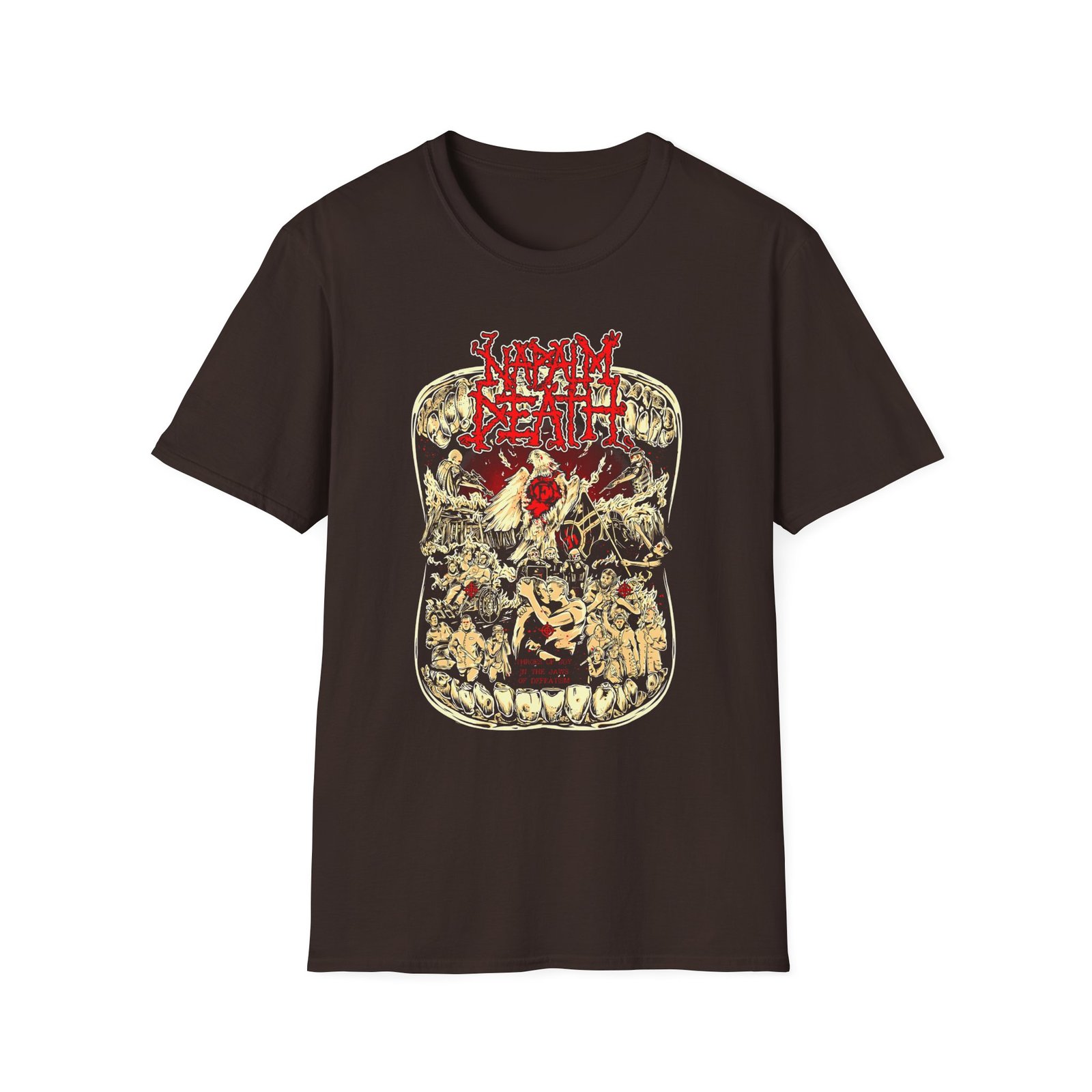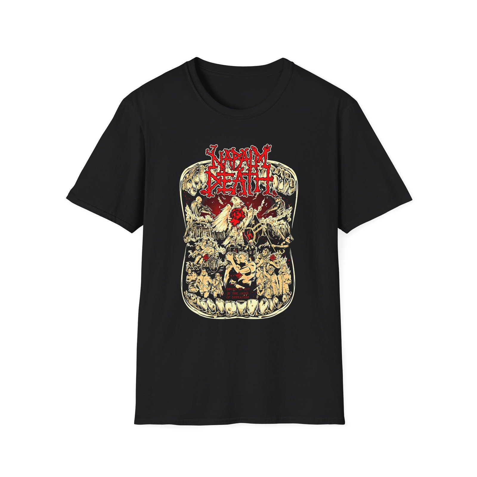 The Napalm Death Throes of Joy unisex soft-style t-shirt puts a new spin on casual comfort. Made from very soft materials, this tee is 100% cotton for solid colors. Heather colors and sports grey include polyester. The shoulders have twill tape for improved durability. There are no side seams. The collar is made with ribbed knitting to prevent curling damage.