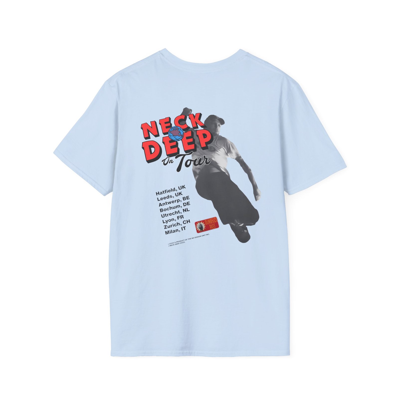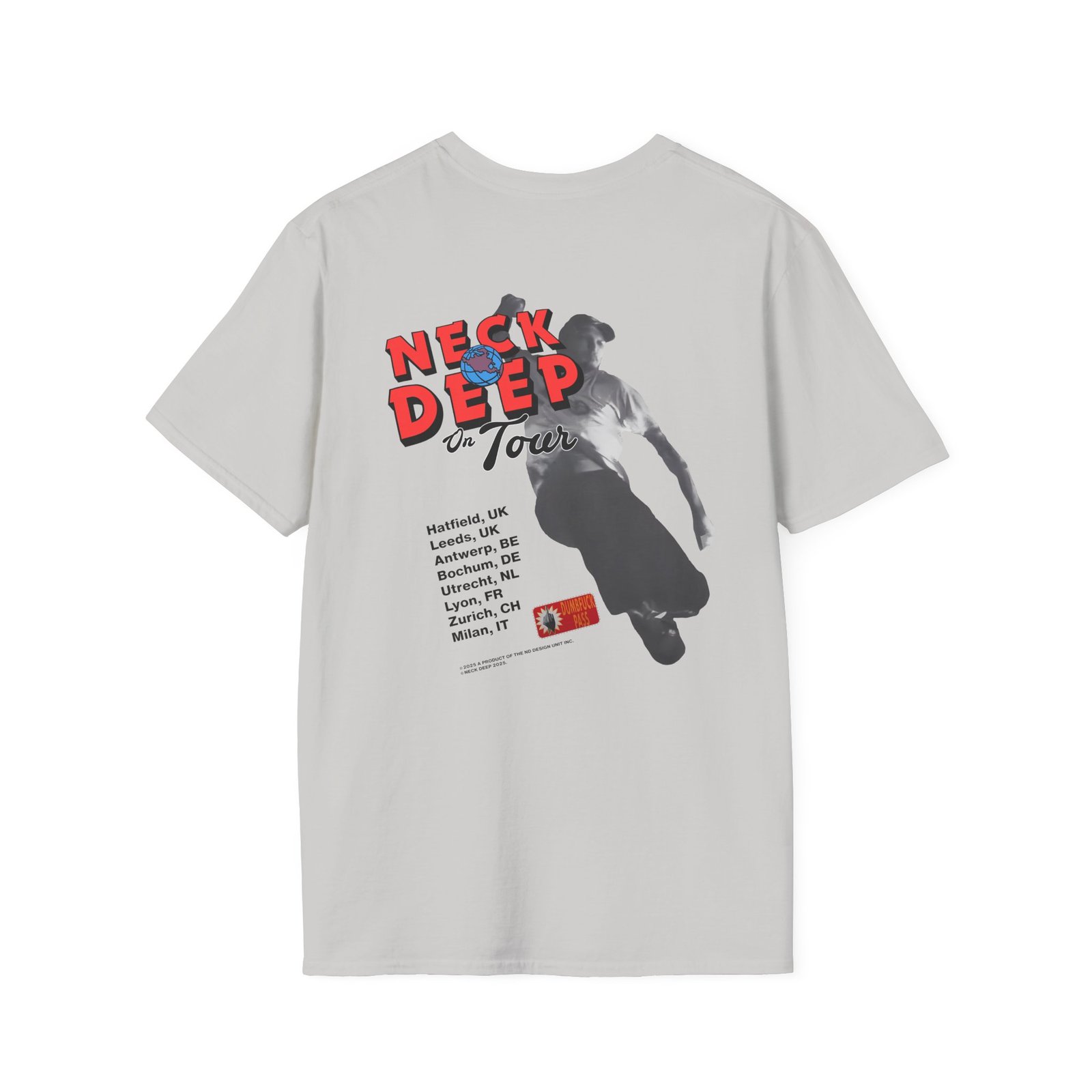 The Neck Deep Slam Dunk 25 Tour unisex soft-style t-shirt puts a new spin on casual comfort. Made from very soft materials, this tee is 100% cotton for solid colors. Heather colors and sports grey include polyester. The shoulders have twill tape for improved durability. There are no side seams. The collar is made with ribbed knitting to prevent curling damage.