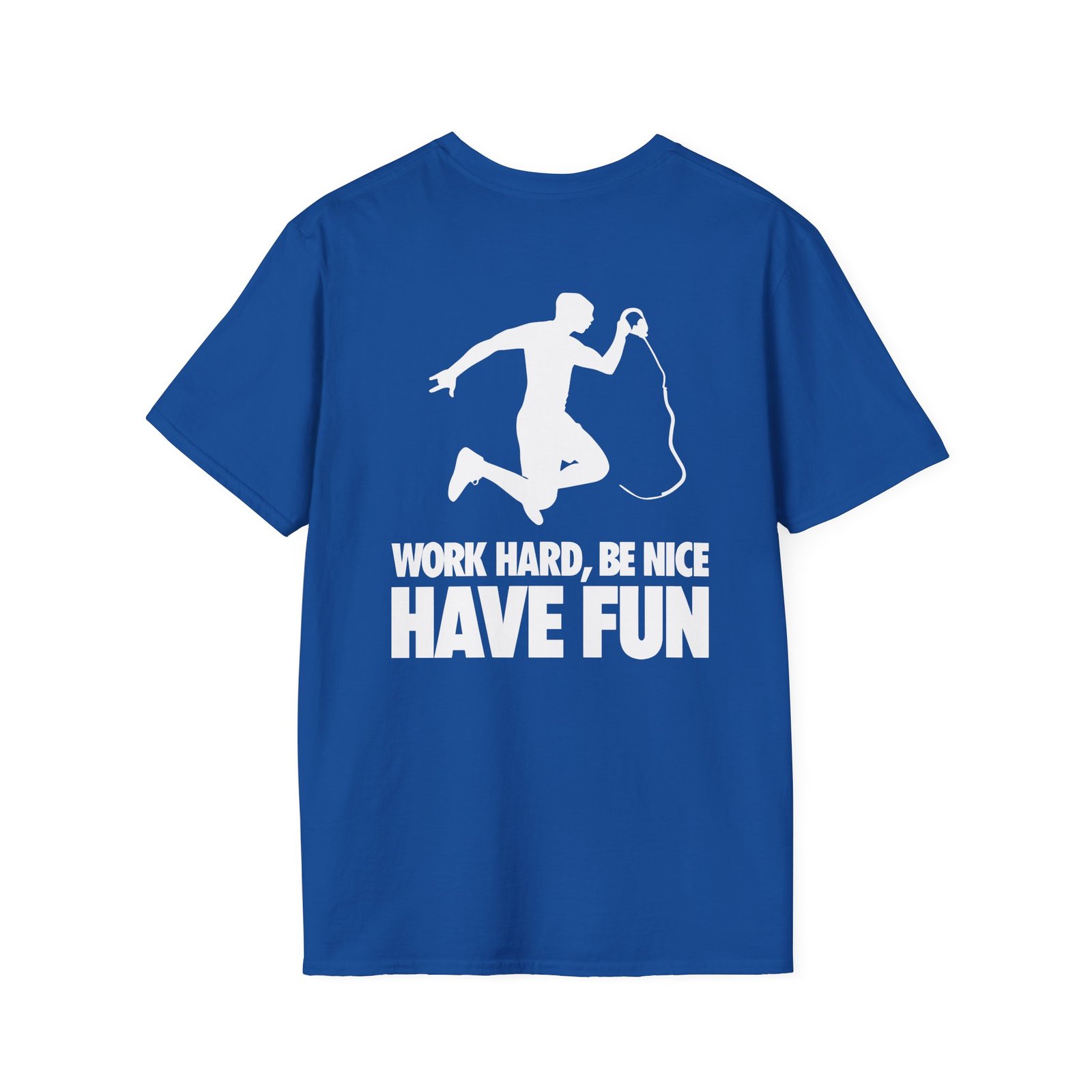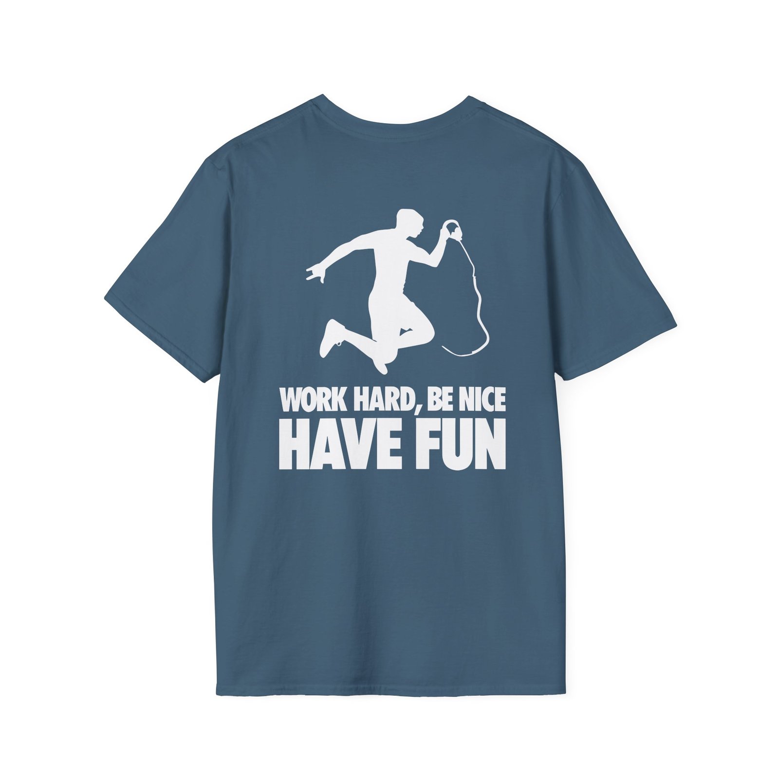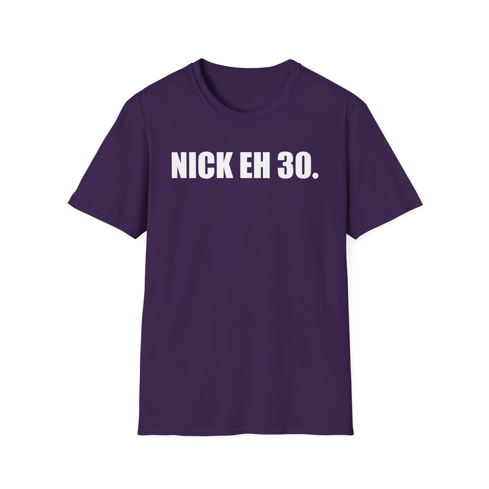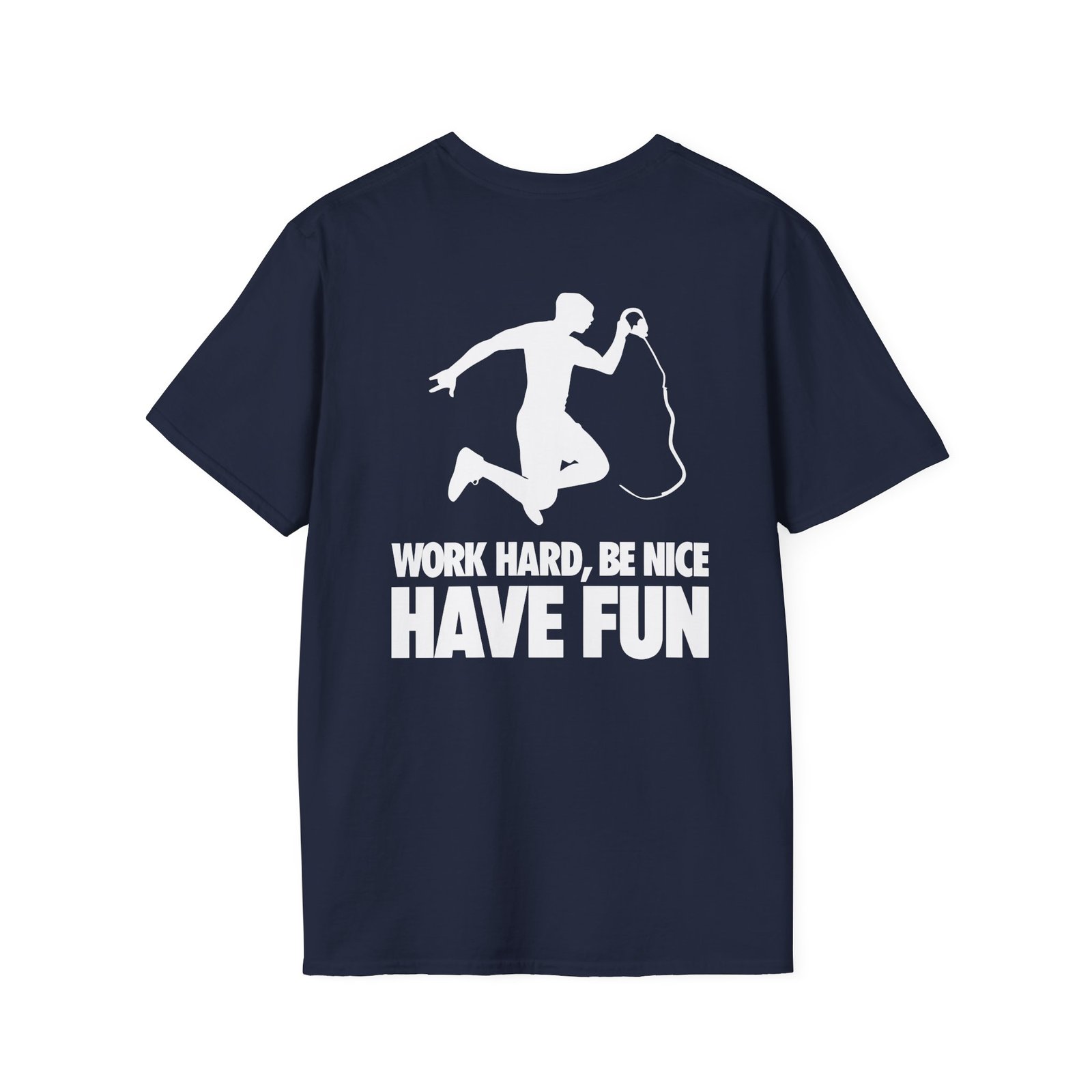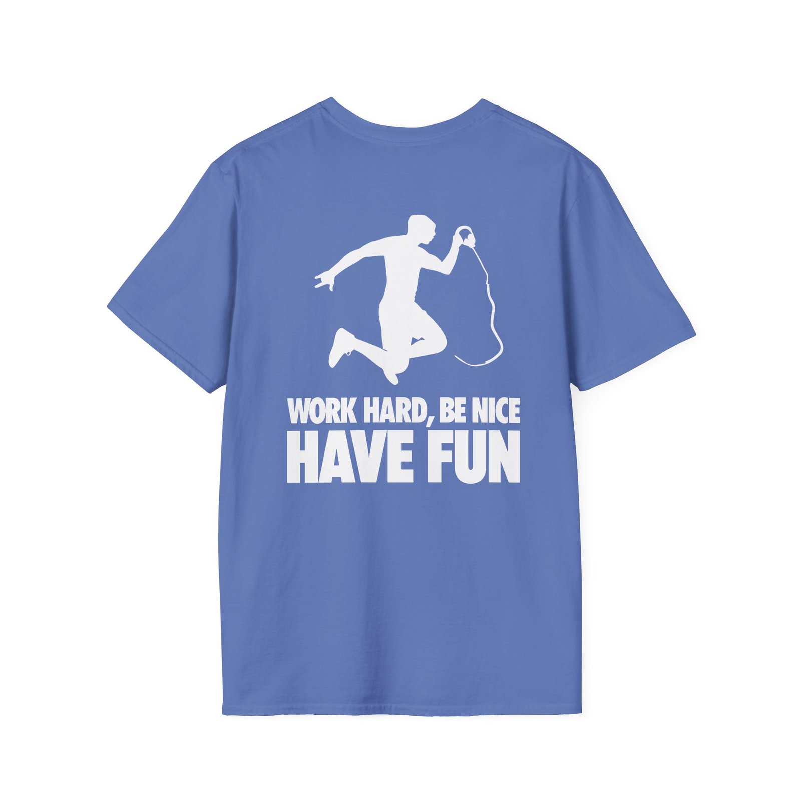 The Nick Eh 30 Work Hard, Be Nice Have Fun unisex soft-style t-shirt puts a new spin on casual comfort. Made from very soft materials, this tee is 100% cotton for solid colors. Heather colors and sports grey include polyester. The shoulders have twill tape for improved durability. There are no side seams. The collar is made with ribbed knitting to prevent curling damage.