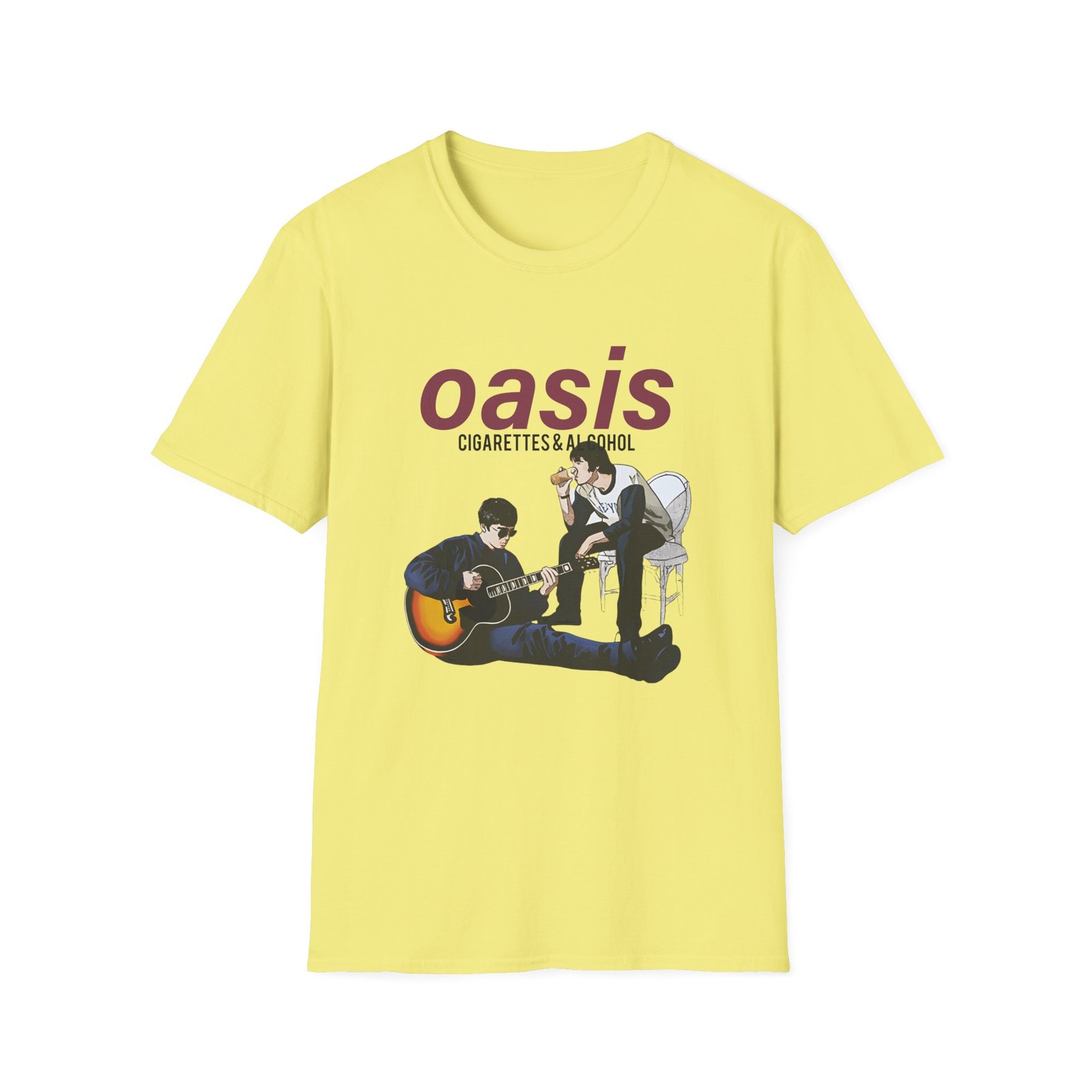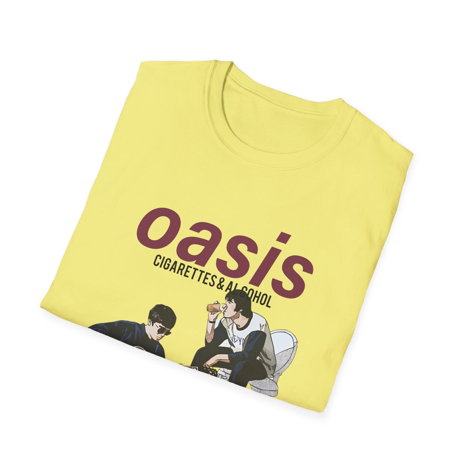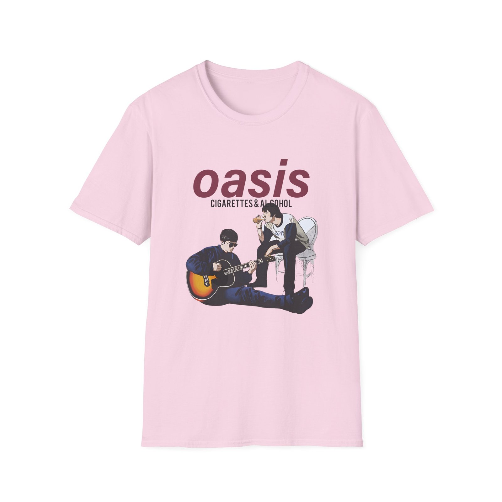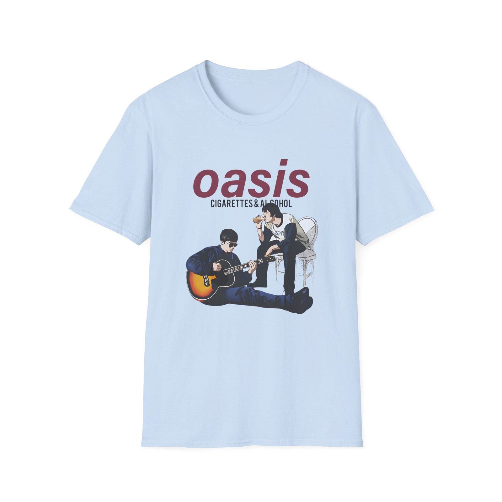 The Oasis Cigarettes and Alcohol Illustration unisex soft-style t-shirt puts a new spin on casual comfort. Made from very soft materials, this tee is 100% cotton for solid colors. Heather colors and sports grey include polyester. The shoulders have twill tape for improved durability. There are no side seams. The collar is made with ribbed knitting to prevent curling damage.