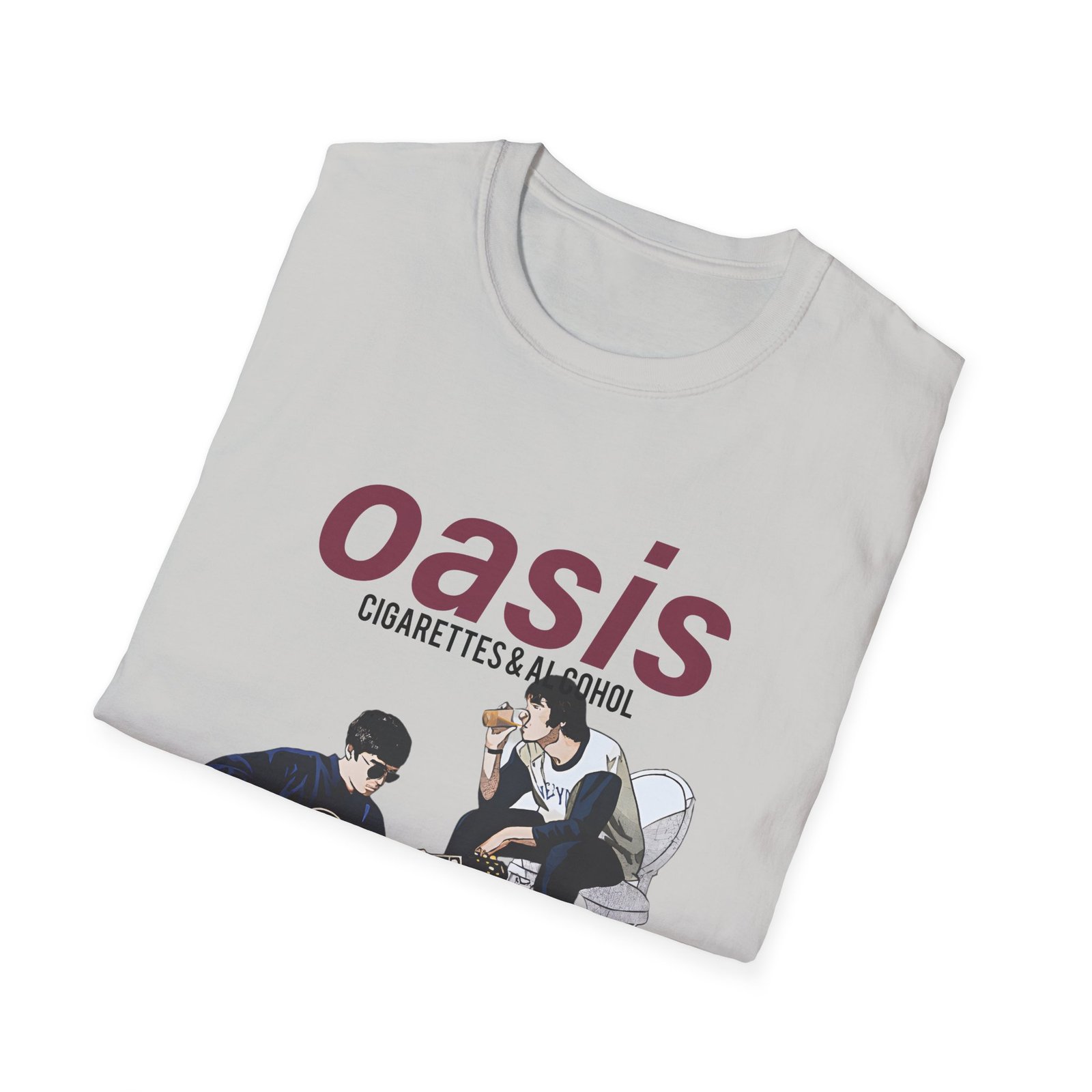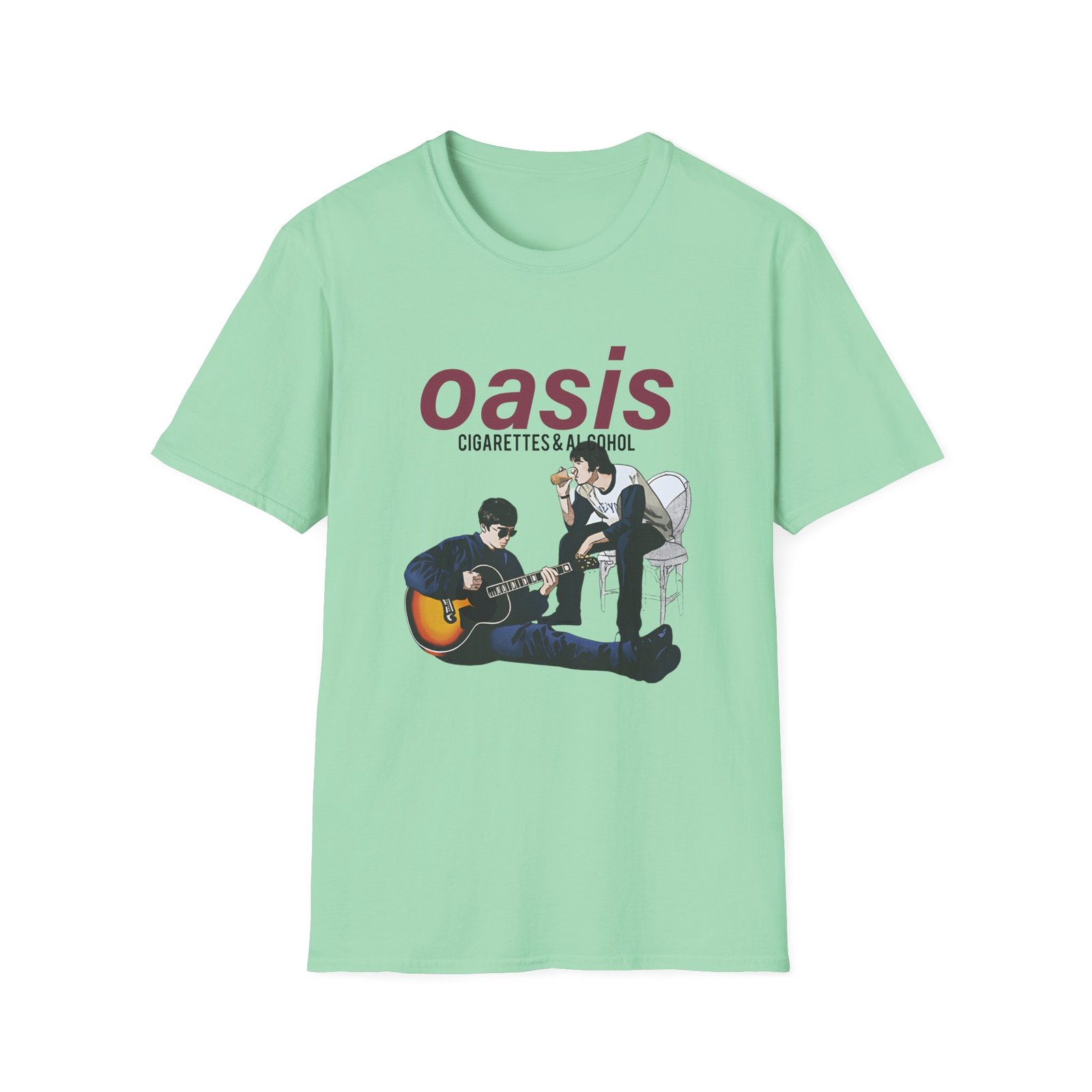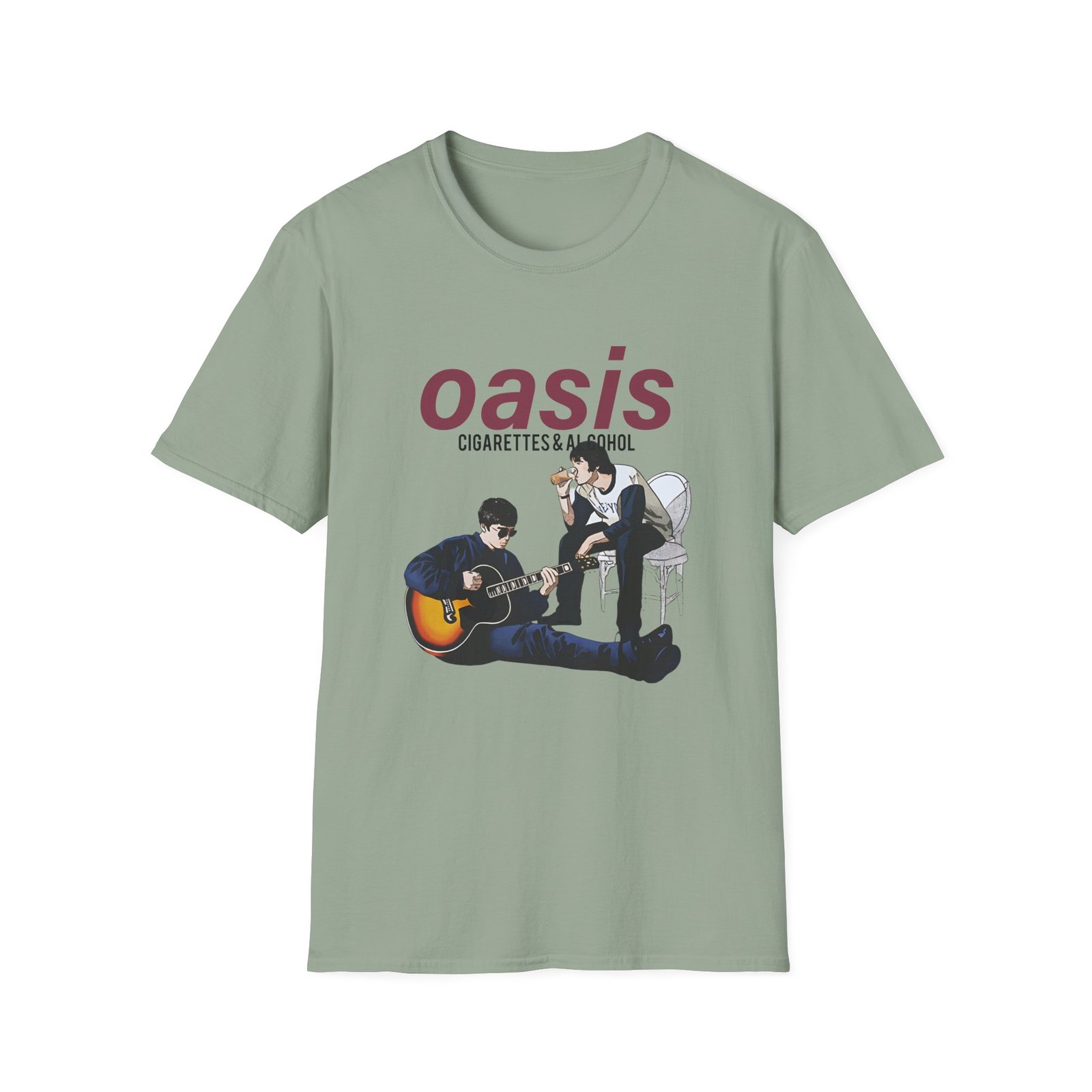 The Oasis Cigarettes and Alcohol Illustration unisex soft-style t-shirt puts a new spin on casual comfort. Made from very soft materials, this tee is 100% cotton for solid colors. Heather colors and sports grey include polyester. The shoulders have twill tape for improved durability. There are no side seams. The collar is made with ribbed knitting to prevent curling damage.