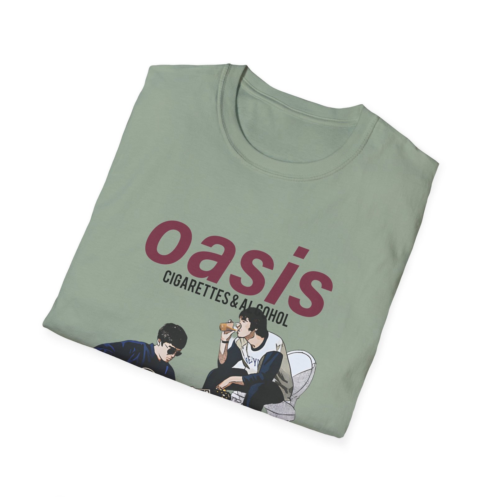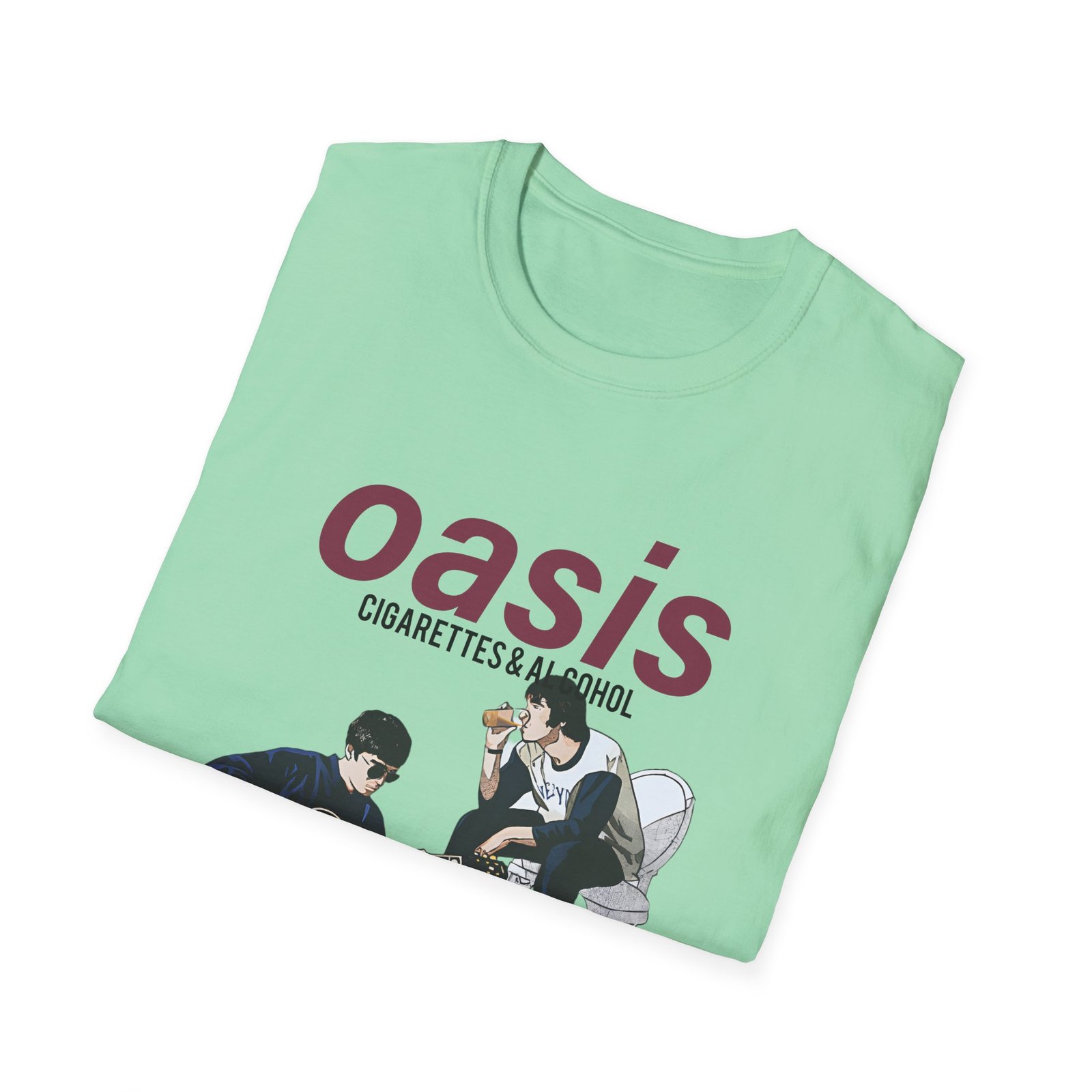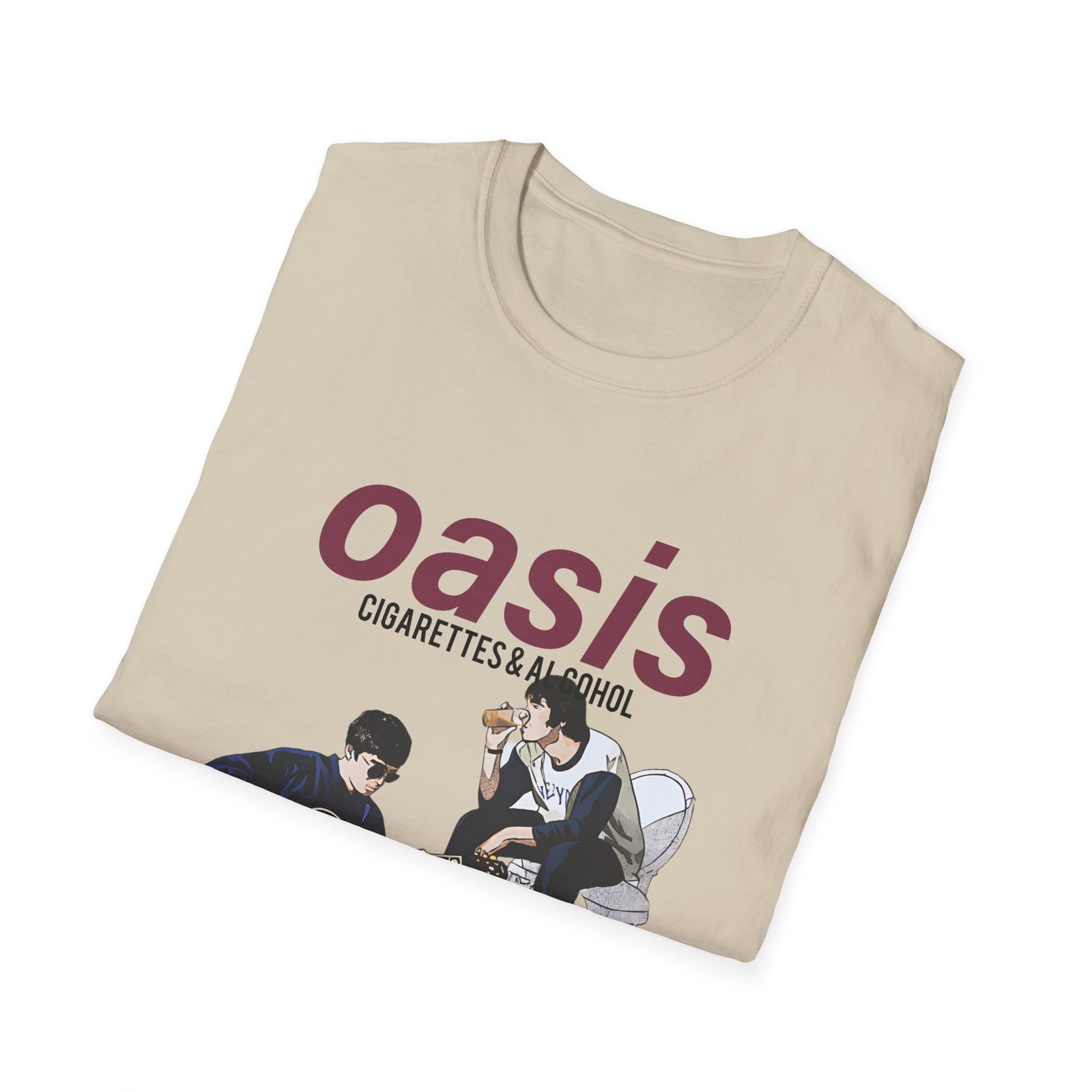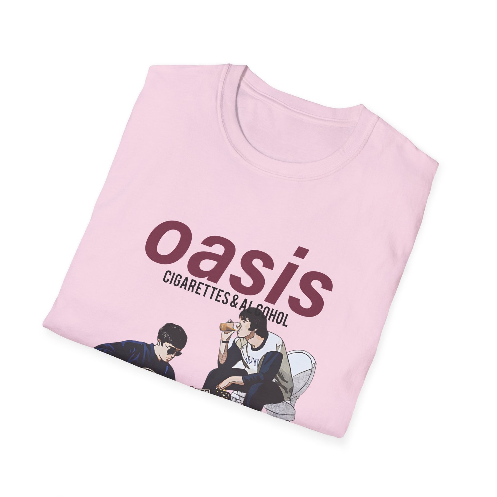 The Oasis Cigarettes and Alcohol Illustration unisex soft-style t-shirt puts a new spin on casual comfort. Made from very soft materials, this tee is 100% cotton for solid colors. Heather colors and sports grey include polyester. The shoulders have twill tape for improved durability. There are no side seams. The collar is made with ribbed knitting to prevent curling damage.
