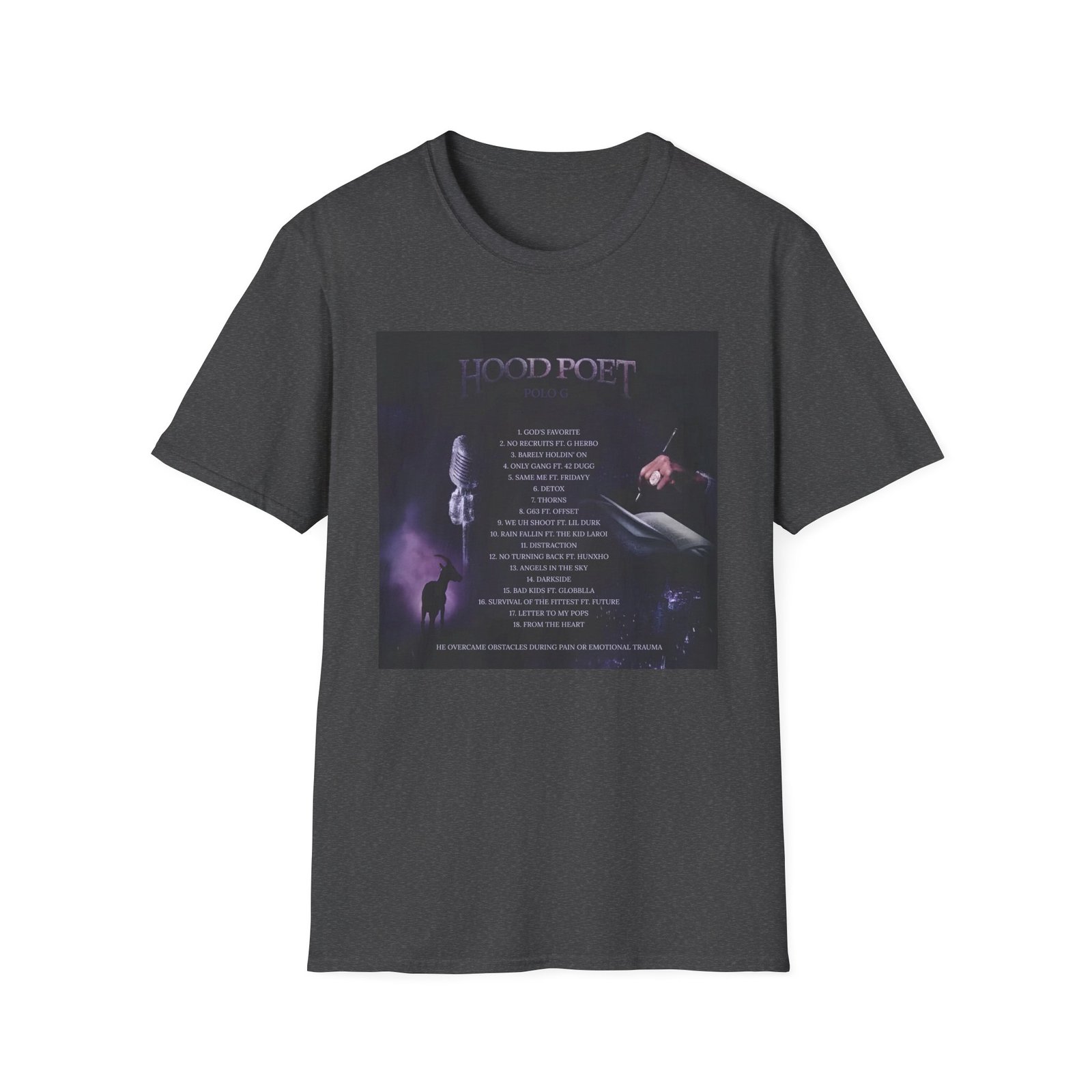 The Polo G Hood Poet unisex soft-style t-shirt puts a new spin on casual comfort. Made from very soft materials, this tee is 100% cotton for solid colors. Heather colors and sports grey include polyester. The shoulders have twill tape for improved durability. There are no side seams. The collar is made with ribbed knitting to prevent curling damage.
