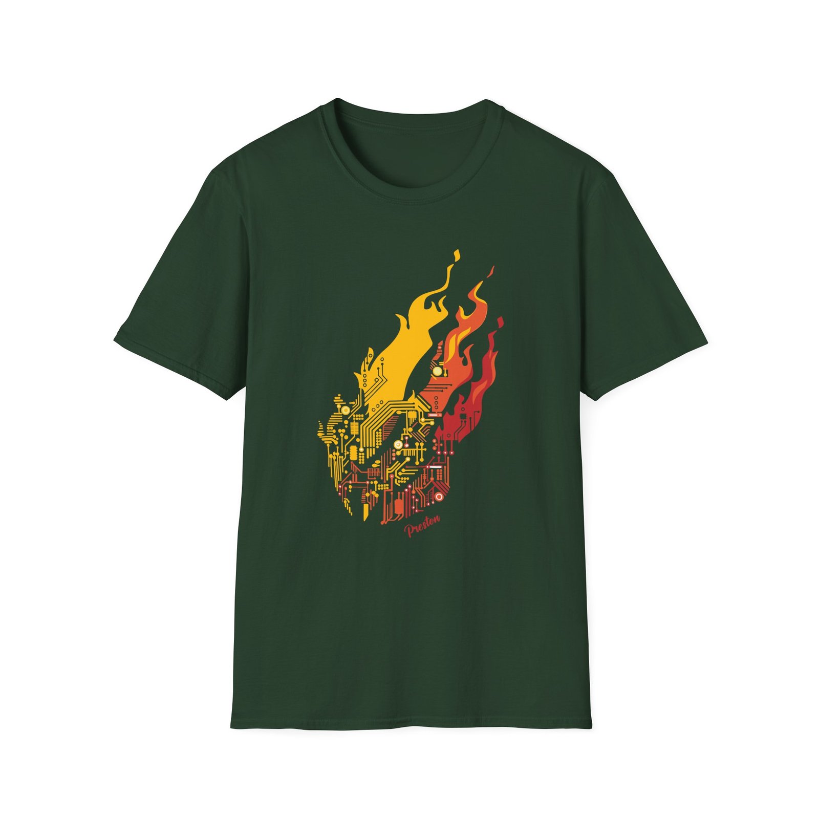 The Preston Circuit Flame unisex soft-style t-shirt puts a new spin on casual comfort. Made from very soft materials, this tee is 100% cotton for solid colors. Heather colors and sports grey include polyester. The shoulders have twill tape for improved durability. There are no side seams. The collar is made with ribbed knitting to prevent curling damage.