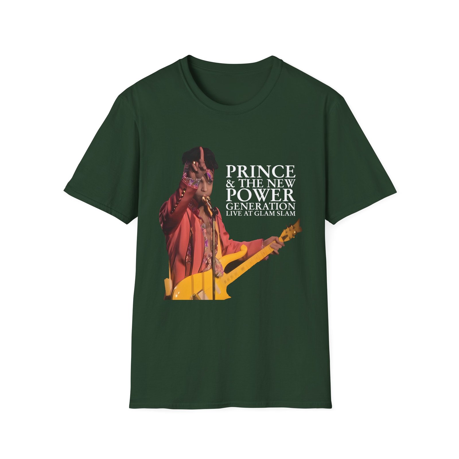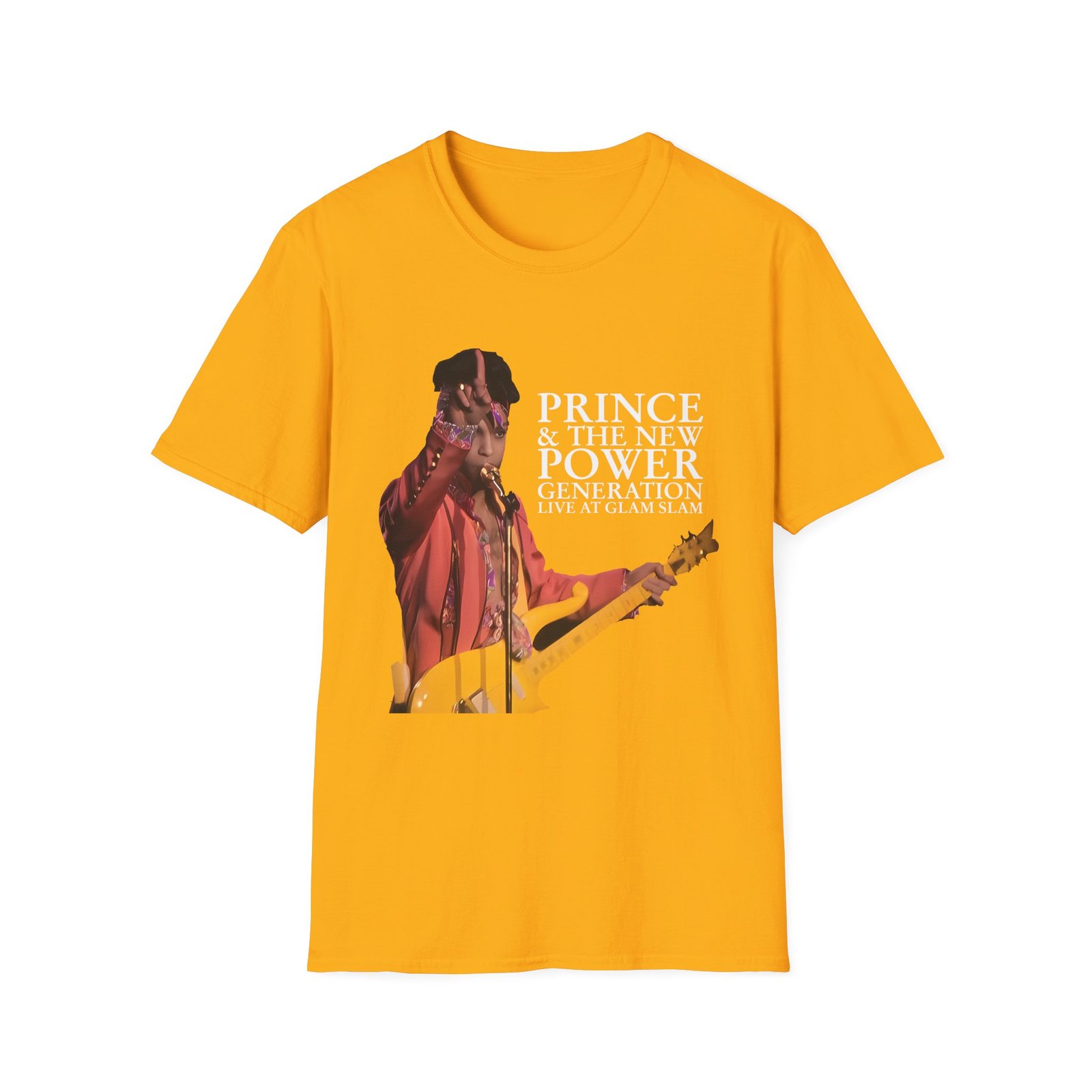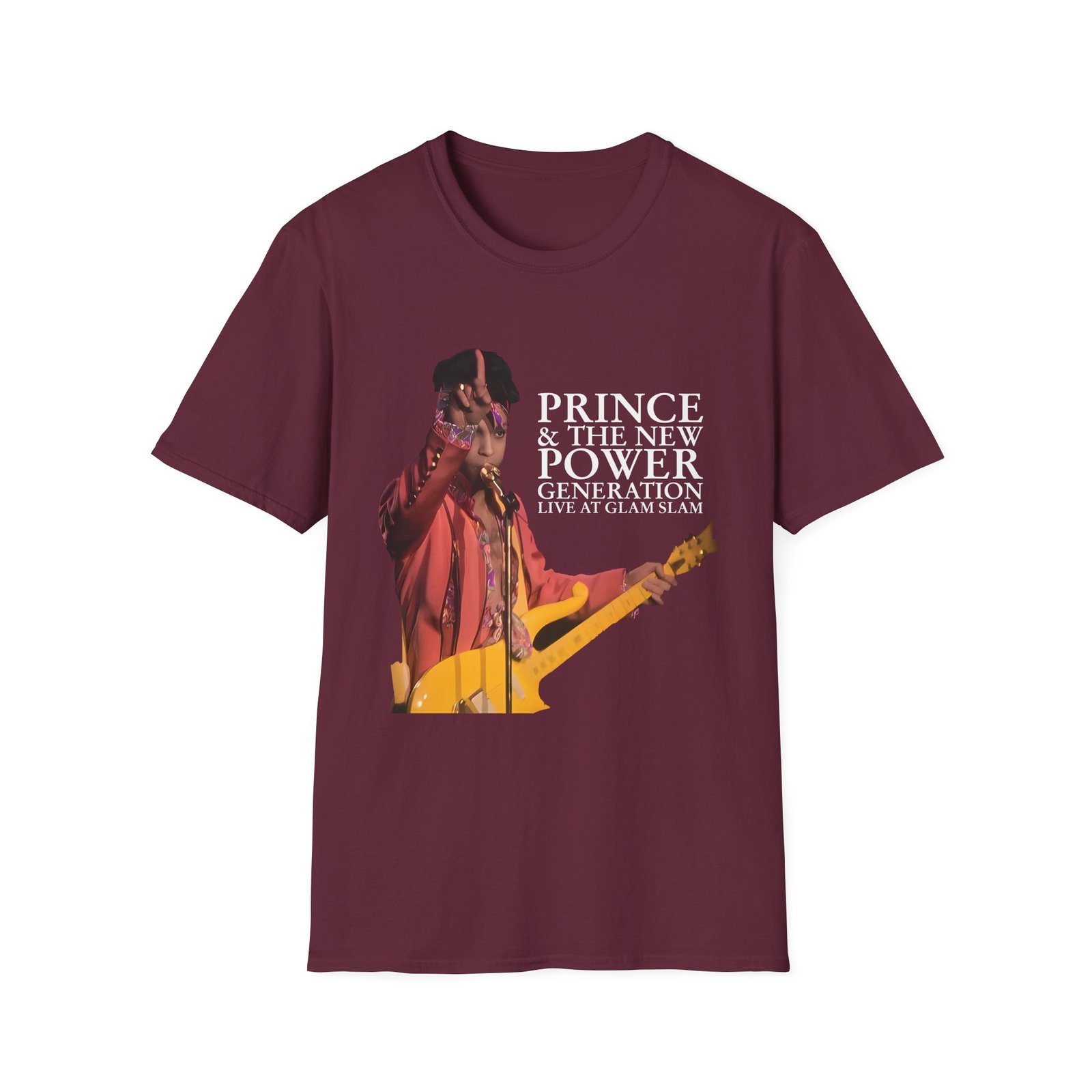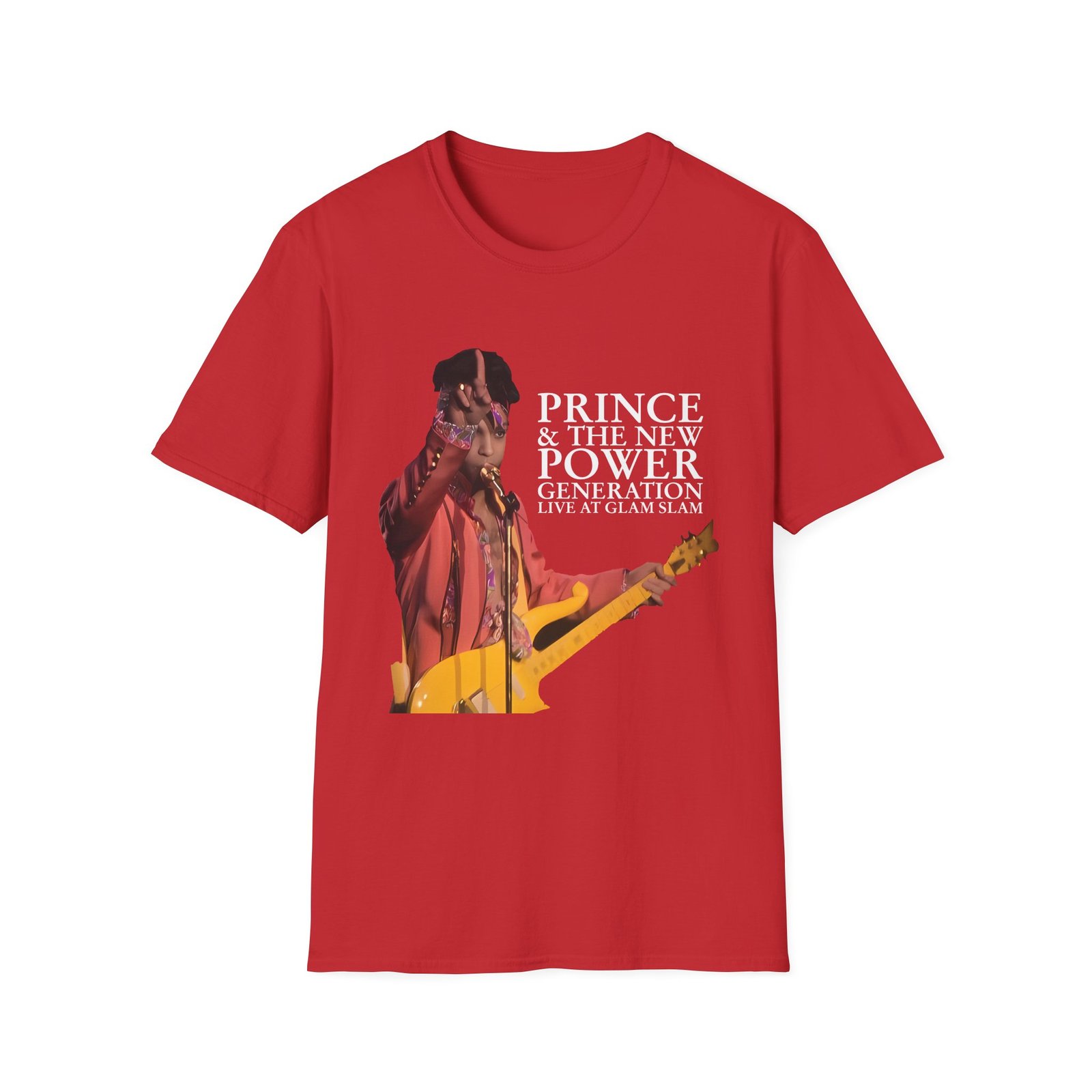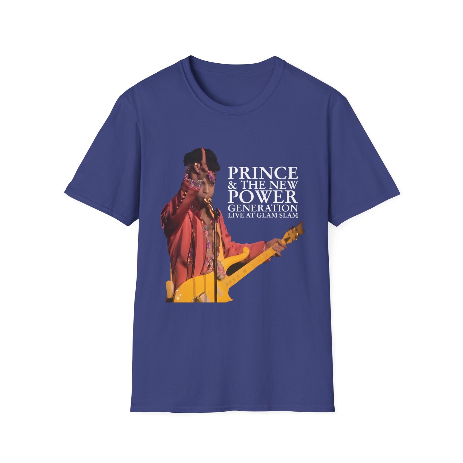 The Prince Live At Glam Slam unisex soft-style t-shirt puts a new spin on casual comfort. Made from very soft materials, this tee is 100% cotton for solid colors. Heather colors and sports grey include polyester. The shoulders have twill tape for improved durability. There are no side seams. The collar is made with ribbed knitting to prevent curling damage.