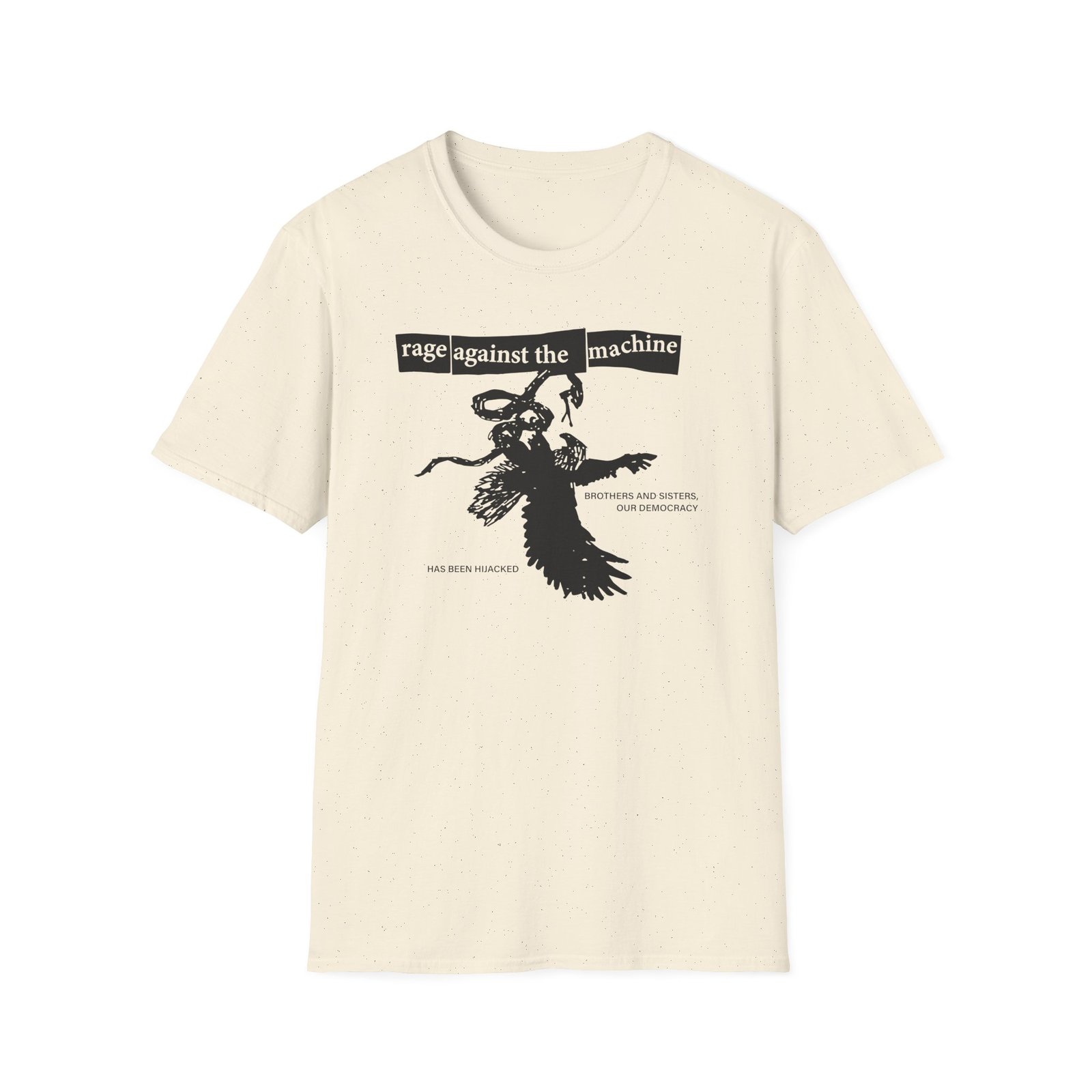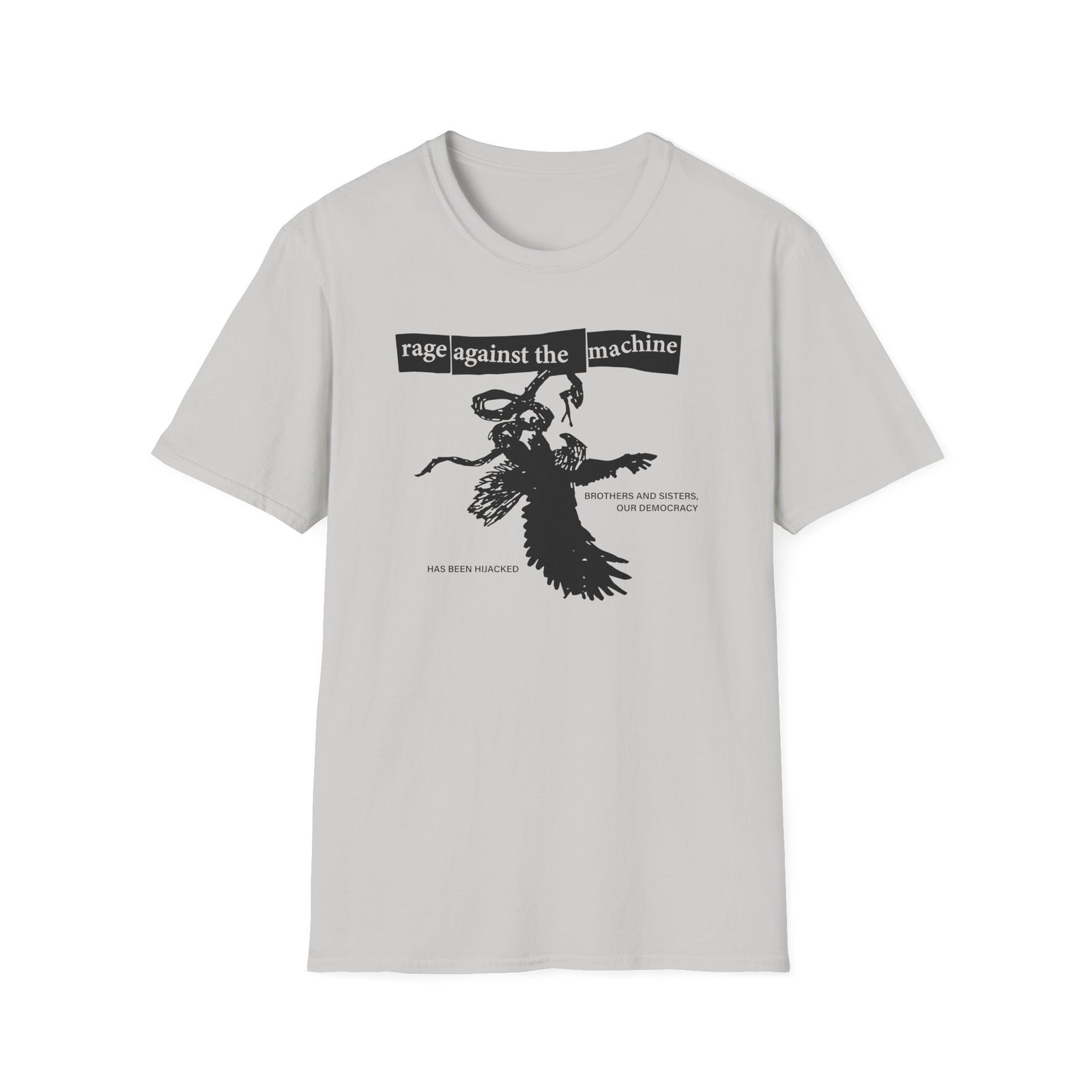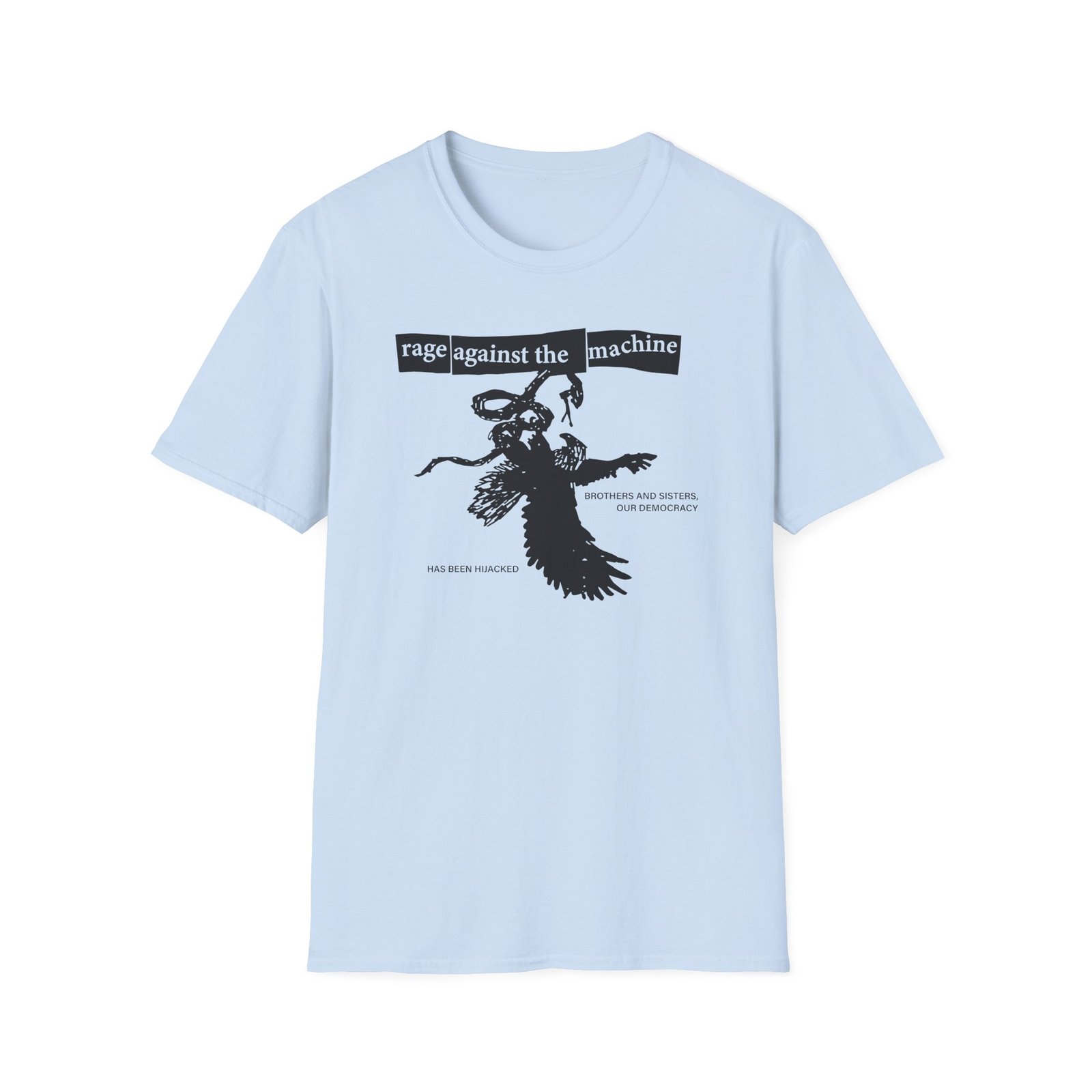 The Rage Against the Machine Our Democracy Has Been Hijacked unisex soft-style t-shirt puts a new spin on casual comfort. Made from very soft materials, this tee is 100% cotton for solid colors. Heather colors and sports grey include polyester. The shoulders have twill tape for improved durability. There are no side seams. The collar is made with ribbed knitting to prevent curling damage.