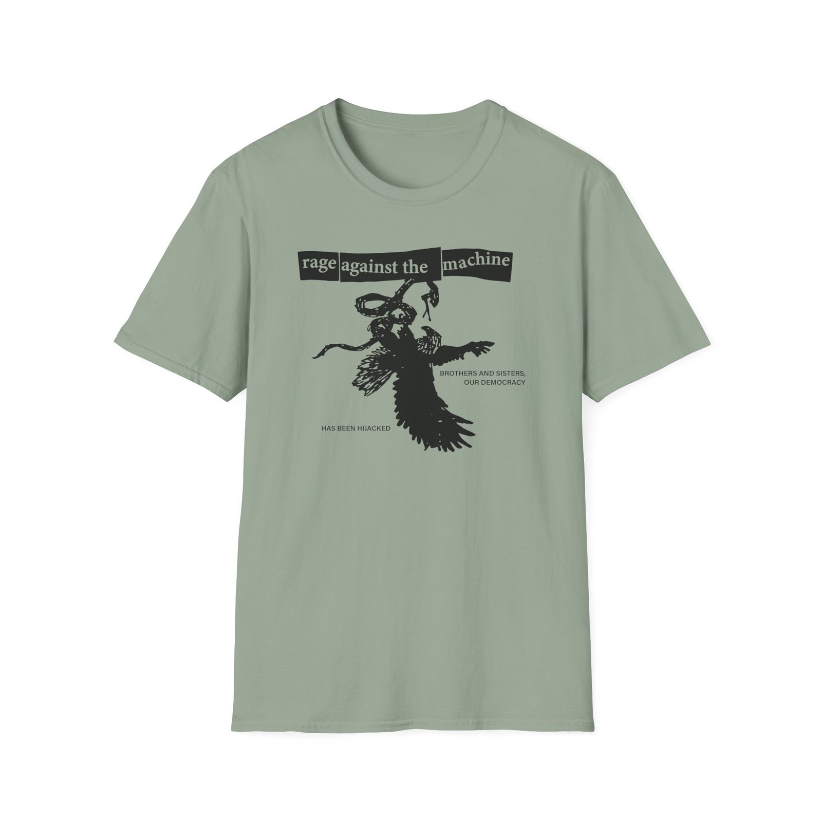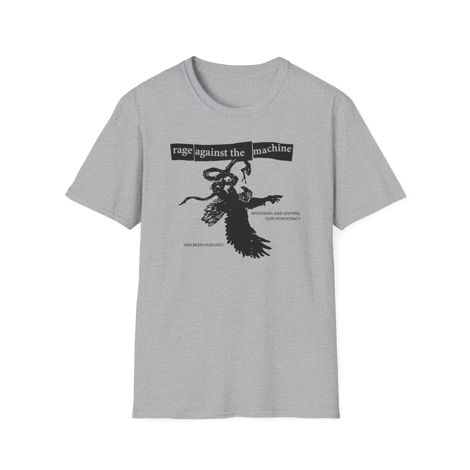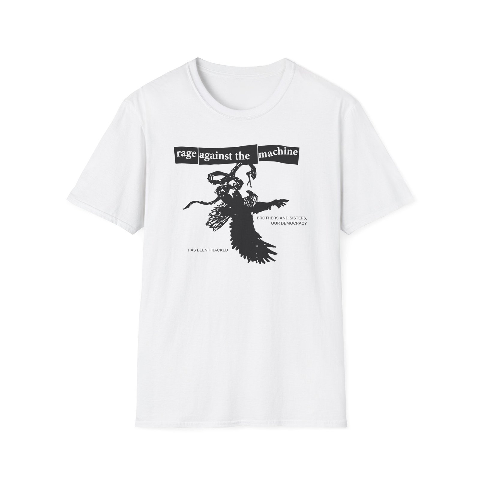 The Rage Against the Machine Our Democracy Has Been Hijacked unisex soft-style t-shirt puts a new spin on casual comfort. Made from very soft materials, this tee is 100% cotton for solid colors. Heather colors and sports grey include polyester. The shoulders have twill tape for improved durability. There are no side seams. The collar is made with ribbed knitting to prevent curling damage.