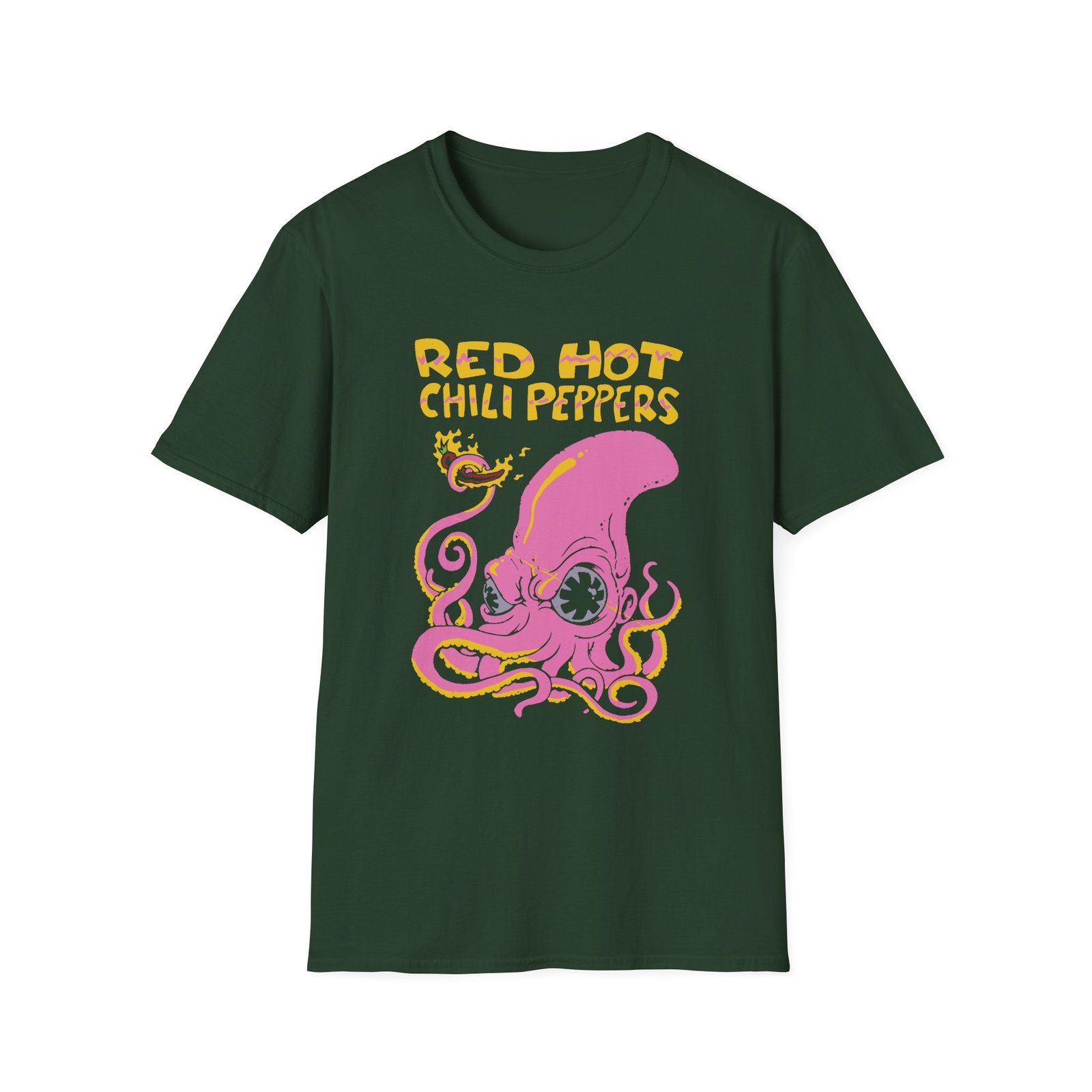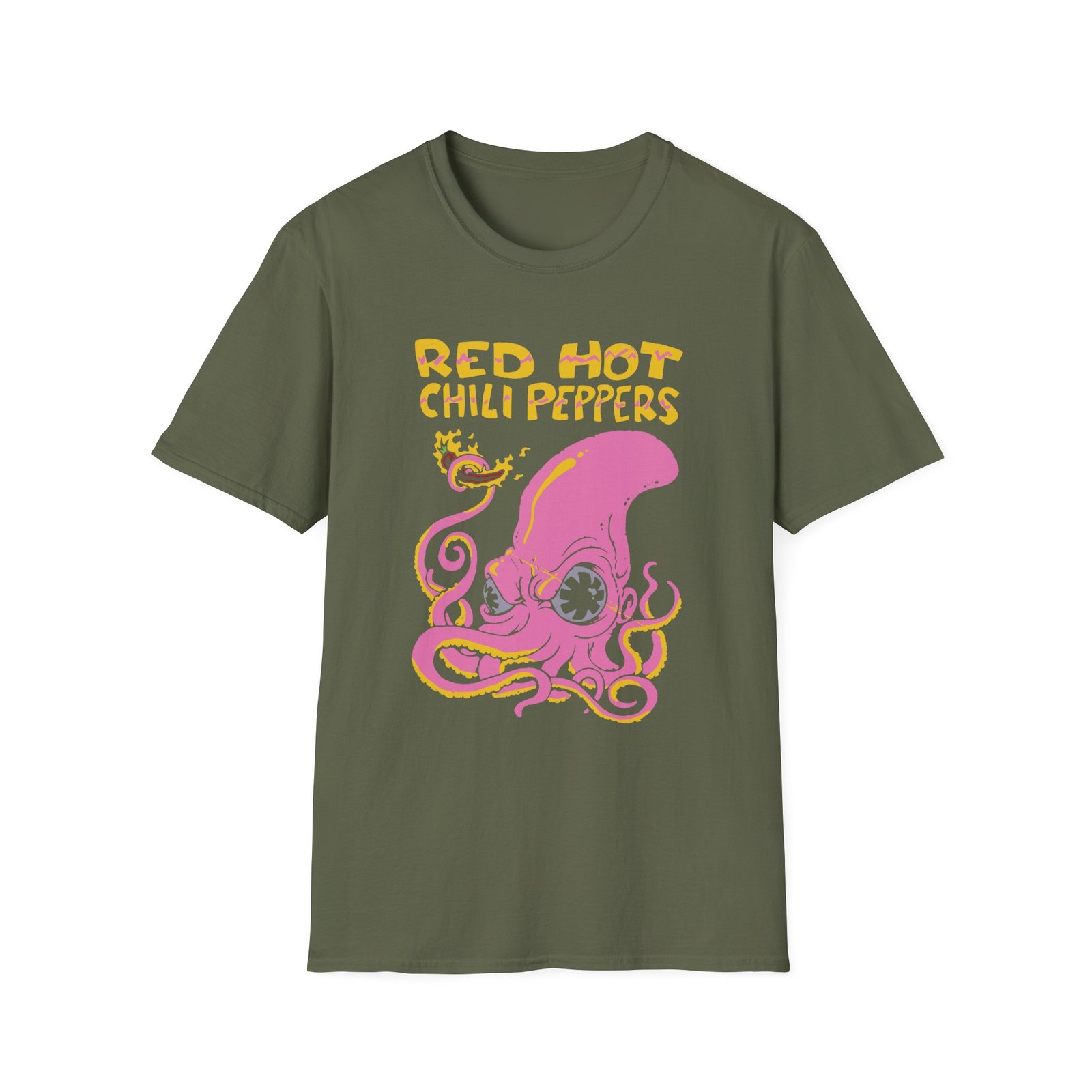 The Red Hot Chili Peppers Octopus unisex soft-style t-shirt puts a new spin on casual comfort. Made from very soft materials, this tee is 100% cotton for solid colors. Heather colors and sports grey include polyester. The shoulders have twill tape for improved durability. There are no side seams. The collar is made with ribbed knitting to prevent curling damage.