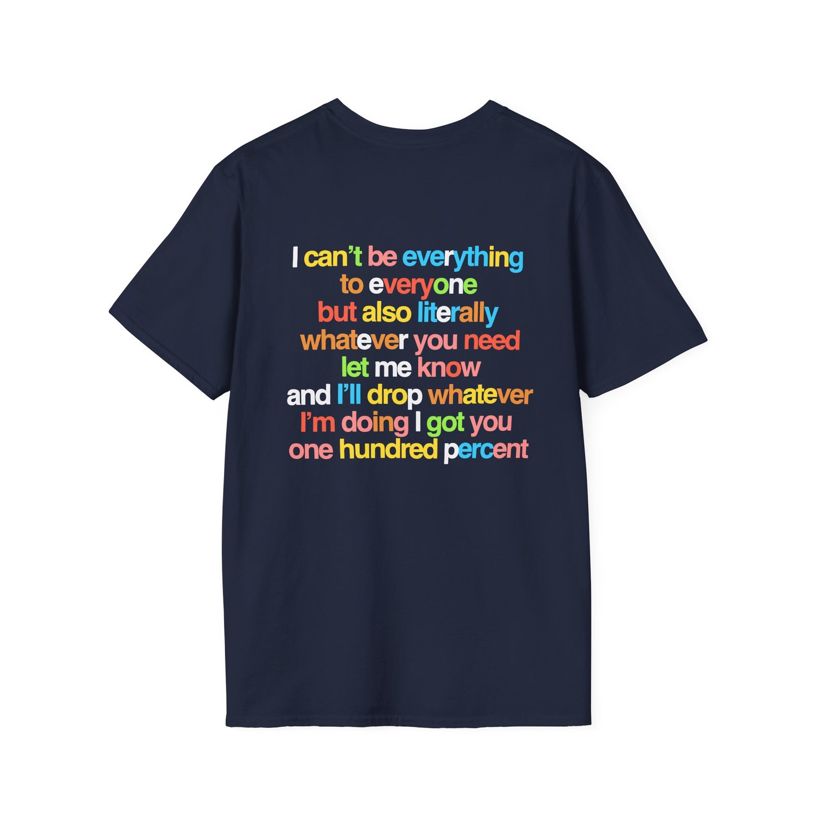 The Renee Rapp Everything to Everyone unisex soft-style t-shirt puts a new spin on casual comfort. Made from very soft materials, this tee is 100% cotton for solid colors. Heather colors and sports grey include polyester. The shoulders have twill tape for improved durability. There are no side seams. The collar is made with ribbed knitting to prevent curling damage.