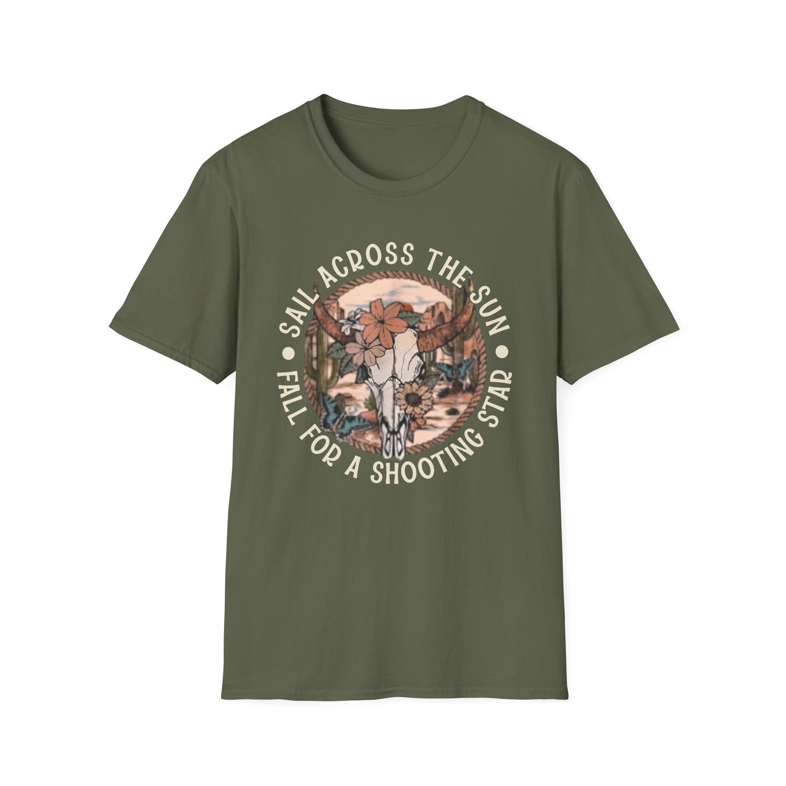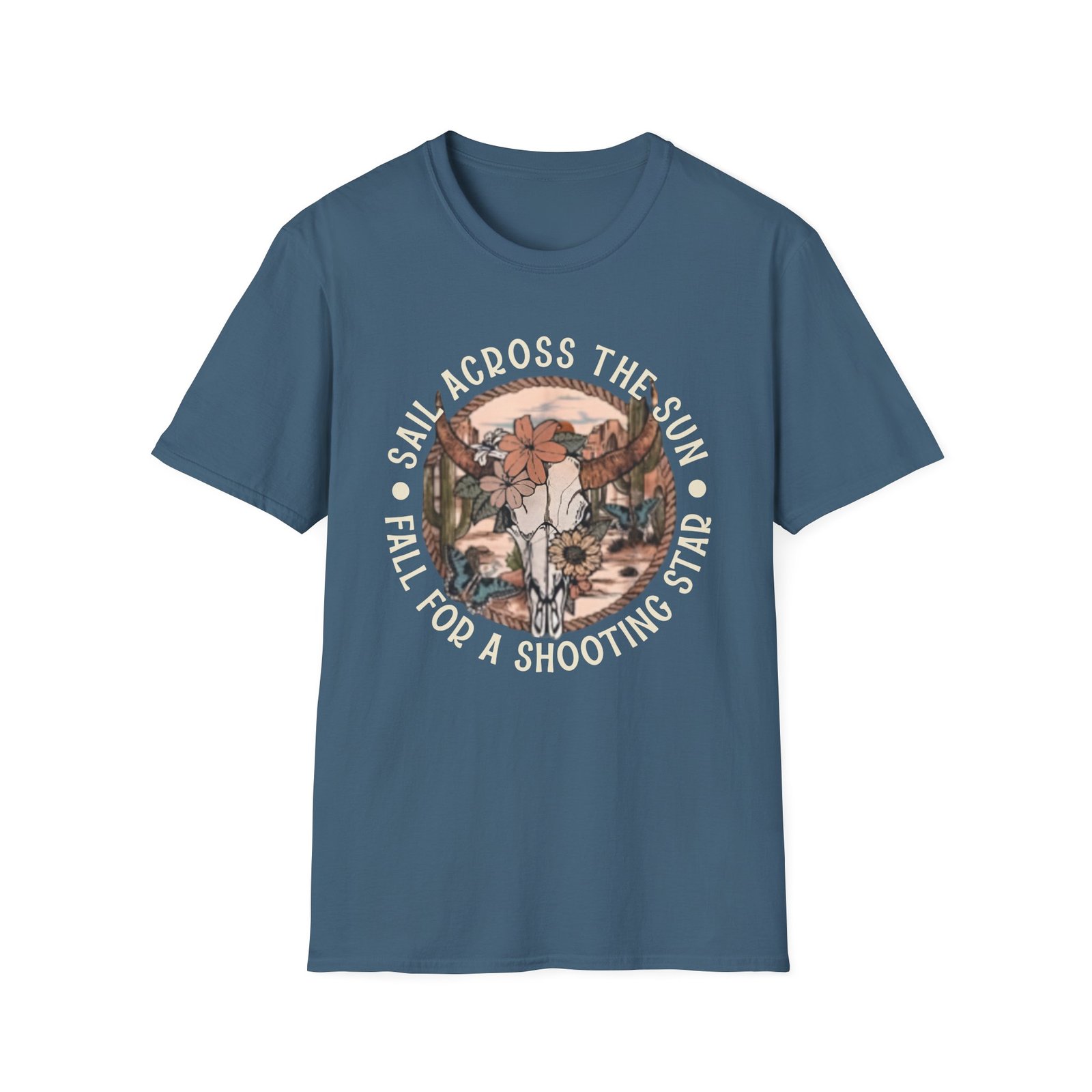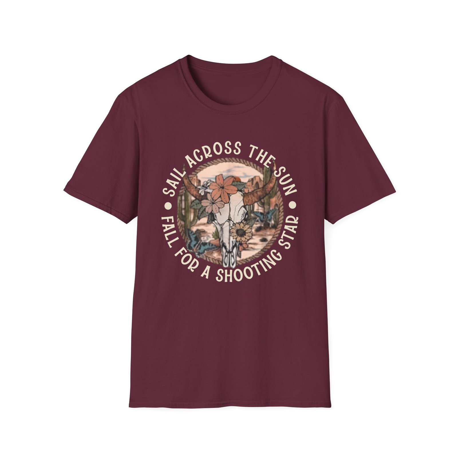The Sail Across the Sun Fall for a Shooting Star Country Skull unisex soft-style t-shirt puts a new spin on casual comfort. Made from very soft materials, this tee is 100% cotton for solid colors. Heather colors and sports grey include polyester. The shoulders have twill tape for improved durability. There are no side seams. The collar is made with ribbed knitting to prevent curling damage.