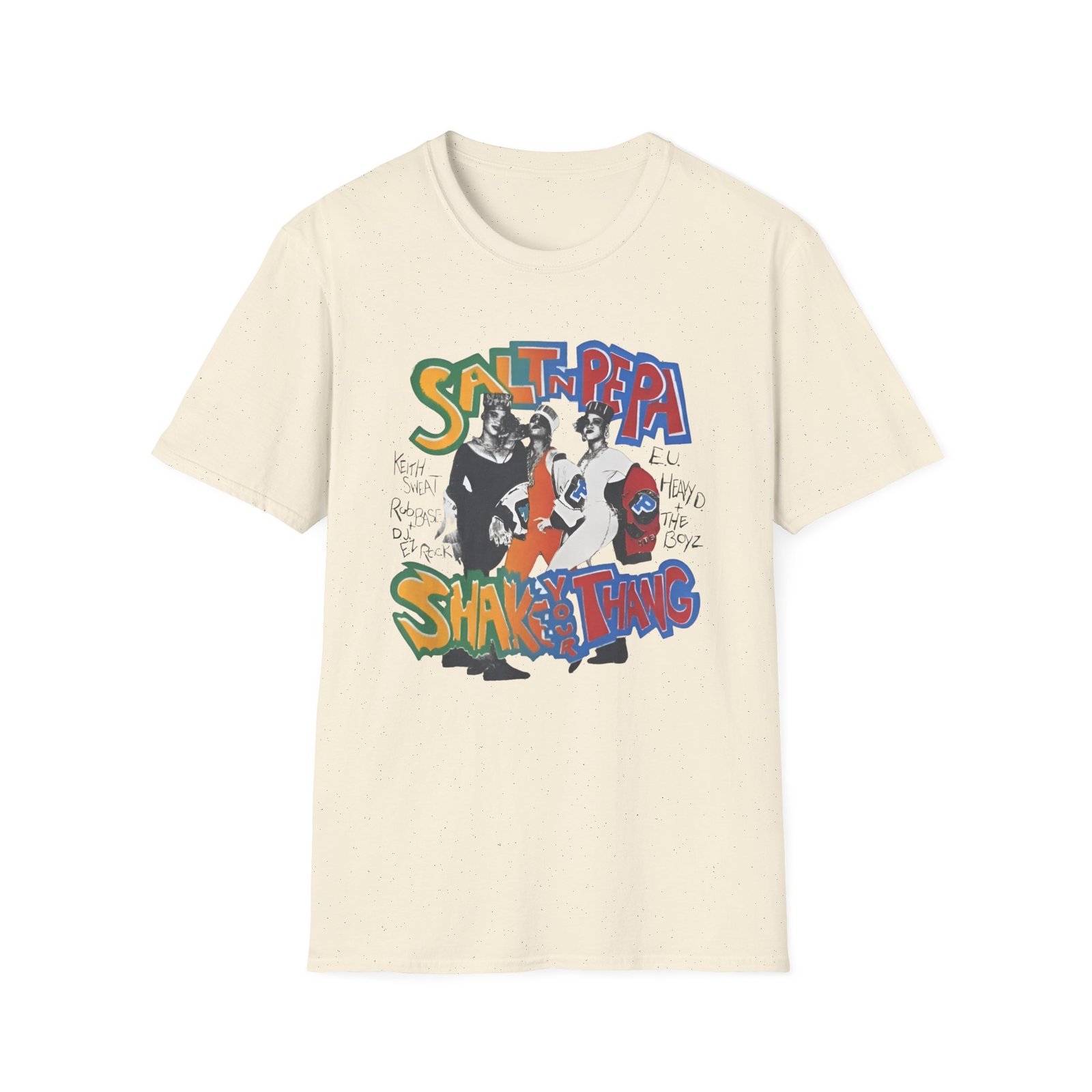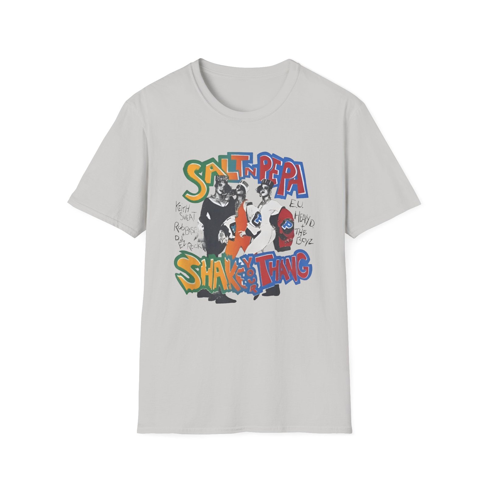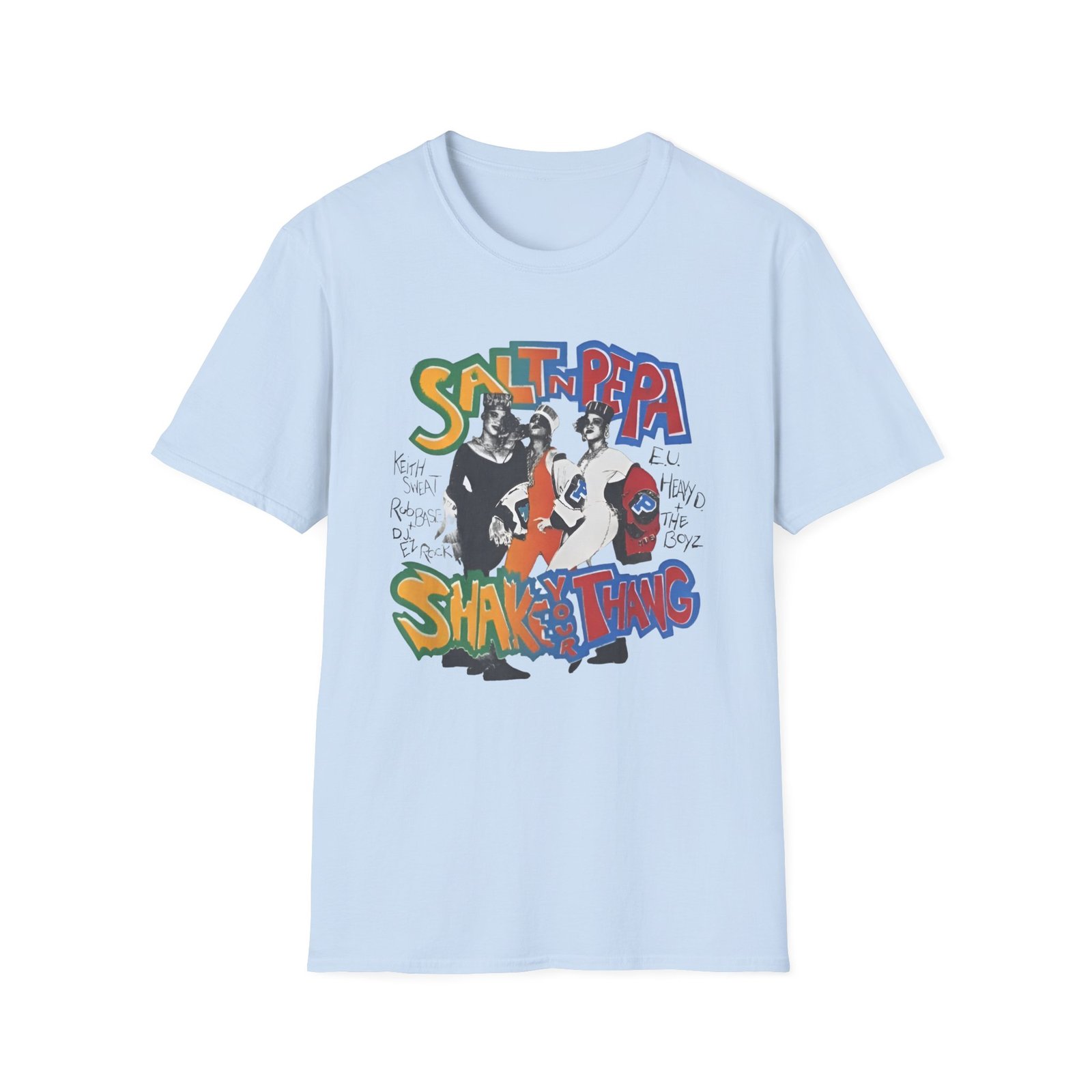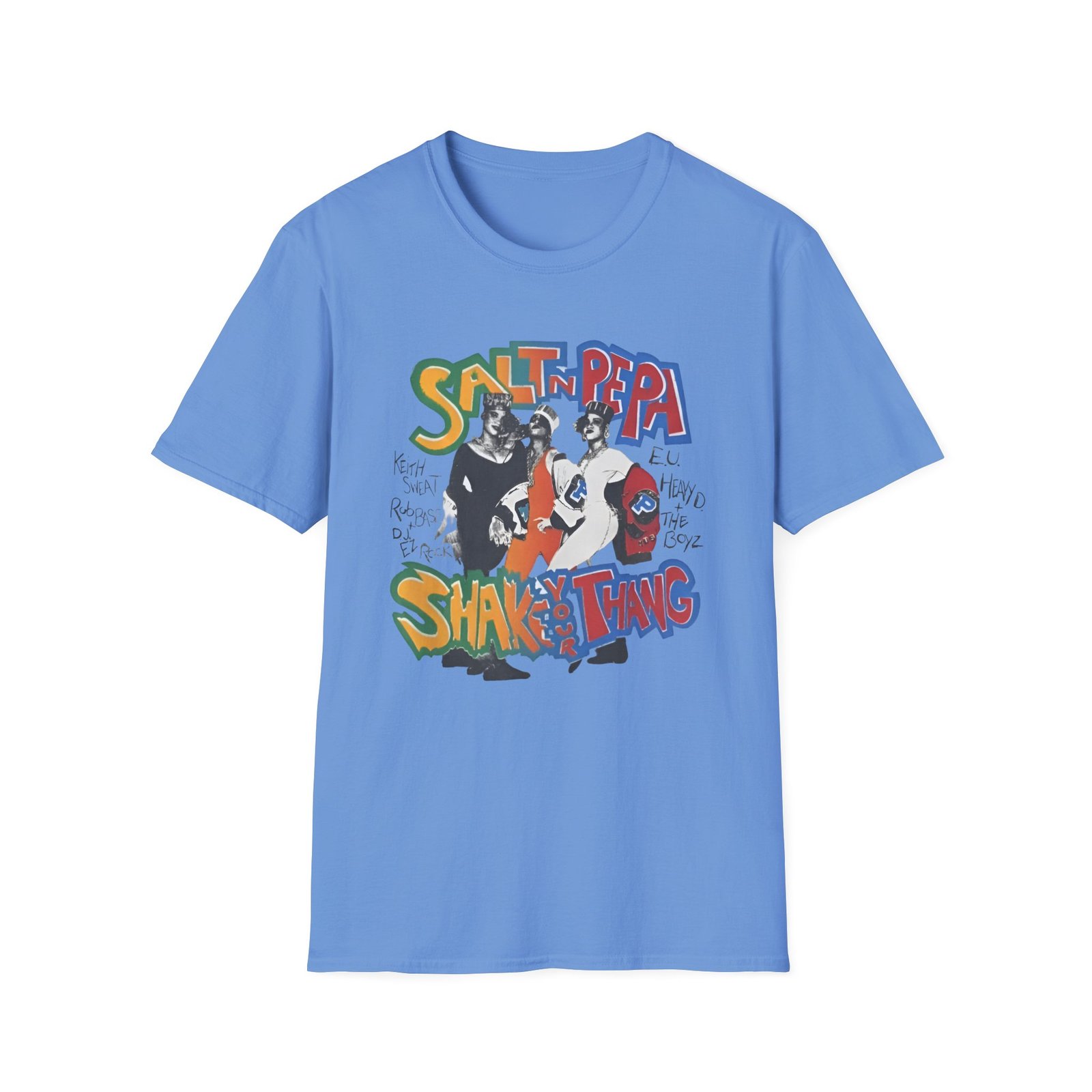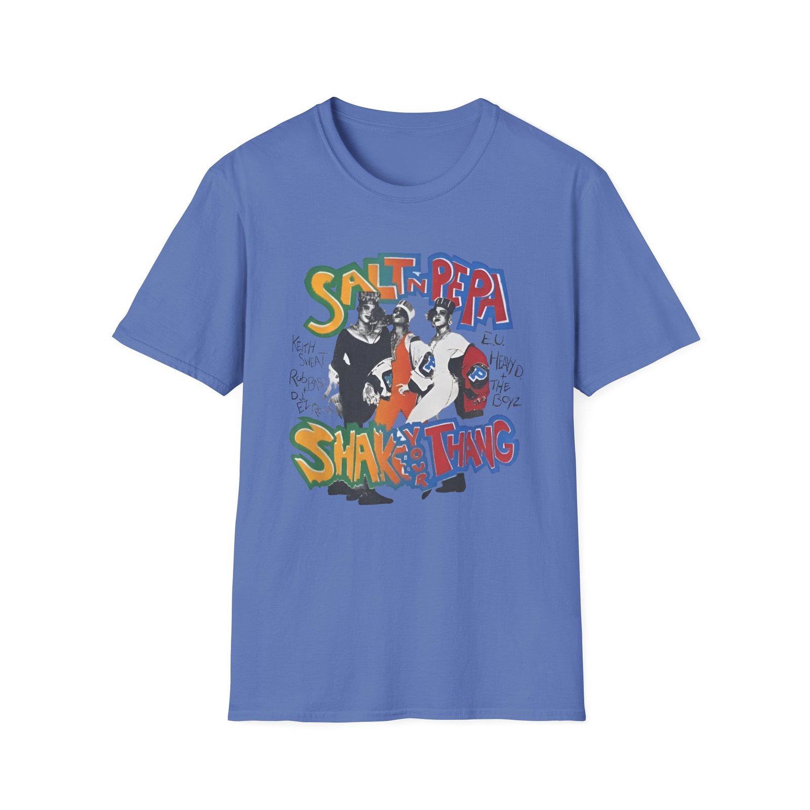 The Salt N Pepa Shake Your Thang unisex soft-style t-shirt puts a new spin on casual comfort. Made from very soft materials, this tee is 100% cotton for solid colors. Heather colors and sports grey include polyester. The shoulders have twill tape for improved durability. There are no side seams. The collar is made with ribbed knitting to prevent curling damage.