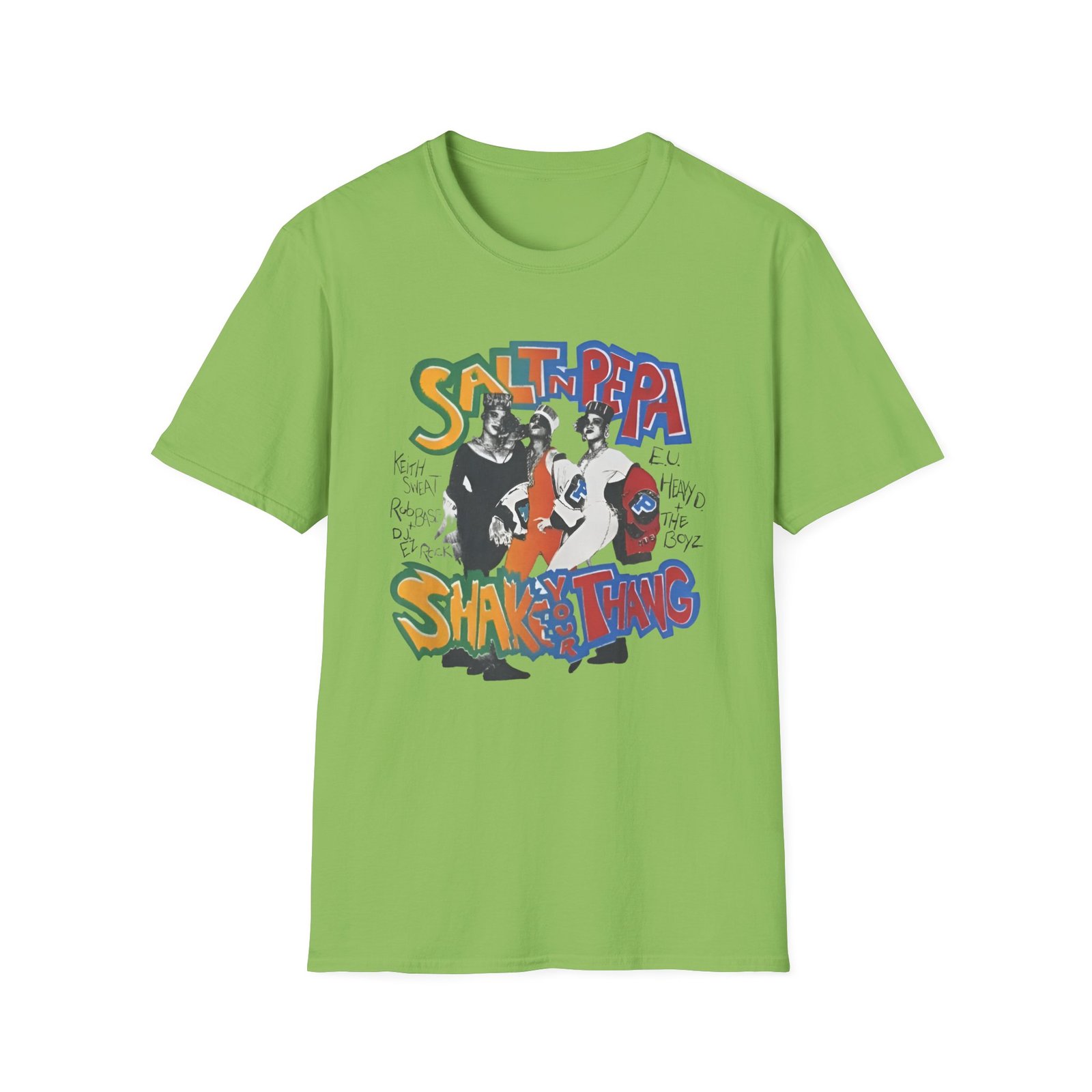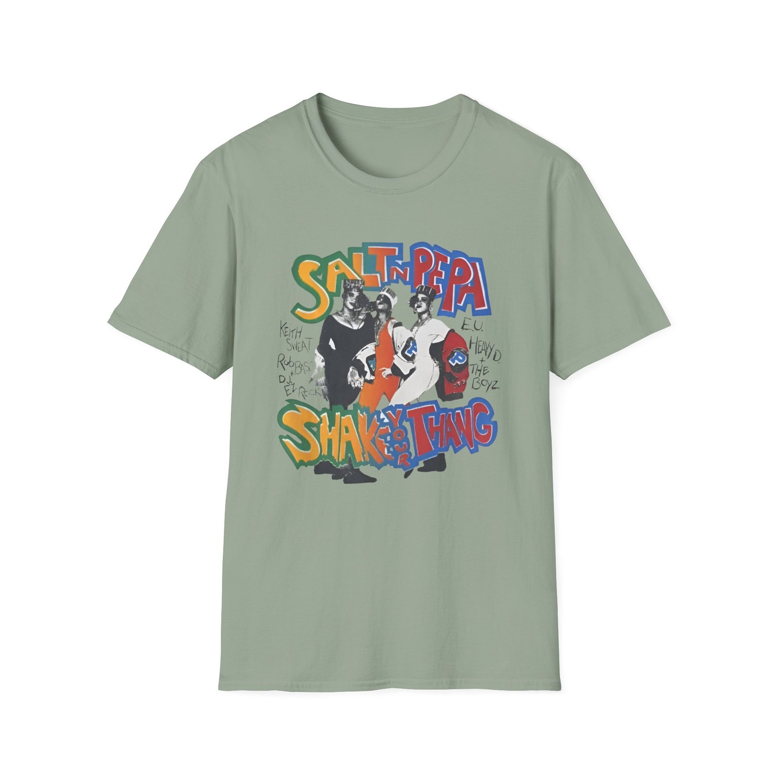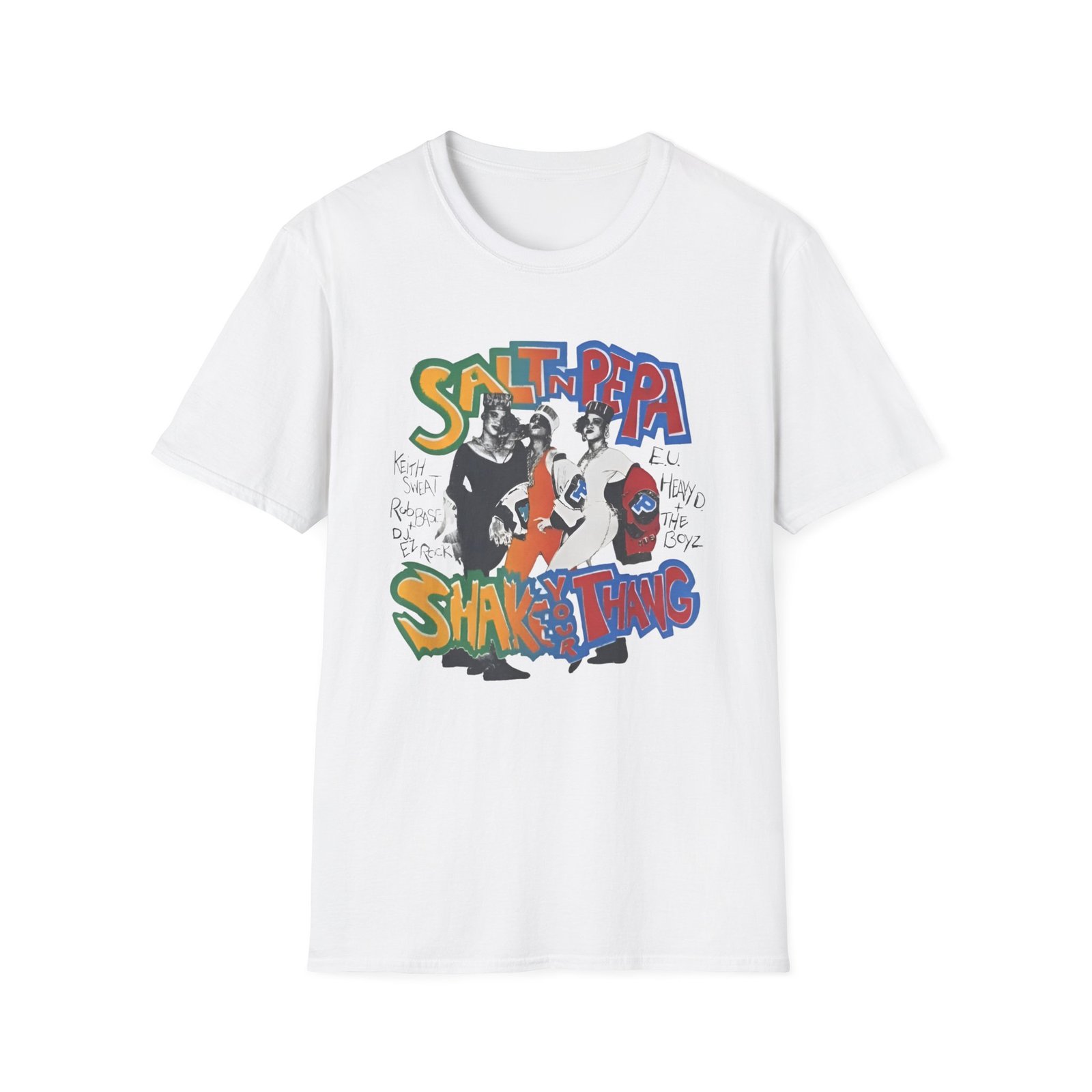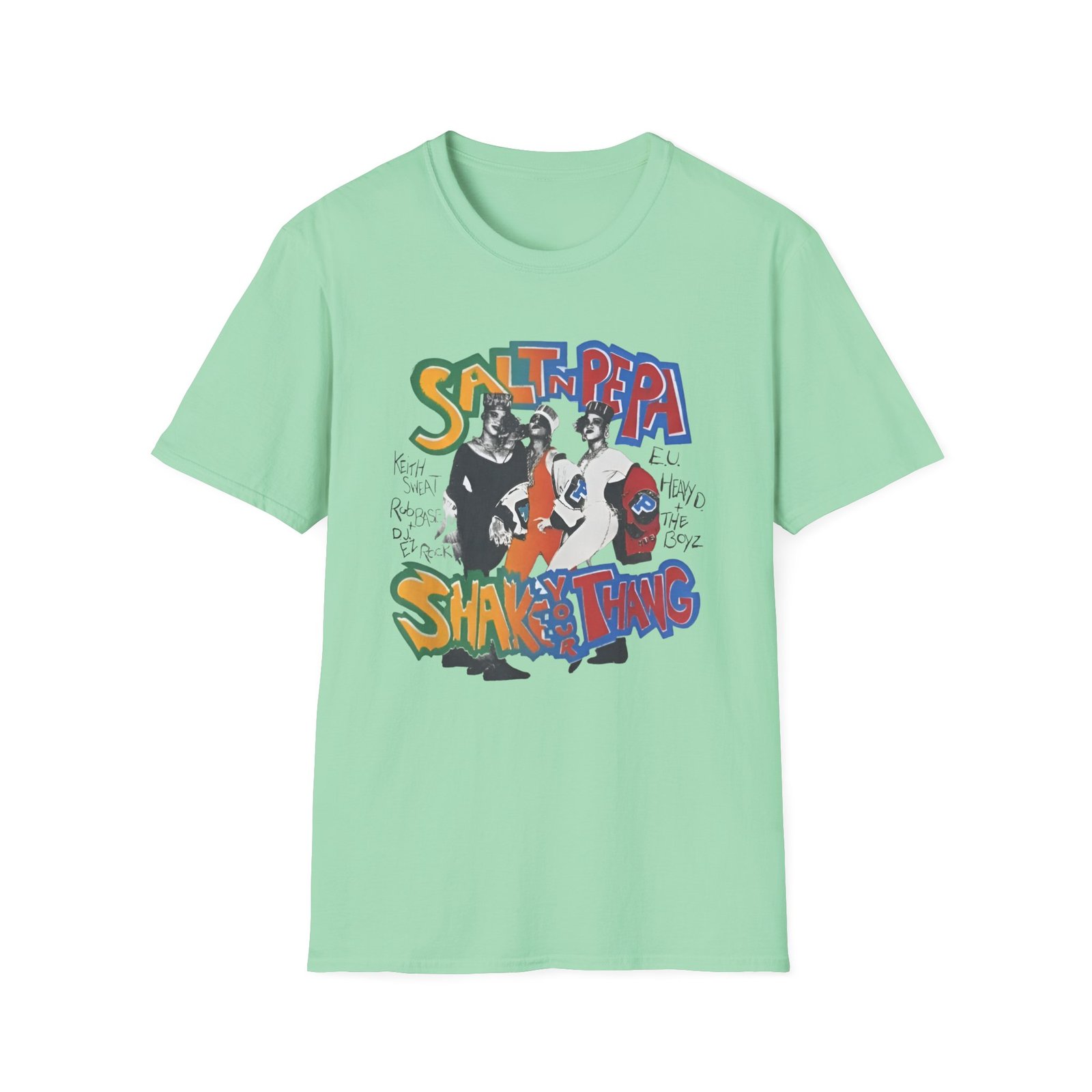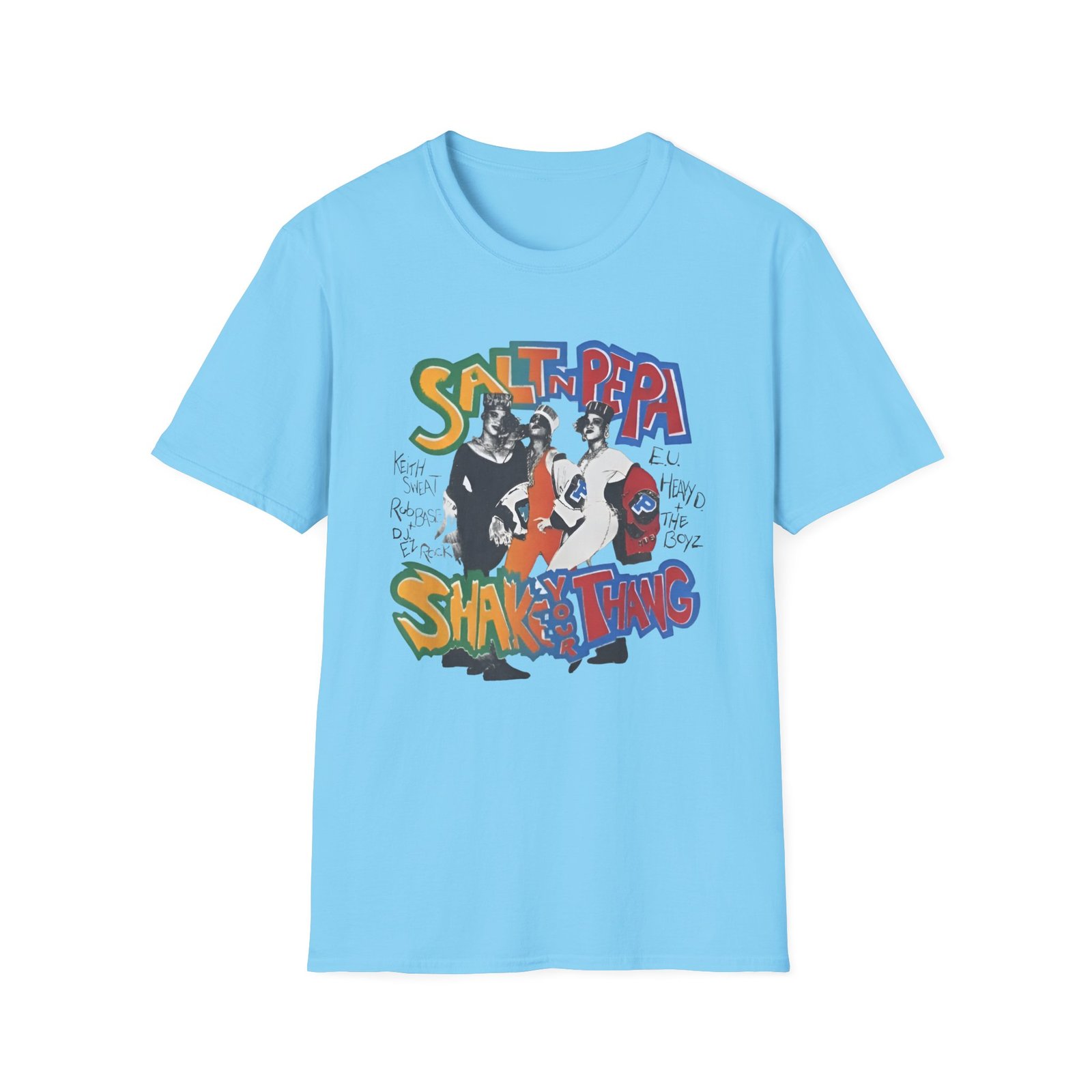 The Salt N Pepa Shake Your Thang unisex soft-style t-shirt puts a new spin on casual comfort. Made from very soft materials, this tee is 100% cotton for solid colors. Heather colors and sports grey include polyester. The shoulders have twill tape for improved durability. There are no side seams. The collar is made with ribbed knitting to prevent curling damage.