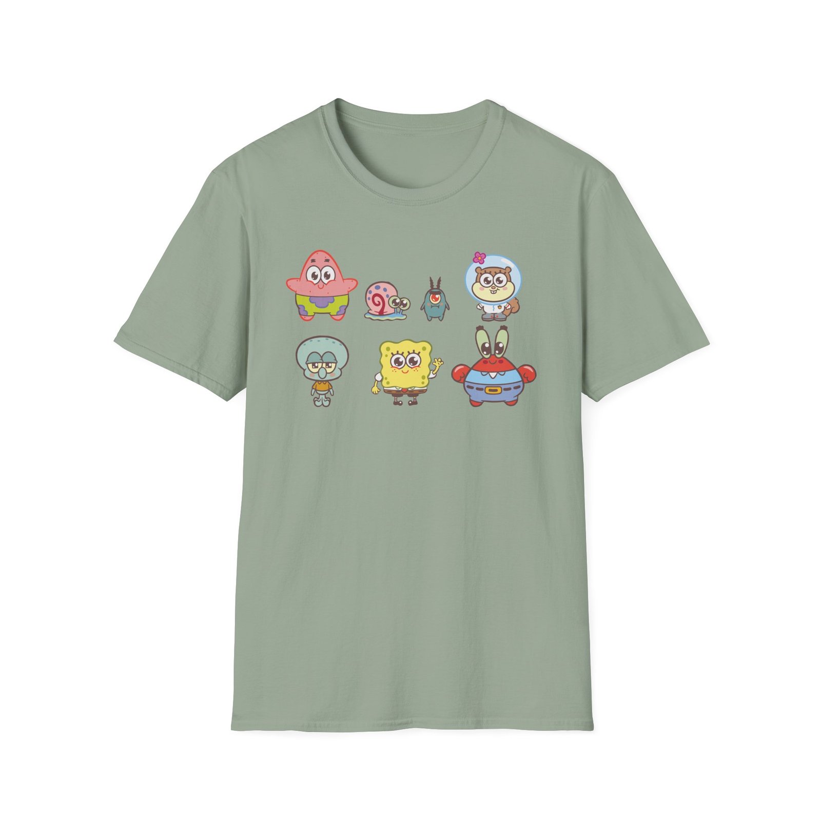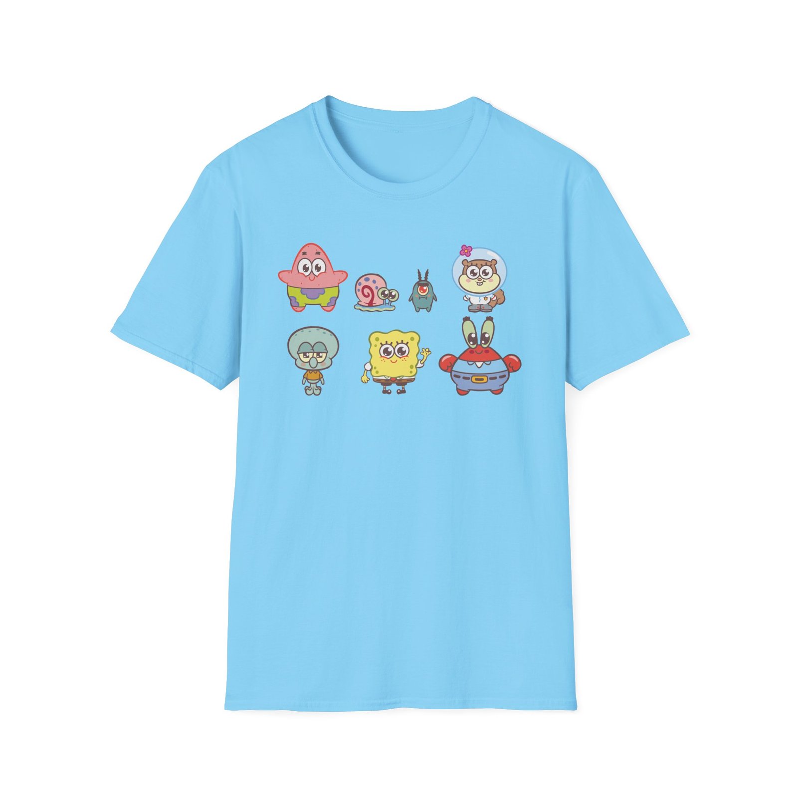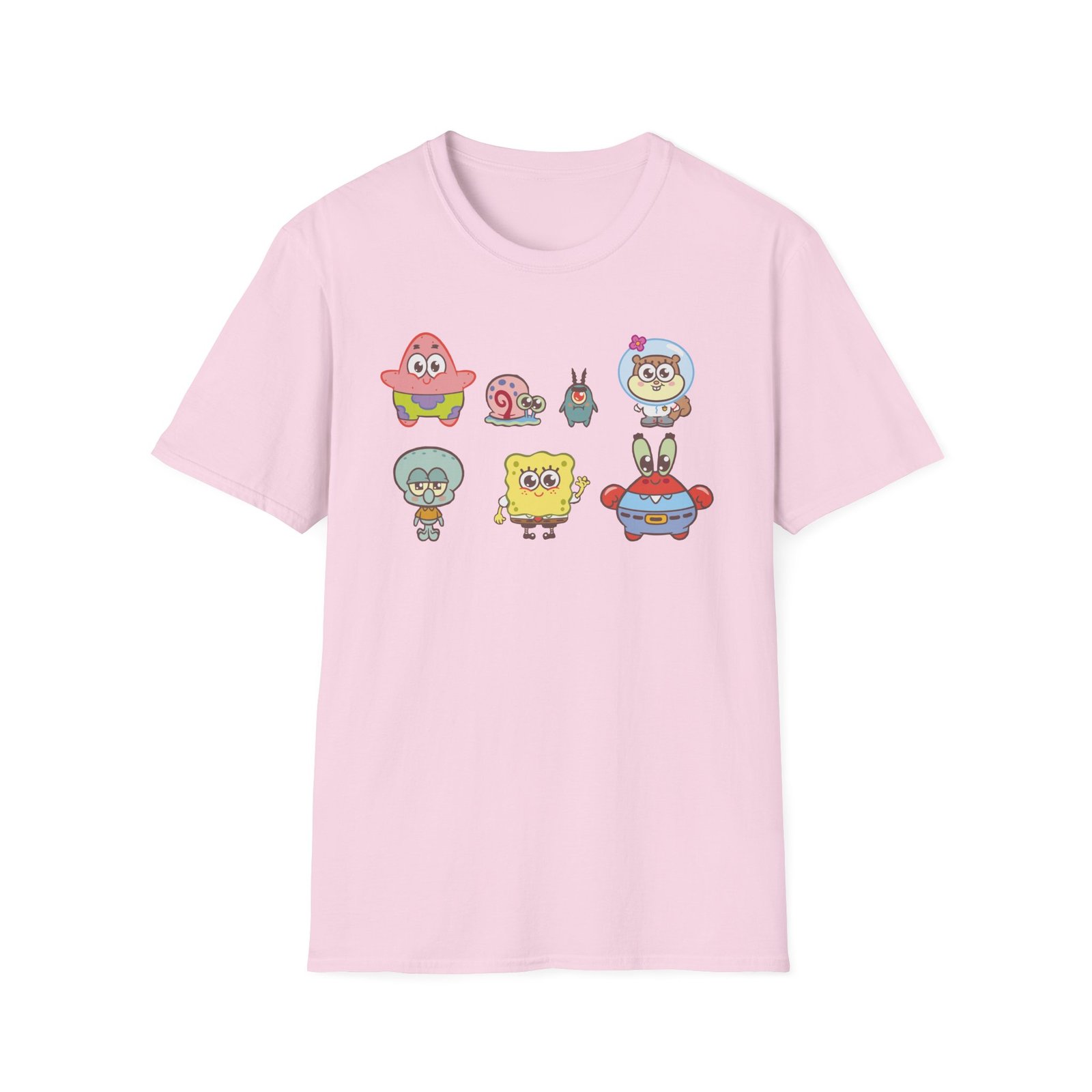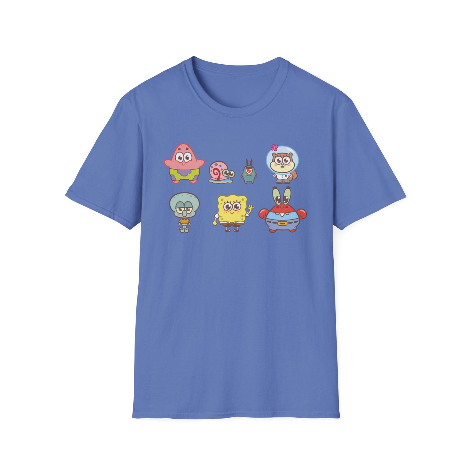 The Spongebob AdoraBob Gang Unisex Softstyle T-Shirt puts a new spin on casual comfort. Made from very soft materials, this tee is 100% cotton for solid colors. Heather colors and sports grey include polyester. The shoulders have twill tape for improved durability. There are no side seams. The collar is made with ribbed knitting to prevent curling damage.
