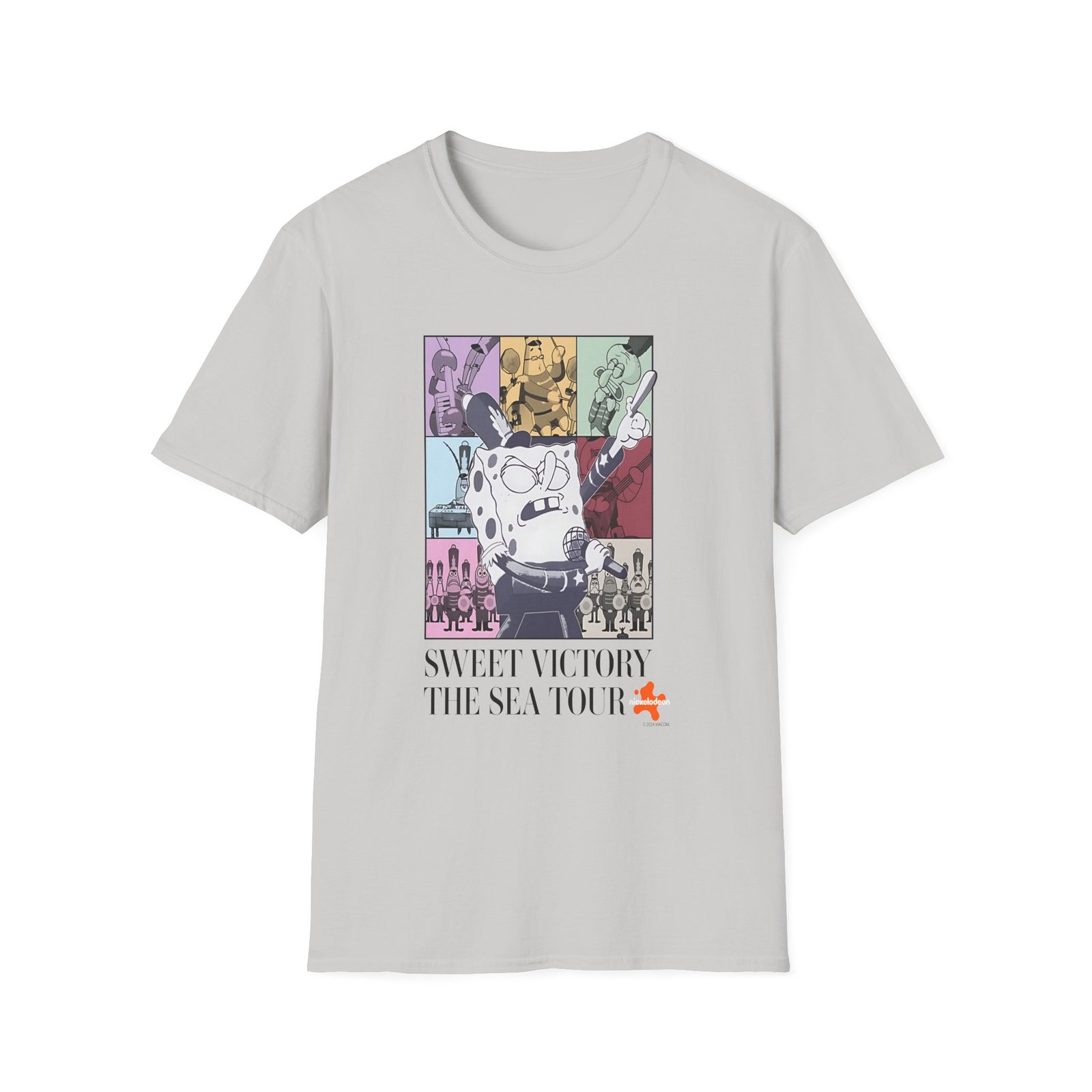 The Spongebob Sweet Victory The Sea Tour Unisex Softstyle T-Shirt puts a new spin on casual comfort. Made from very soft materials, this tee is 100% cotton for solid colors. Heather colors and sports grey include polyester. The shoulders have twill tape for improved durability. There are no side seams. The collar is made with ribbed knitting to prevent curling damage.