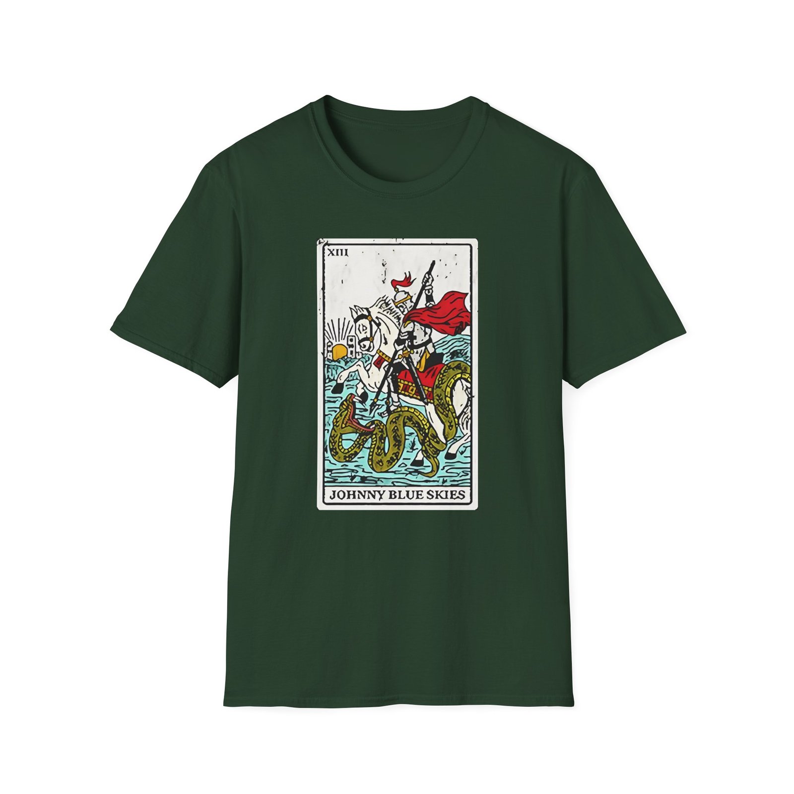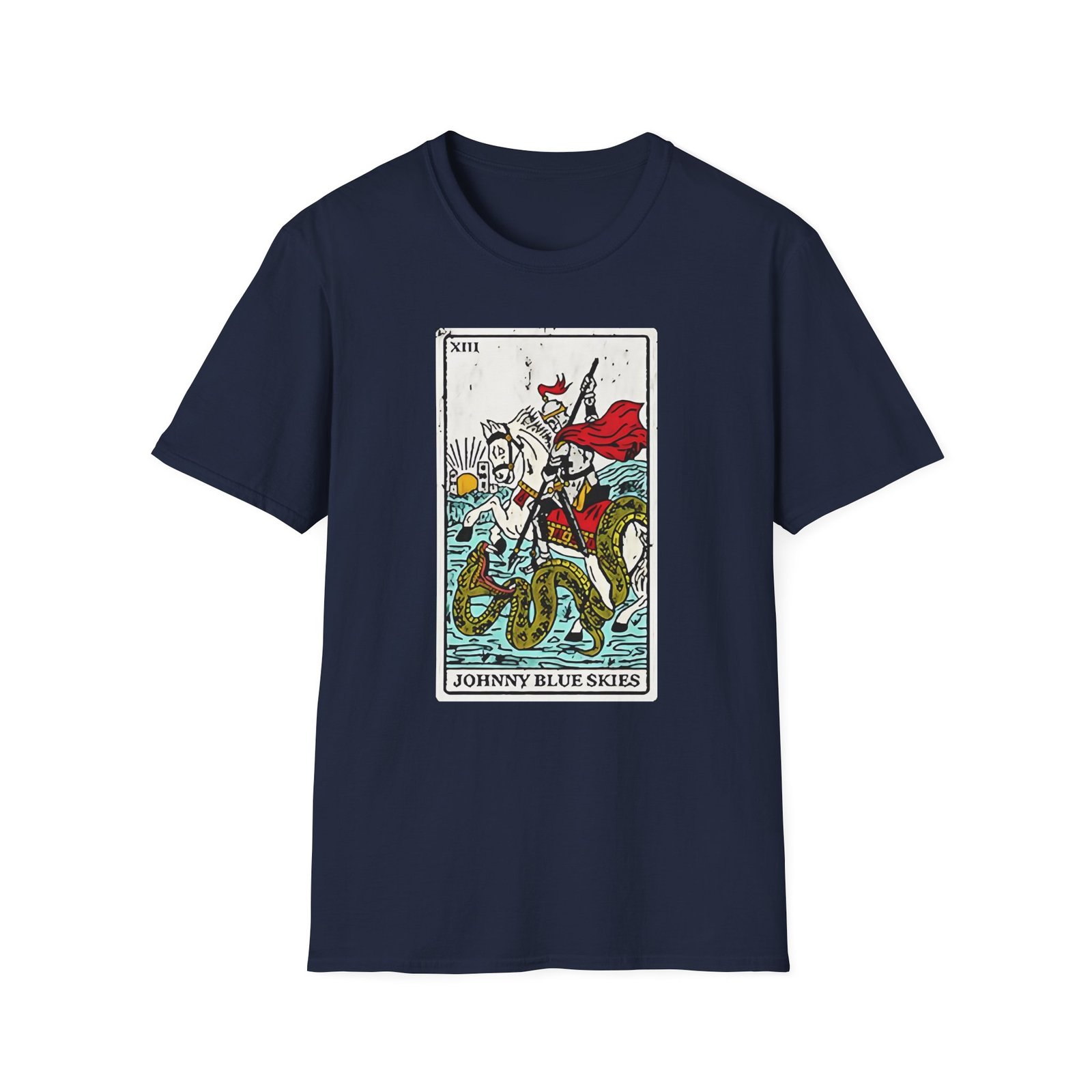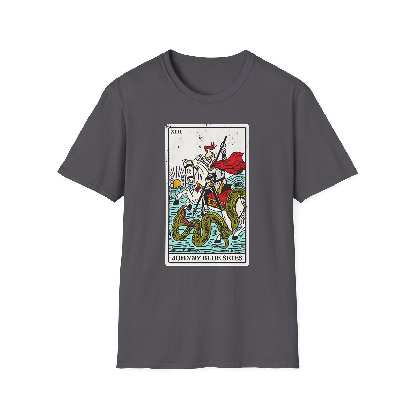 The Sturgill Simpson Death Card unisex soft-style t-shirt puts a new spin on casual comfort. Made from very soft materials, this tee is 100% cotton for solid colors. Heather colors and sports grey include polyester. The shoulders have twill tape for improved durability. There are no side seams. The collar is made with ribbed knitting to prevent curling damage.
