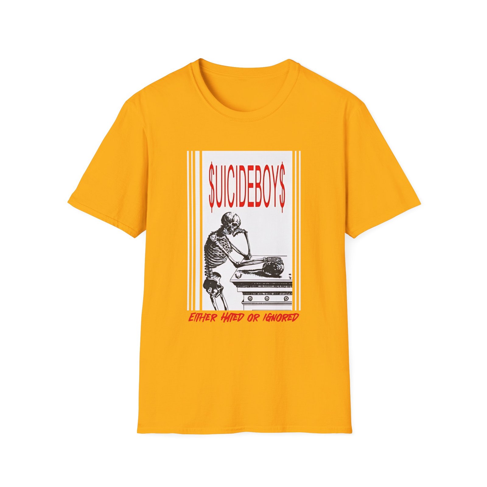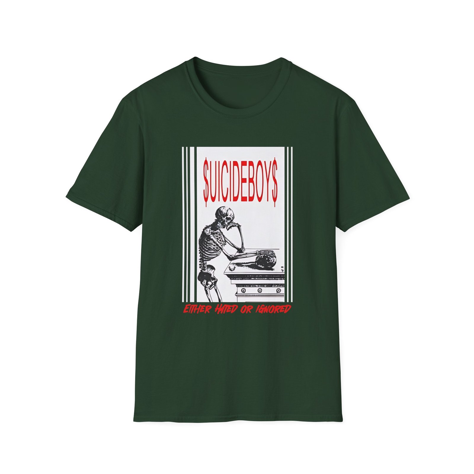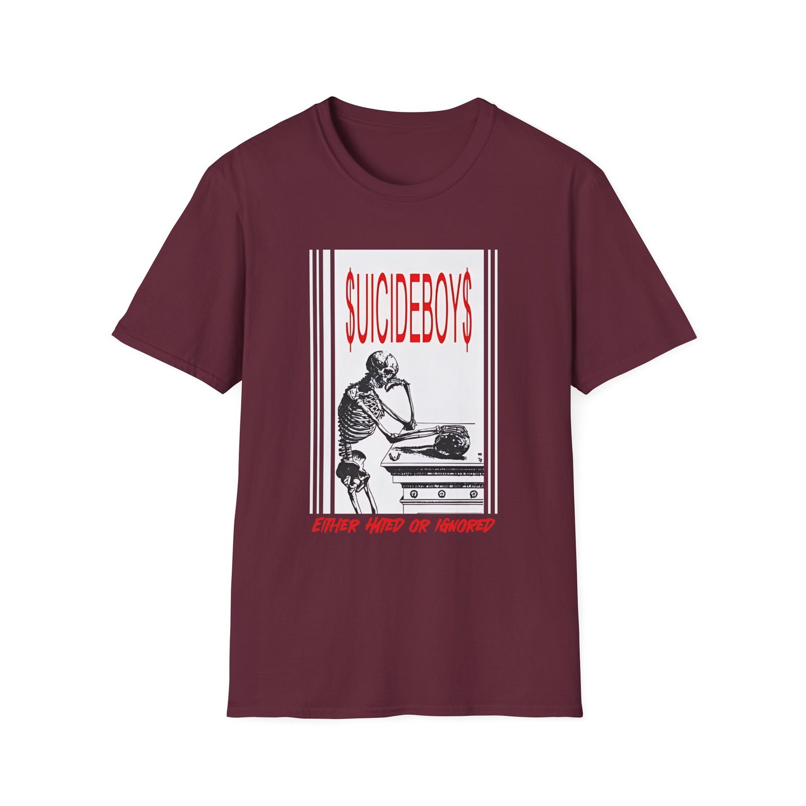 The Suicide Boys Either Hated or Ignored unisex soft-style t-shirt puts a new spin on casual comfort. Made from very soft materials, this tee is 100% cotton for solid colors. Heather colors and sports grey include polyester. The shoulders have twill tape for improved durability. There are no side seams. The collar is made with ribbed knitting to prevent curling damage.
