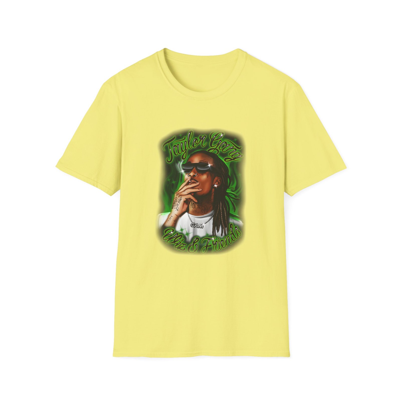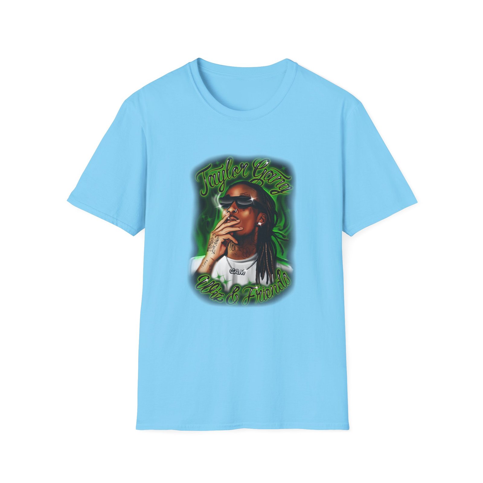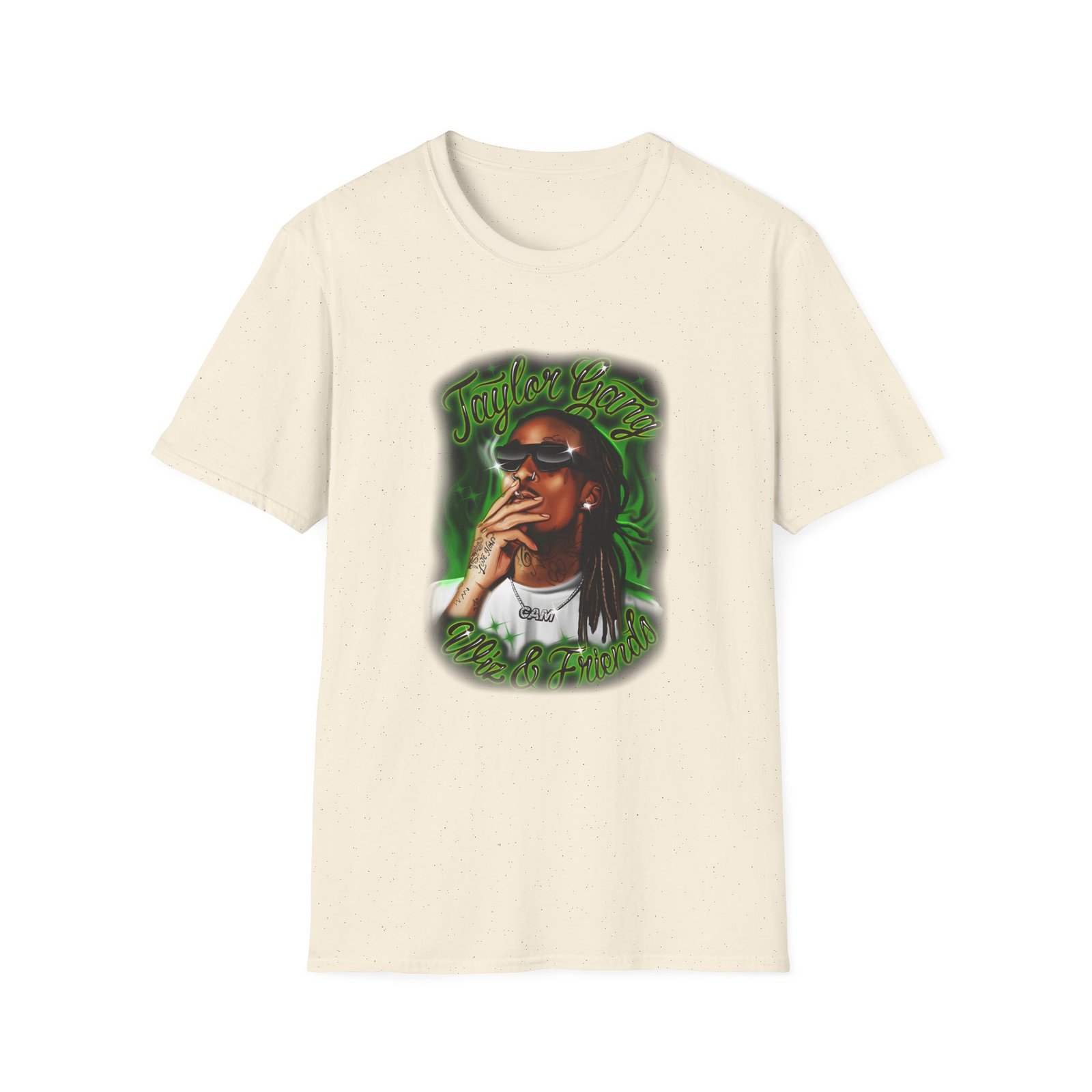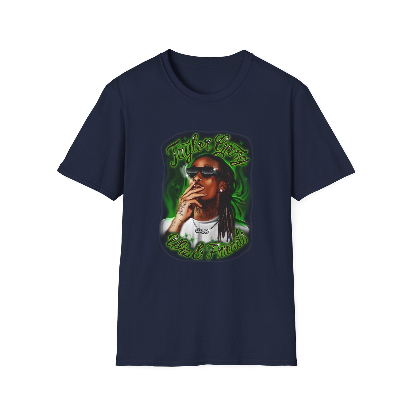 The Wiz Khalifa Airbrush unisex soft-style t-shirt puts a new spin on casual comfort. Made from very soft materials, this tee is 100% cotton for solid colors. Heather colors and sports grey include polyester. The shoulders have twill tape for improved durability. There are no side seams. The collar is made with ribbed knitting to prevent curling damage.