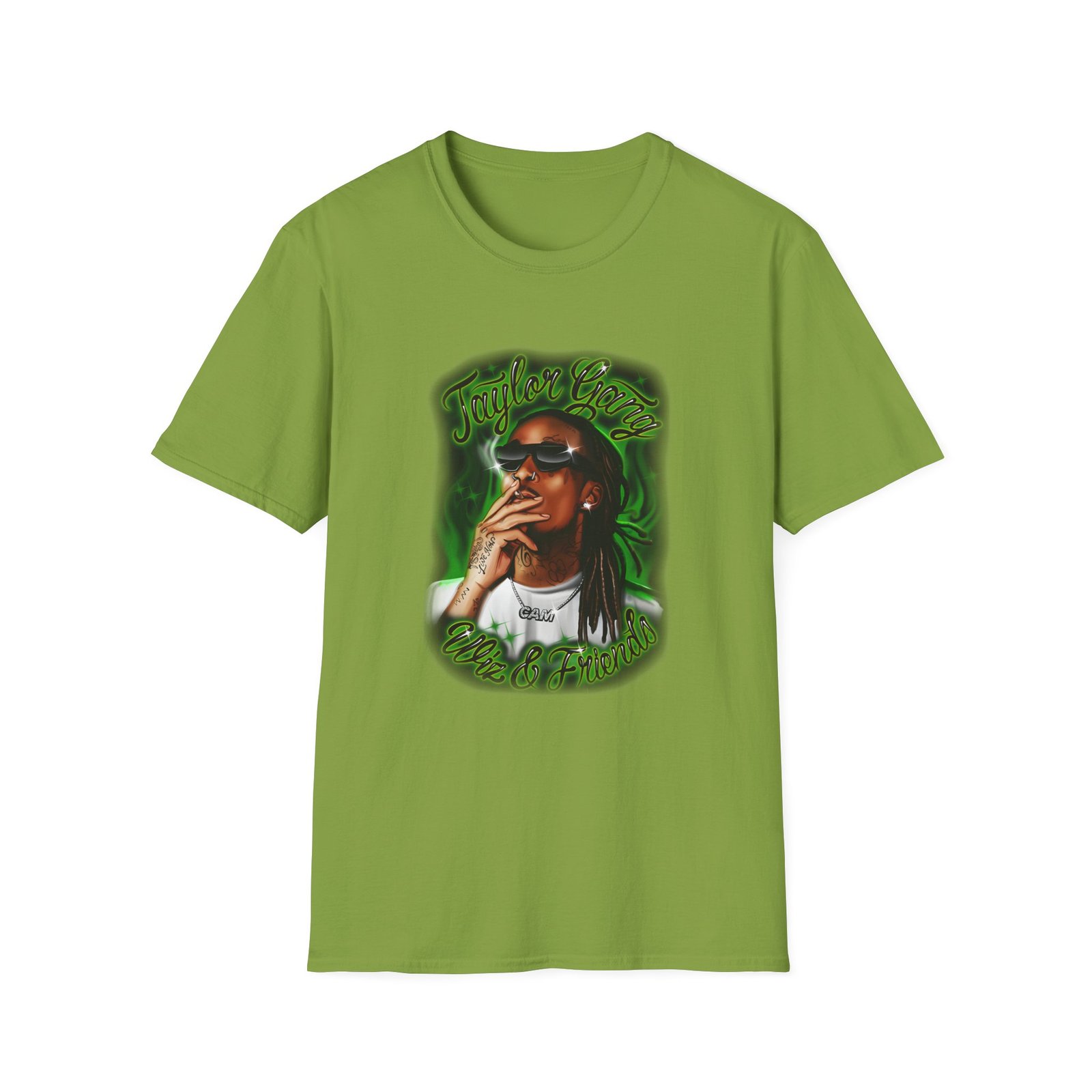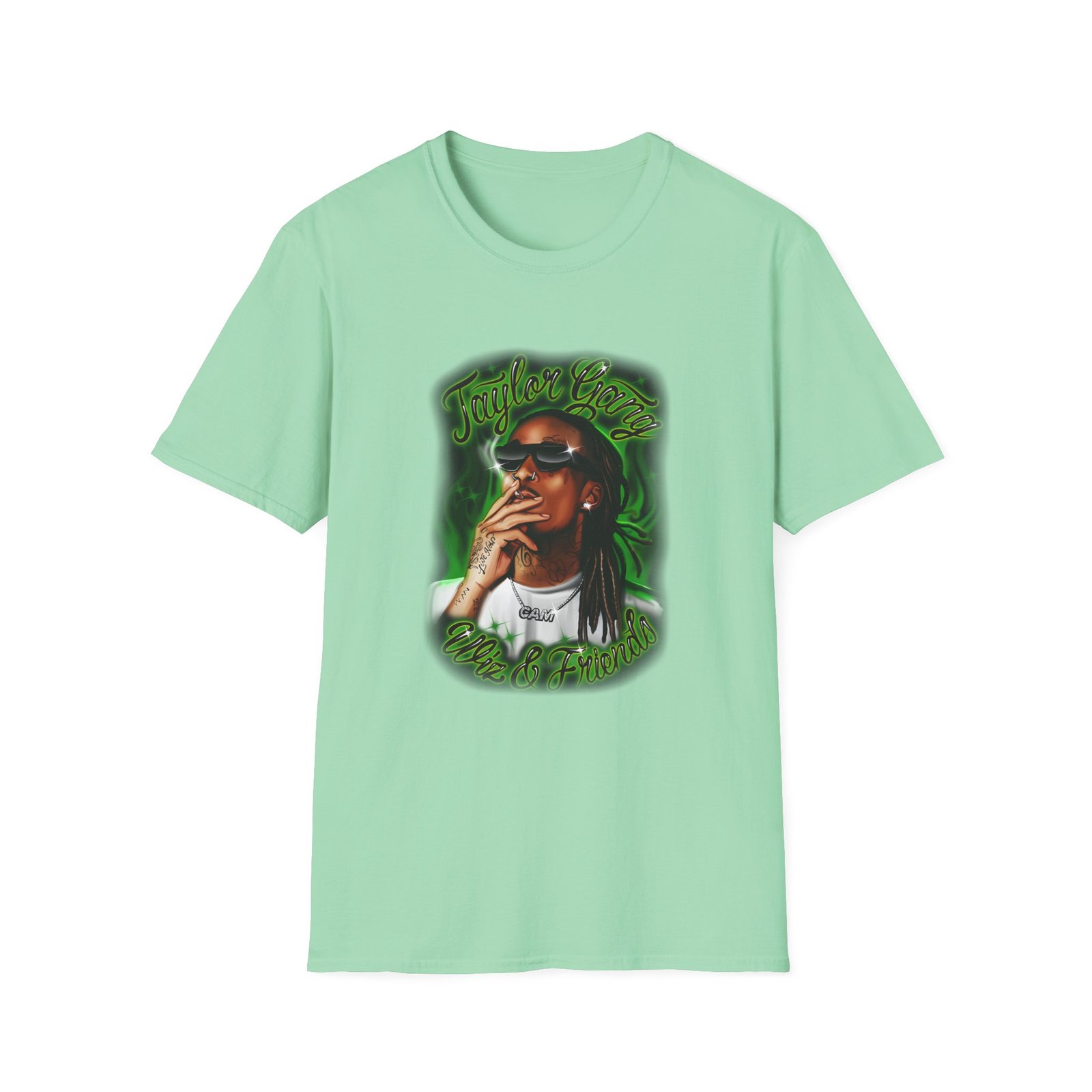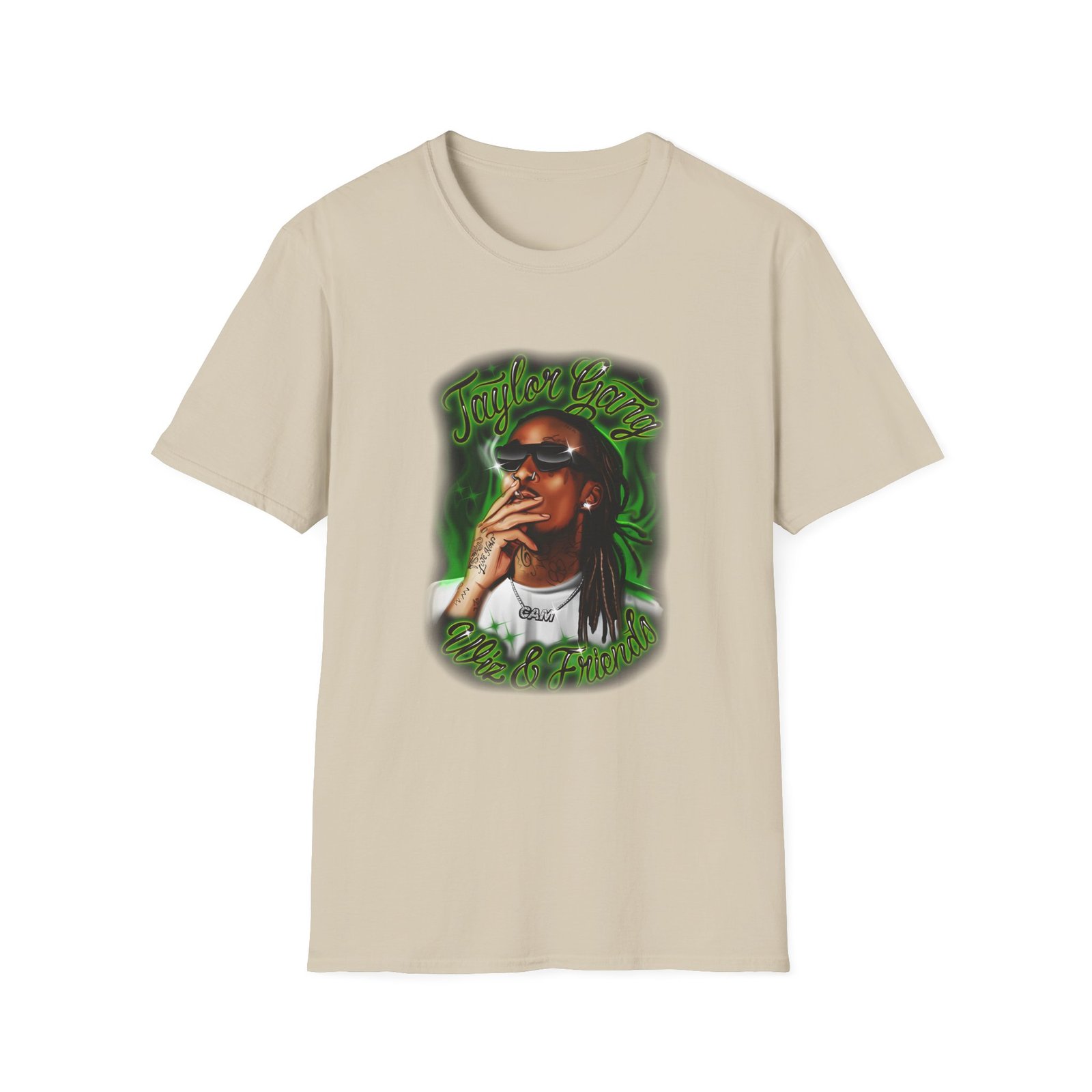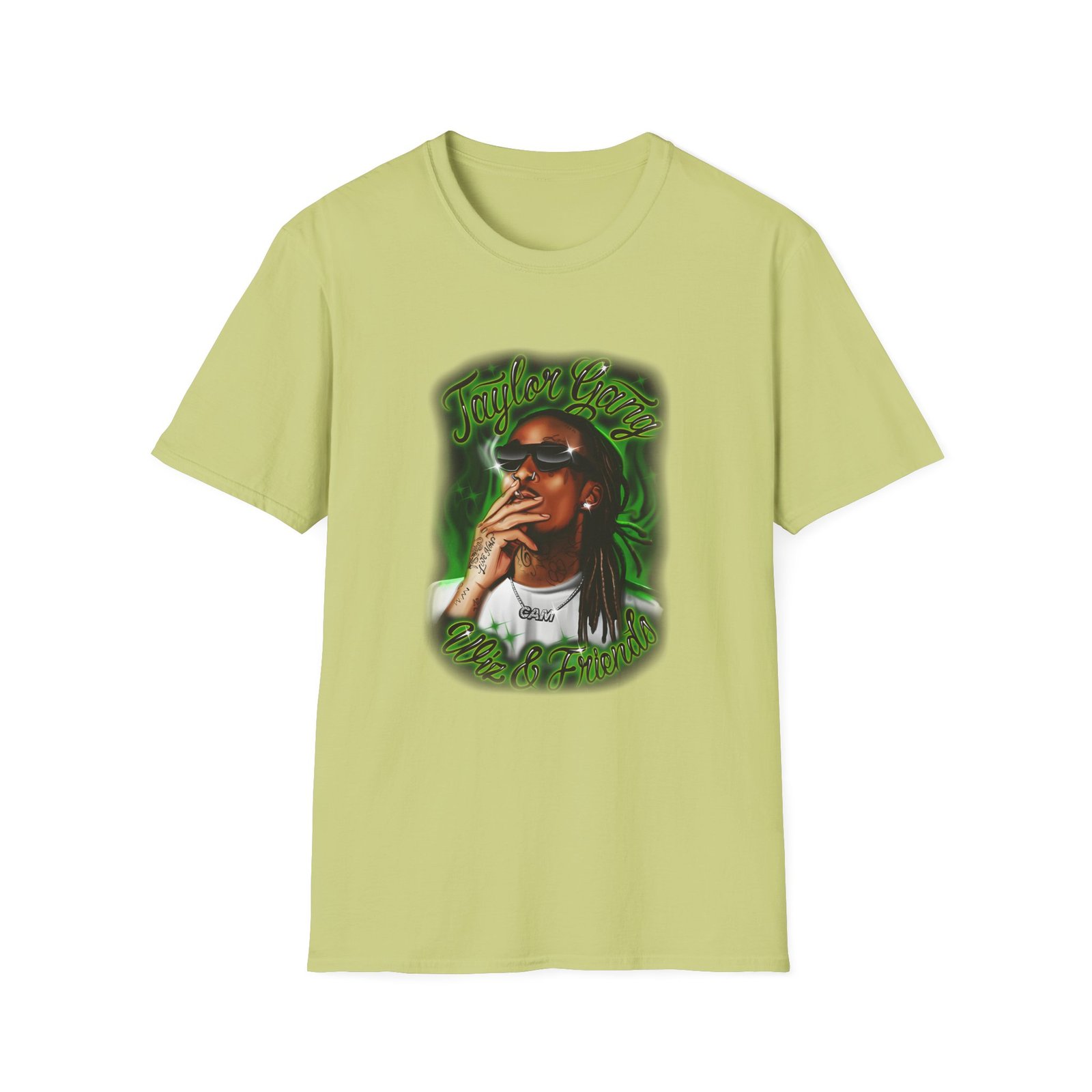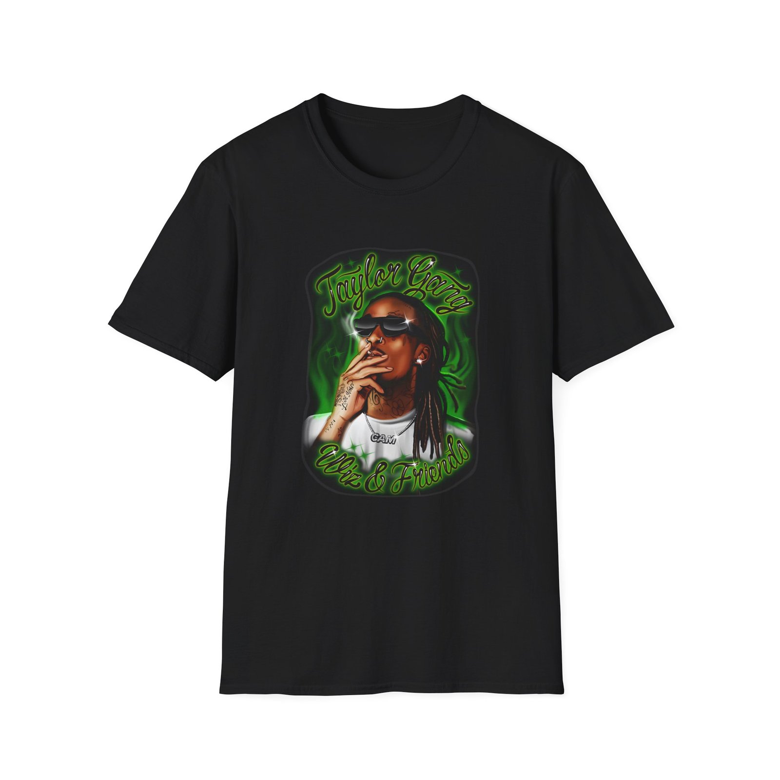 The Wiz Khalifa Airbrush unisex soft-style t-shirt puts a new spin on casual comfort. Made from very soft materials, this tee is 100% cotton for solid colors. Heather colors and sports grey include polyester. The shoulders have twill tape for improved durability. There are no side seams. The collar is made with ribbed knitting to prevent curling damage.